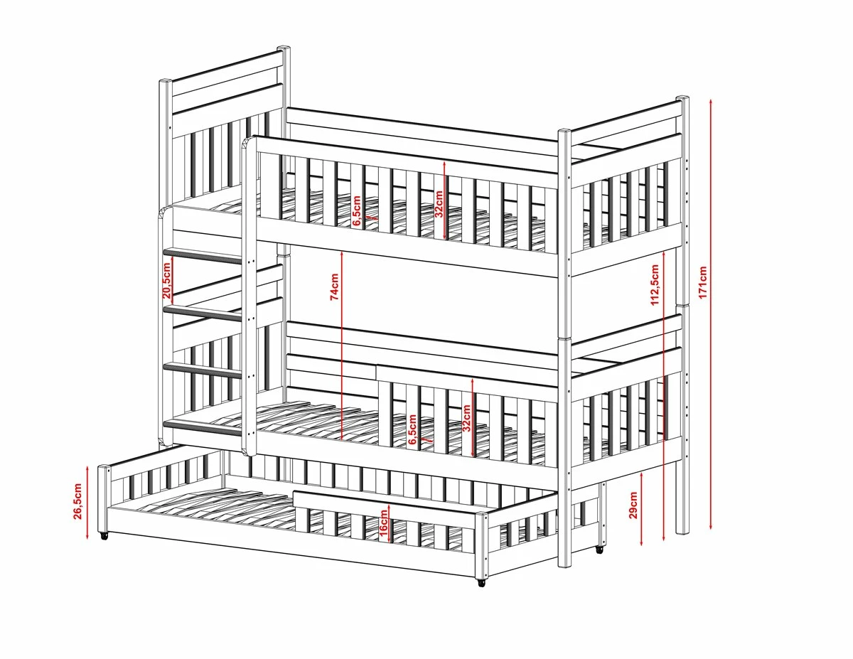 Litera de Oliwia – una cama para tareas especiales¿Tiene tres hijos que comparten una habitación para niños? ¿Está buscando soluciones prácticas? Entonces tenemos lo que estás buscando. Nuestra litera Oliwia combina dos soluciones, gracias a las cuales tres niños pueden acomodarla. La cama hermano Oliwia es una litera con una tercera cama deslizante oculta e independiente en la parte inferior.La seguridad y la comodidad son la principal prioridad en la litera de Oliwia
