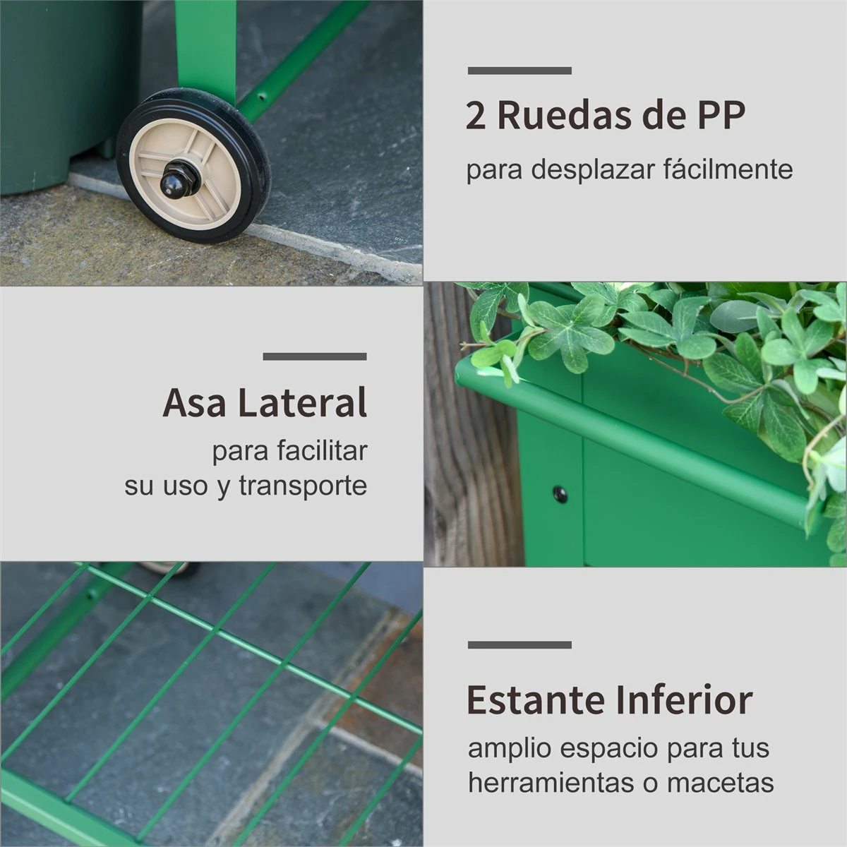 ¿Te aquejas de dolor de espalda y te encantas las plantas? Entonces esta jardinera elevada de Outsunny con ruedas es ideal para ti. Decorativa y a la vez pensada para facilitar su uso y transporte. Es ideal para evitar malas posturas. Tiene un estante inferior para poder tener todas las herramientas a mano y ruedas y un asa lateral para mover sin esfuerzo. Y no debes preocuparte por el exceso de agua y transpirabilidad de tus plantas ya que tiene un orificio de drenaje en la parte inferior. Características – Jardinera elevada que evita malas posturas y proporciona mayor comodidad de uso – Mesa de cultivo con amplio espacio para tener tus plantas, flores, etc. – Estructura de metal resistente y estable – Ideal para usar en patio, terraza, jardín y más – Con 2 ruedas y asa lateral, para mover con facilidad – Orificio para drenar el exceso de agua – Estante inferior para colocar herramientas, macetas, etc. – Se requiere montaje Especificaciones – Color: verde – Material: metal y PP – Medidas totales: 104x39x80 cm (LxANxAL – Medidas interiores de la jardinera: 95x35x20 cm (LxANxAL – Medidas del estante inferior: 94×34 cm (LxAN – Altura del estante inferior al suelo: 20 cm – Capacidad máxima de carga: 50 kg (total y 15 kg (estante inferior – Referencia: 845-384GN