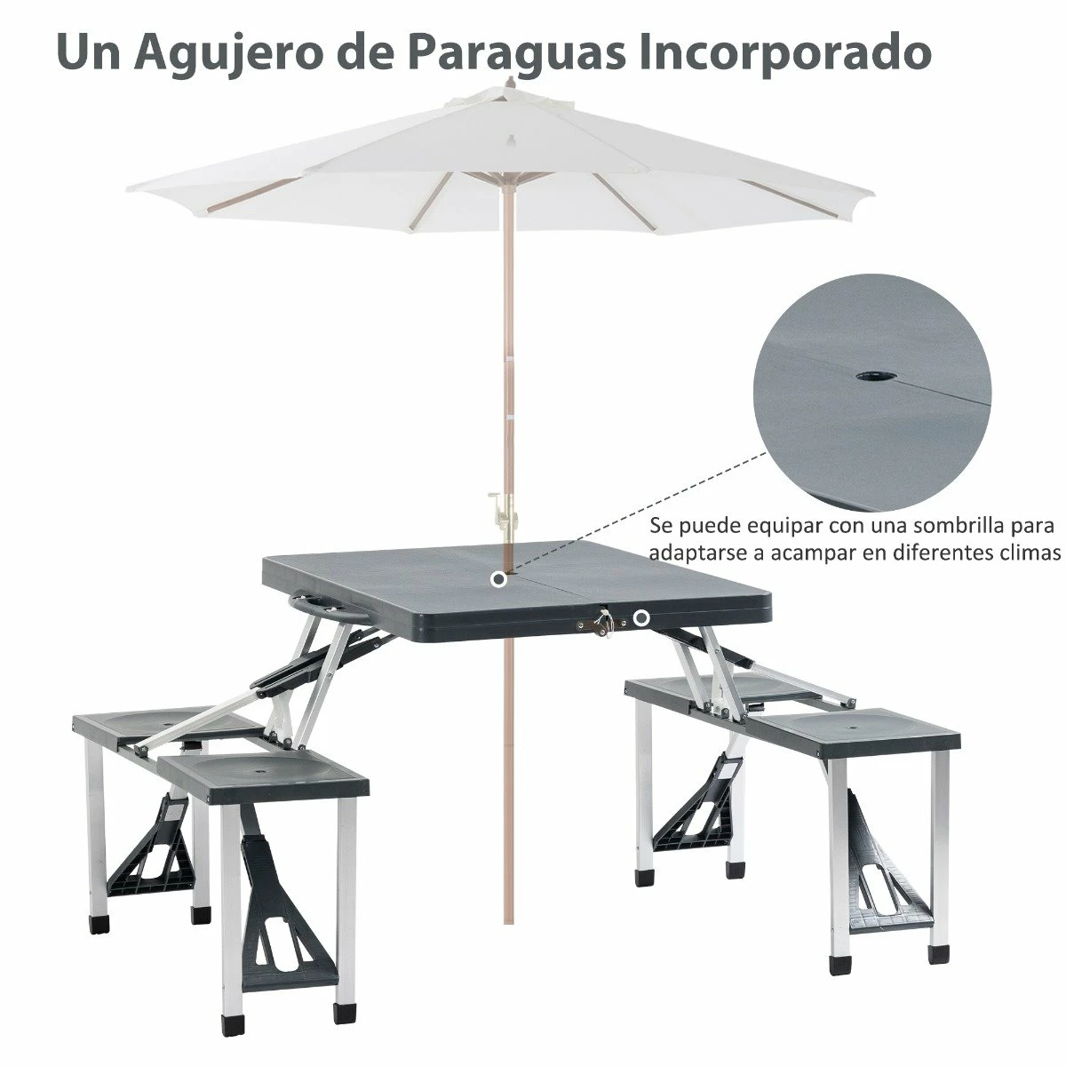 ¿Necesitas una práctica mesa con sillas para llevártela al aire libre? Te presentamos esta fantástica mesa de camping con 4 asientos integrados y estructura plegable en forma de maleta. Es ligera y muy fácil de transportar, por lo que es ideal para llevártela contigo en el camping, en la playa, de picnic, etc. Está hecha de aluminio de alta calidad y es muy estable. Cuenta con un agujero en el centro para que puedas meter la sombrilla en el centro de la mesa y protegerte del caluroso sol. Gracias a esta mesa de camping podrás pasar un tiempo muy agradable y divertido con amigos y familiares.