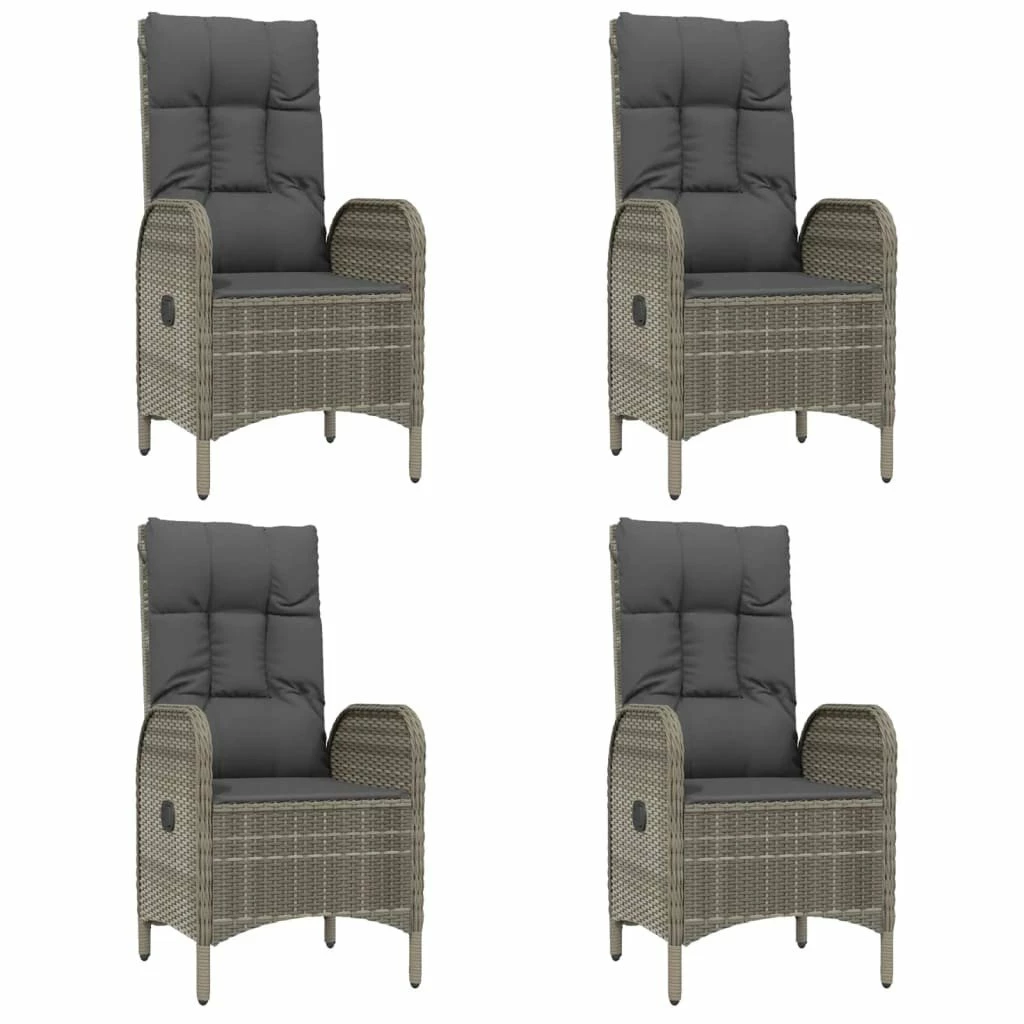 Este moderno juego de comedor de jardín, con un diseño elegante y contemporáneo, es una excelente opción para comer o relajarse en el jardín. Material resistente a la intemperie: El ratán PE, también conocido como ratán sintético, es resistente a la intemperie y fácil de limpiar. La parte exterior se mantiene hermosa durante mucho tiempo. Ofrece una gran calidad, comodidad y aspecto estético.Estructura robusta: Las estructuras de acero con recubrimiento en polvo hacen que el juego de comedor para exterior sea resistente y estable para usar a diario al aire libre.Superficie práctica: La superficie de madera maciza de acacia es perfecta para colocar bebidas, comida y adornos. Es bonita y fácil de limpiar.Función reclinable: Las sillas de jardín está especialmente diseñadas con una función reclinable para que puedas ajustar el respaldo según tu comodidad.Cómodo asiento: El respaldo añade un plus de comodidad al asiento de la silla de jardín. Además, los cojines gruesos y acolchados proporcionan comodidad al asiento. Información útil:Para facilitar al máximo el montaje, cada producto se entrega con un manual. Nota:Para asegurarte de que tus muebles de exterior se mantengan hermosos, recomendamos protegerlos con una funda impermeable. Color: GrisColor de cojín: Gris oscuroSilla reclinable de jardín:Material: Ratán PE, acero con recubrimiento en polvoMaterial de la funda del cojín: Tela (100% poliésterDimensiones: 57 x 62,5 x 109 cm (ancho x profundo x altoDimensiones del asiento: 50 x 47 cm (ancho x profundoAltura del asiento desde el suelo: 43 cmAltura del reposabrazos desde el suelo: 62 cmDimensiones del cojín de respaldo: 50 x 68 x 10 cm (ancho x profundo x grosorDimensiones del cojín de asiento: 50 x 47 x 3 cm (ancho x profundo x grosorRespaldo ajustableSilla reclinable de jardín:Dimensiones: 57 x 62,5 x 109 cm (ancho x profundo x altoDimensiones del cojín de asiento: 50 x 82 x 3 cm (ancho x profundo x grosorReposapiés y respaldo ajustablesMesa:Material: Ratán PE, acero con recubrimiento en polvo, madera maciza de acacia con acabado de aceiteDimensiones: 150 x 90 x 75 cm (ancho x profundo x altoLa entrega incluye:6 x Sillas reclinables de jardín6 x Cojines de respaldo6 x Cojines de asiento1 x Mesa