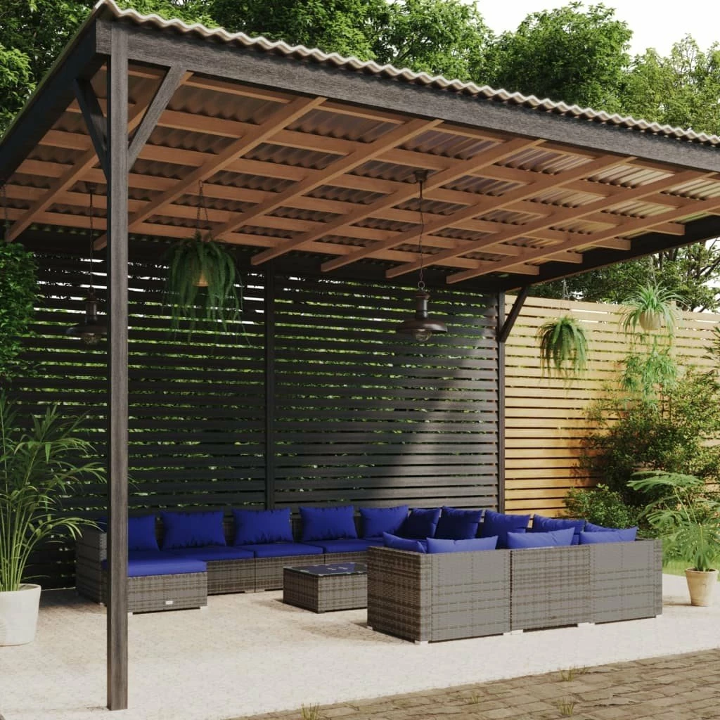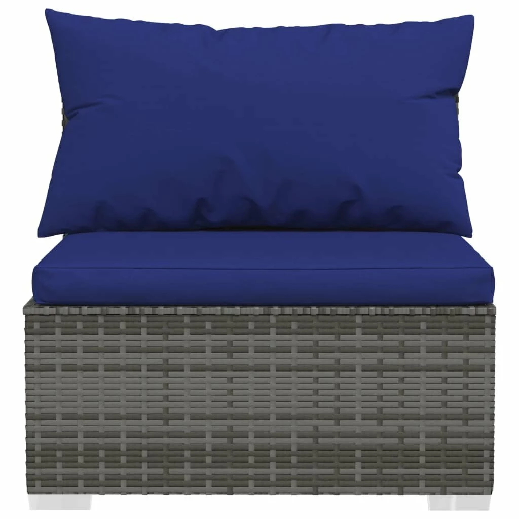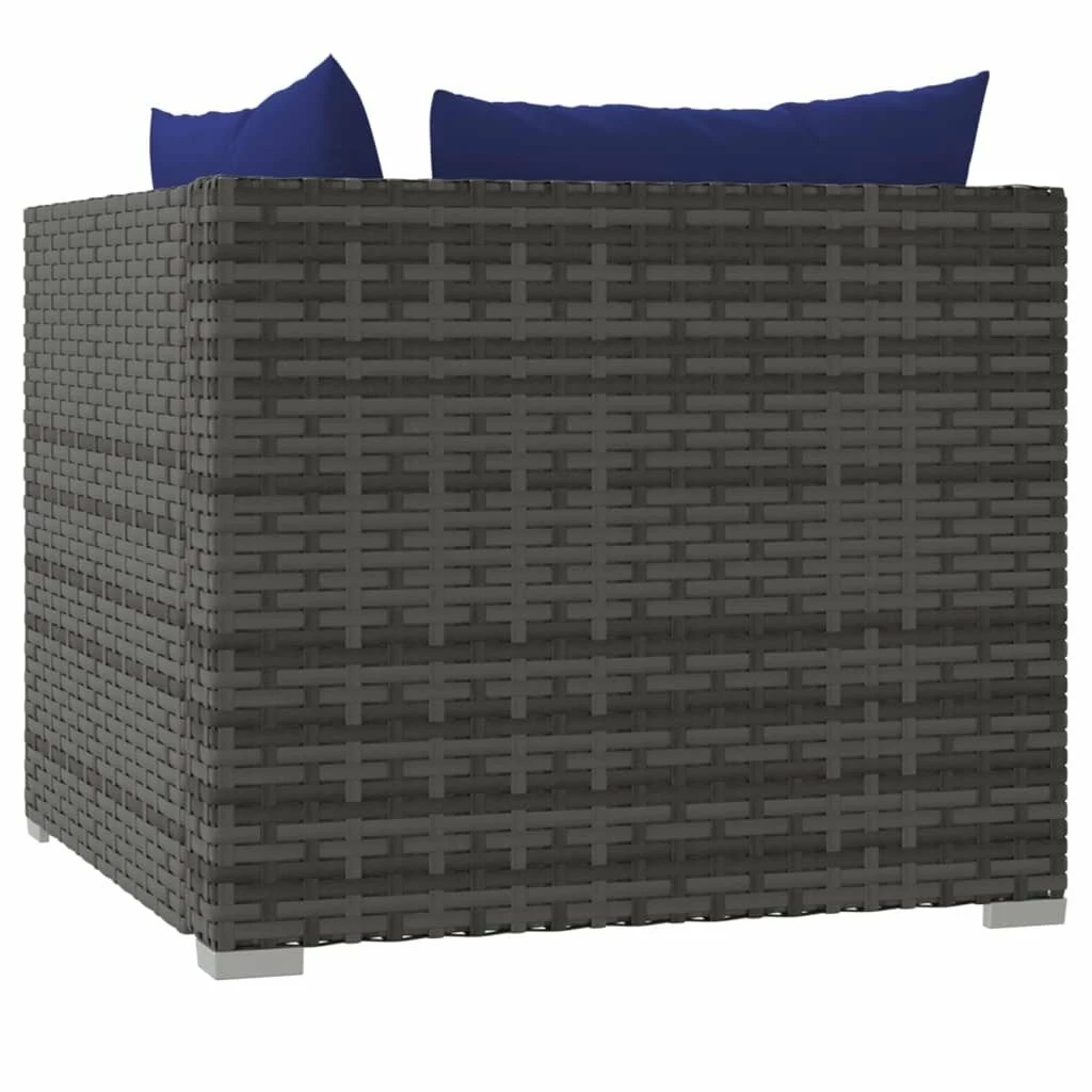 ¡Relájate y disfruta del espacio al aire libre con tu familia y amigos en nuestro clásico juego de muebles de jardín de ratán sintético con cojines! Material de primera calidad: El juego de muebles para patio está diseñado con ratán PE resistente a la intemperie y al agua, por lo que es fácil de limpiar, resistente y adecuado para usar a diario al aire libre.Estructura robusta: Este juego de muebles para exteriores está hecho con una robusta estructura de acero con recubrimiento en polvo y patas de plástico cromado que proporcionan durabilidad.Cojines cómodos: Los cojines gruesamente acolchados y extraíbles están hechos de tela, son suaves al tacto y te brindan un plus de comodidad.Diseño modular: Este juego de muebles de ratán es modular y ligero. También es flexible para colocar el conjunto en cualquier disposición o combinarlo con otros segmentos modulares con el fin de satisfacer tus necesidades. Nota:Para prolongar la vida de tus muebles de exterior, te recomendamos que los protejas con una funda impermeable. Color del ratán sintético: GrisColor del cojín: Azul oscuroMaterial: Ratán PE, acero con recubrimiento en polvo, plástico, vidrioMaterial del cojín/almohadón: Tela (100% poliésterDimensiones de cada sofá: 70 x 70 x 60,5 cm (largo x ancho x altoDimensiones del reposapies: 70 x 70 x 30 cm (largo x ancho x altoDimensiones de la mesa: 60 x 60 x 30 cm (largo x ancho x altoProfundidad del asiento: 63 cmAltura del asiento desde el suelo: 30 cmGrosor del cojín del asiento: 6 cmDimensiones de la almohada de respaldo: 70/63/53/ x 40,5 cm (largo x anchoRequiere montaje: SíLa entrega contiene:4 x Sofás de esquina7 x Sofás centrales1 x Reposapiés1 x Mesa12 x Cojines de asiento15 x Almohadas de respaldo