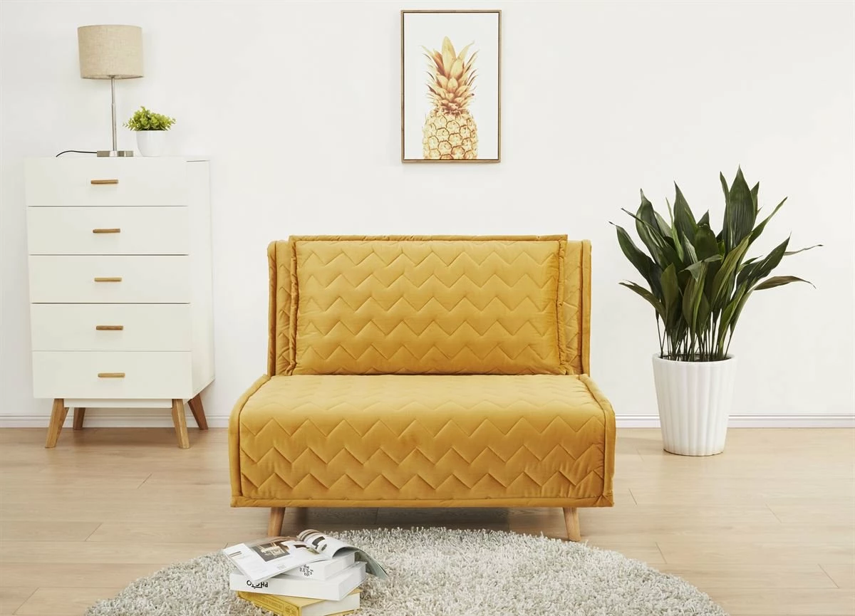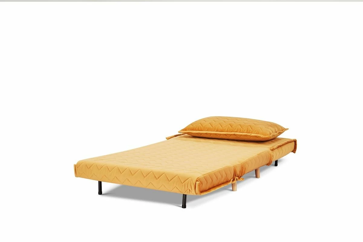 Un diseño de inspiración retro, tapizado en color amarillo, para un resultado tan primaveral como práctico. Sillón convertible en cama de 108×190 cm.