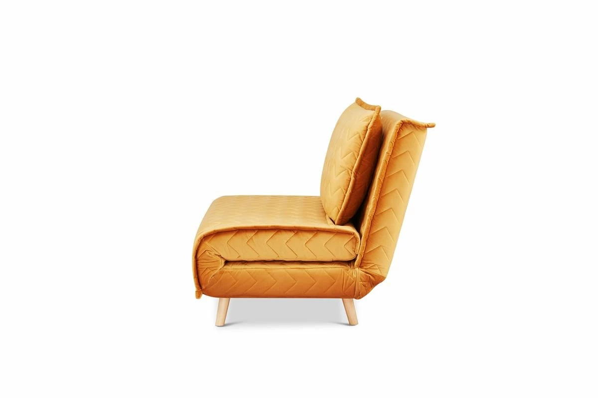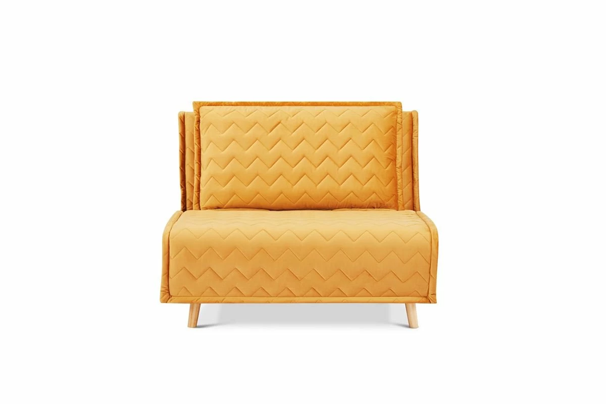 Un diseño de inspiración retro, tapizado en color amarillo, para un resultado tan primaveral como práctico. Sillón convertible en cama de 108×190 cm. Su revestimiento es en tela 100% polyester. Estructura de madera maciza y madera contrachapada. Suspensión: Muelles Zig-Zag. Densidad de espuma en asientos 12 kg/m3 y patas de madera.