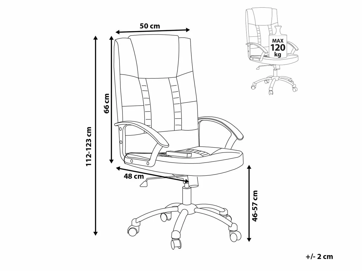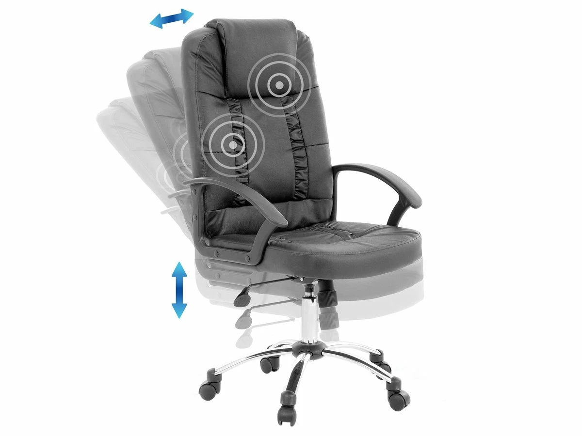 Sillón de descanso. Añade comodidad a tu zona de descanso con esta silla de masaje. Está fabricada a partir de piel sintética de alta calidad y suave al tacto. El mecanismo reclinable elimina la presión en la columna vertebral. Los reposabrazos y el reposacabezas ajustado ayudan a liberar la tensión en los hombros y en la nuca. El mando a distancia permite elegir entre 9 configuraciones y 3 modos de intensidad de masaje. Los 4 puntos de vibración están situados en la zona lumbar y en la parte superior de la espalda. Detalles: Tipo de Producto: Silla de oficina Estilo: Moderno Color: Negro Tipo de material: Piel sintética Material principal: Piel sintética Material de las patas: Metal Material del asiento: Piel sintética Funciones adicionales: Función de masaje Apoyabrazo: Sí Reposapies: No Reclinable: No Dimensiones: Altura del apoyabrazos: 74/85 cm Profundidad: 60 cm Altura del asiento: 46-57 cm Ancho: 64 cm Altura: 112-123 cm Superficie del asiento: 52×48 cm Peso: 15 kg Capacidad de peso: 120 kg La oferta incluye: 1 x Sillón con función de masaje Ventajas: Mecanismo de inclinación para el mejor ajuste, 9 Programas, 3 niveles de intensidad de masaje, Ruedas de nylon, Giratoria 360°, Altura del asiento ajustable por sistema neumático, Anchos repozabrazos y respaldo acogedor, Brinda sensaciones de relax Información de montaje: Requiere montaje completo. 20-40 min. Información adicional: Para una mayor estabilidad y seguridad de uso, se recomienda verificar 2 semanas después de la instalación que el montaje del producto ha sido realizado de forma correcta. Revisa, al menos una vez cada 3 meses, que los tornillos estén bien apretados. Consejos de mantenimiento: Piel sintética: 1.Limpie con agua destilada y use limpiadores a base de jabón en las manchas difíciles 2.Aspire con un accesorio adecuado 3.Una vez a la semana, limpie con un paño húmedo y seque después. No engrasar, 4.Use solo limpiadores suaves y acondicionadores dedicados a la piel sintética Metal: 1.Para elementos de cobre o cromados, use agente abrillantador 2.Para evitar arañazos, no use limpiadores abrasivos 3.Limpie con un limpiador y un paño suave, seque después.