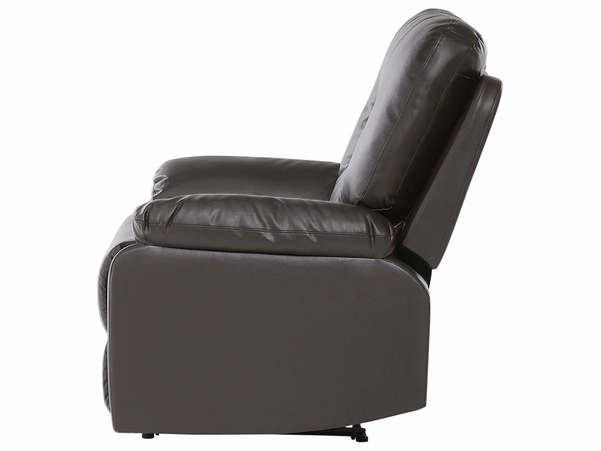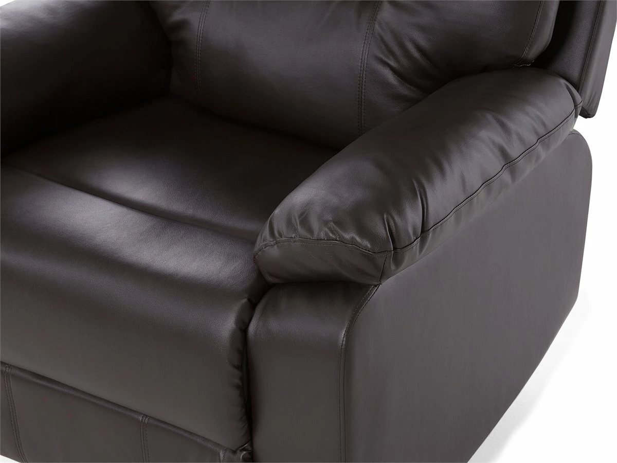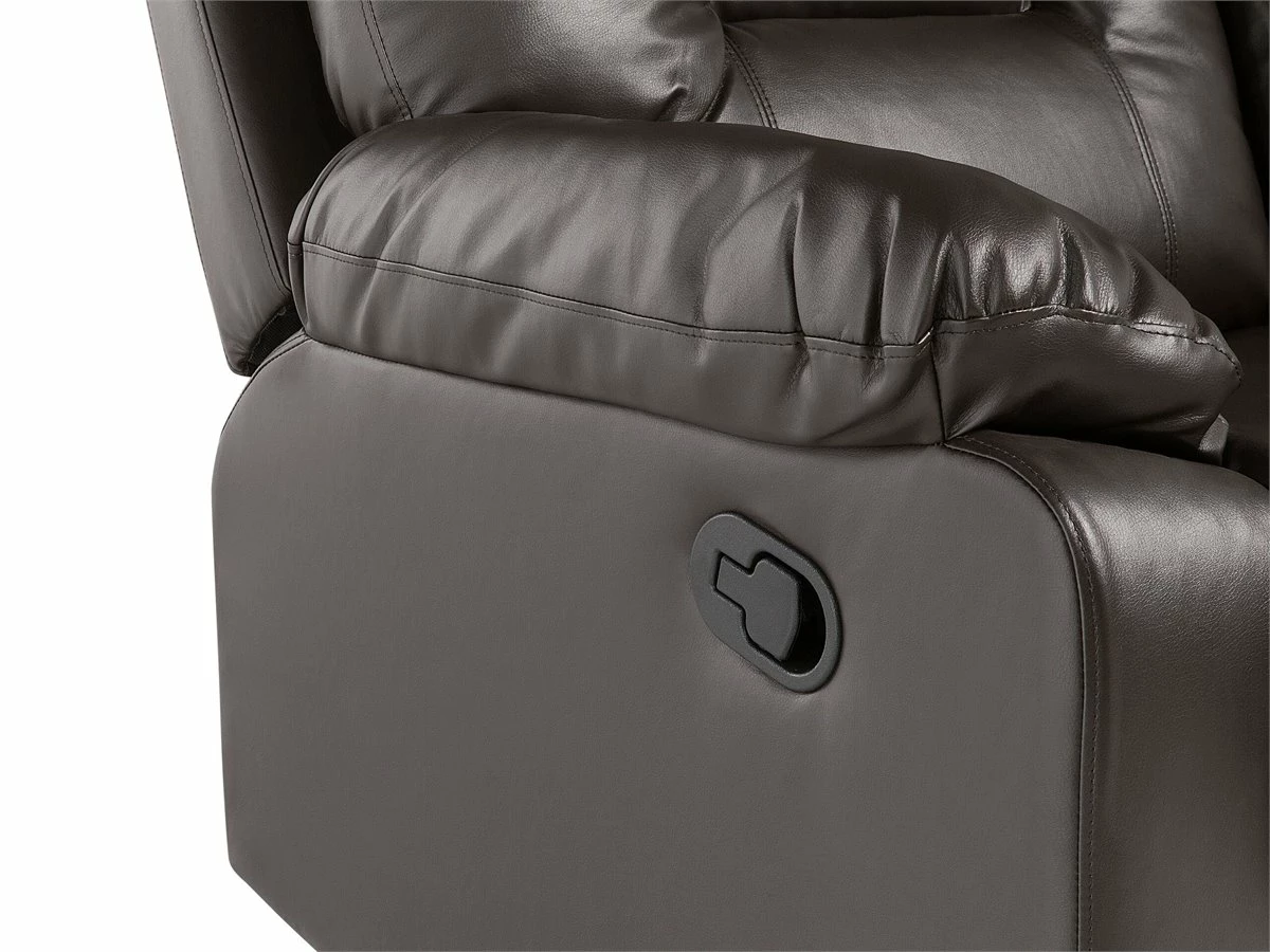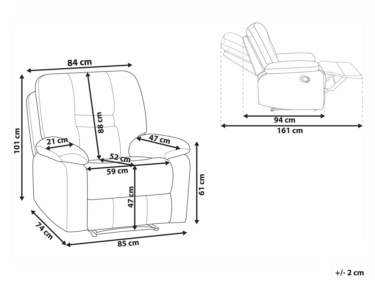 Sillón con reclinación manual. Añade comodidad a tu sala de estar con este sillón reclinable. Está fabricado a partir de piel sintética de alta calidad y suave al tacto. Los reposabrazos amplios y el respaldo alto ofrecen el máximo confort. El reposapiés transforma el sillón en un lugar cómodo para acostarse. Detalles: Tipo de Producto: Sillón reclinable Estilo: Moderno Color: Blanco Tipo de material: Piel sintética Material principal: Piel sintética Material adicional: Acero Material del relleno: Espuma Material de las patas: Acero Material del asiento: Piel sintética Composición del Material: 100% Piel ecológica Estilo del apoyabrazo: Con cojín Apoyabrazo: Sí Protectores para patas: Sí Diseño: Sólido Reclinable: Sí Construcción del asiento: Muelles de bolsillo Densidad de espuma del asiento: 28 kg/m3 Dimensiones: Altura del apoyabrazos: 61 cm Profundidad: 74 cm Altura del asiento: 47 cm Ancho: 85 cm Altura: 101 cm Superficie del asiento: 51×52 cm Peso: 40 kg Capacidad de peso: 135 kg La oferta incluye: 1 x Sillón Ventajas: Reposapiés y brazos ajustables, Brinda sensaciones de relax, Asiento bajo y profundo, Diseño clásico, Alta calidad, Totalmente reclinable a la posición horizontal, Completamente tapizado Información de montaje: Requiere montaje parcial. 5-15 min. Información adicional: Para un uso seguro, debe haber un espacio de ~15 cm entre el respaldo y la pared. Para una mayor estabilidad y seguridad de uso, se recomienda verificar 2 semanas después de la instalación que el montaje del producto ha sido realizado de forma correcta. Revisa, al menos una vez cada 3 meses, que los tornillos estén bien apretados. Consejos de mantenimiento: Piel sintética: 1.Use solo limpiadores suaves y acondicionadores dedicados a la piel sintética, 2.Limpie con agua destilada y use limpiadores a base de jabón en las manchas difíciles 3.Aspire con un accesorio adecuado 4.Una vez a la semana, limpie con un paño húmedo y seque después. No engrasar Acero: 1.Para elementos de cobre o cromados, use agente abrillantador 2.Para evitar arañazos, no use limpiadores abrasivos 3.Limpie con un limpiador y un paño suave, seque después.