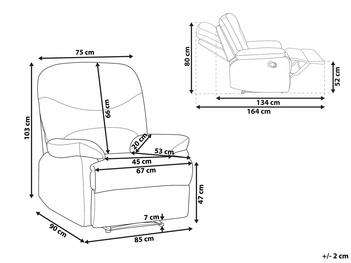 Sillón de descanso. Añade comodidad a tu sala de estar con este sillón reclinable. Está fabricado a partir de tela de terciopelo de alta calidad y suave al tacto. El reposapiés incorporado ofrece comodidad adicional. Los reposabrazos acolchados y el respaldo con capitoné combinan bien en cualquier interior moderno o contemporáneo. Detalles: Tipo de Producto: Sillón Estilo: Industrial Color: Beige Tipo de material: Poliéster aterciopelado Material principal: Terciopelo Material adicional: Metal Material del relleno: Espuma Material de las patas: Metal Material del asiento: Tejido Composición del Material: 100% Poliéster Estilo del apoyabrazo: Con cojín Apoyabrazo: Sí Protectores para patas: No Diseño: Sólido Reclinable: Sí Construcción del asiento: Madera contrachapada Densidad de espuma del asiento: 28 kg/m3 Dimensiones: Altura del apoyabrazos: 60 cm Profundidad: 90 cm Altura del asiento: 47 cm Ancho: 85 cm Altura: 103 cm Superficie del asiento: 53×45 cm Peso: 28 kg Capacidad de peso: 200 kg La oferta incluye: 1 x Sillón Ventajas: Reposapiés y brazos ajustables, Brinda sensaciones de relax, Muy cómodo, Cómodos apoyabrazos, Estilo retro, Acolchado de alta calidad Información de montaje: Requiere montaje completo. 5-15 min. Información adicional: Para una mayor estabilidad y seguridad de uso, se recomienda verificar 2 semanas después de la instalación que el montaje del producto ha sido realizado de forma correcta. Revisa, al menos una vez cada 3 meses, que los tornillos estén bien apretados. Ten en cuenta que la tela de terciopelo puede presentar un aspecto distinto según la iluminación a la que esté expuesta: tiende a brillar más a la luz del día y a parecer más tenue con luz artificial en interiores. Debido a la estructura suave de alta densidad, la tonalidad puede verse modificada haciendo pasar la mano en distintas direcciones y ángulos. Para igualar el color y eliminar las arrugas, el material debe limpiarse con la palma de mano abierta en una dirección, con un paño húmedo o una plancha con vapor. Consejos de mantenimiento: Terciopelo: 1.Aspire con un accesorio adecuado 2.Limpiar con champú seco y una esponja húmeda o un limpiador suave.