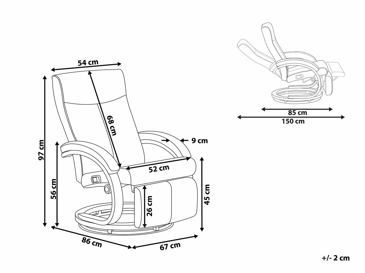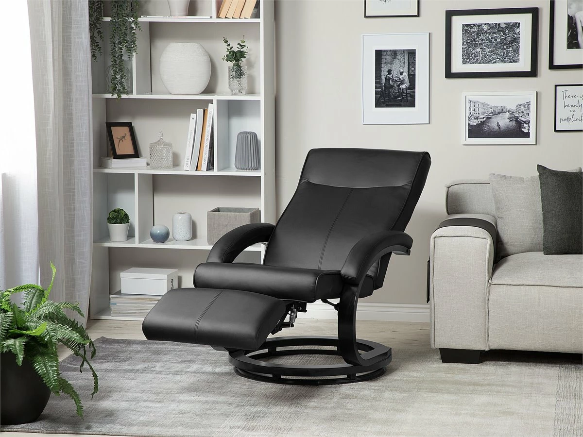 Cómodo sillón con un práctico reposapiés. Añade elegancia y funcionalidad a tu interior con este sillón reclinable. Está fabricado a partir de piel sintética de alta calidad, suave al tacto y de bajo mantenimiento. El respaldo y el reposapiés ajustable ofrecen la máxima comodidad. Detalles: Tipo de Producto: Sillón reclinable Estilo: Moderno Color: Negro Tipo de material: Piel sintética Material principal: Piel sintética Material adicional: Madera Material del relleno: Espuma Material de las patas: Madera maciza Material del asiento: Piel sintética Composición del Material: 100% Piel ecológica Estilo del apoyabrazo: Con cojín Apoyabrazo: Sí Protectores para patas: No Diseño: Sólido Reclinable: Sí Dimensiones: Altura del apoyabrazos: 56 cm Profundidad: 86 cm Altura del asiento: 45 cm Ancho: 67 cm Altura: 97 cm Superficie del asiento: 51×53 cm Peso: 26 kg Capacidad de peso: 130 kg La oferta incluye: 1 x Sillón Ventajas: Reposapiés y brazos ajustables, Forma ergonómica, Diseño atemporal, Acolchado de alta calidad, Durable y robusto Información de montaje: Requiere montaje parcial. 20-40 min. Información adicional: Para una mayor estabilidad y seguridad de uso, se recomienda verificar 2 semanas después de la instalación que el montaje del producto ha sido realizado de forma correcta. Revisa, al menos una vez cada 3 meses, que los tornillos estén bien apretados. Consejos de mantenimiento: Piel sintética: 1.Use solo limpiadores suaves y acondicionadores dedicados a la piel sintética, 2.Limpie con agua destilada y use limpiadores a base de jabón en las manchas difíciles 3.Aspire con un accesorio adecuado 4.Una vez a la semana, limpie con un paño húmedo y seque después. No engrasar Madera: 1.Seque inmediatamente después de limpiar. para evitar que se acumule agua en los muebles 2.Limpie con un limpiador y un paño suave en la dirección del grano 3.Los muebles con acabado de aceite deben engrasarse una vez al año