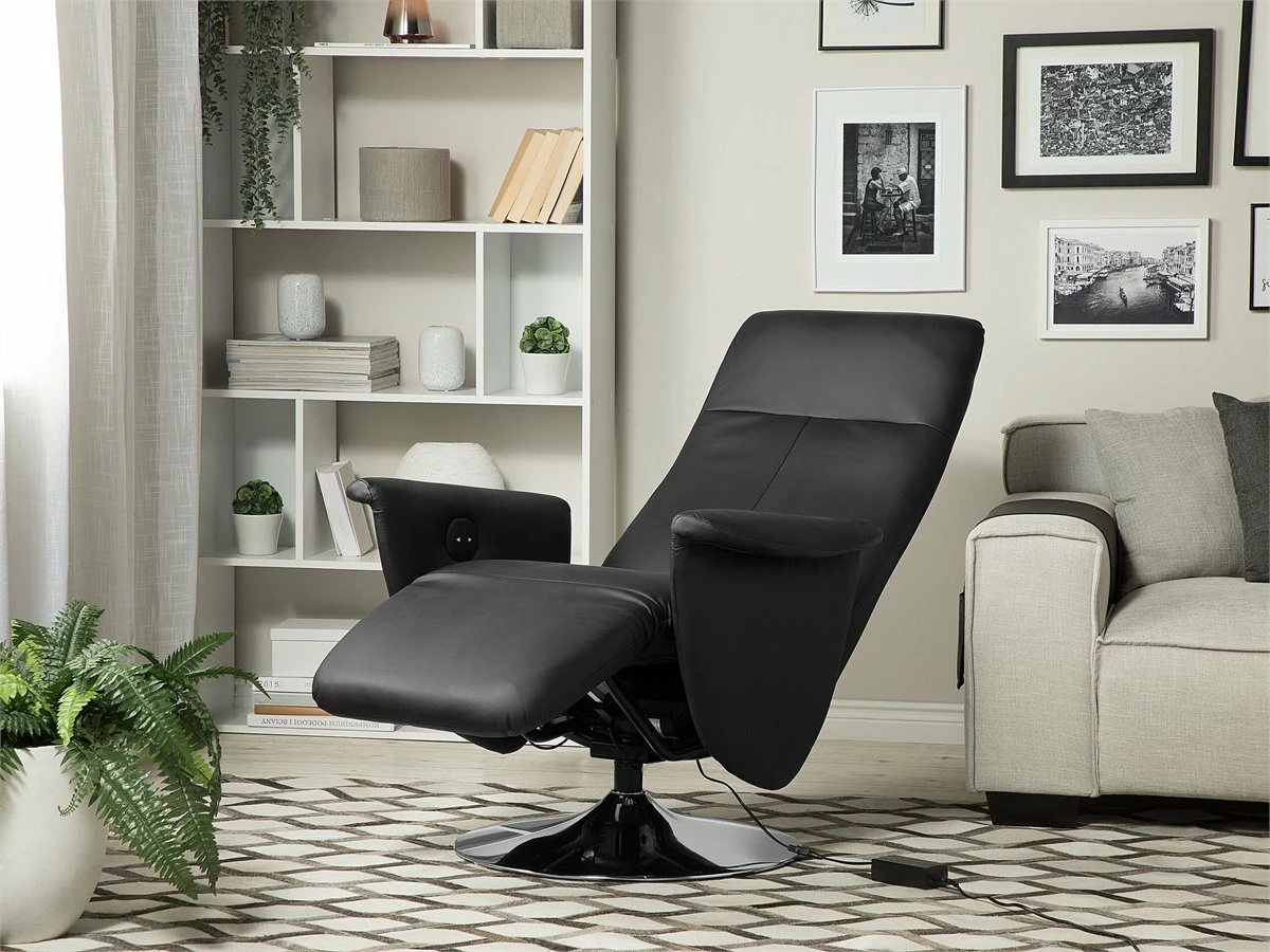 Elegante y cómodo sillón en negro. Añade elegancia y comodidad a tu sala de estar con este sillón reclinable. Está fabricado a partir de piel sintética de alta calidad y suave al tacto. El respaldo alto y el reposapiés ofrecen la máxima comodidad. Ideal para ver la TV después de una larga jornada de trabajo. Detalles: Tipo de Producto: Sillón reclinable Estilo: Moderno Color: Negro Tipo de material: Piel sintética Material principal: Piel sintética Material adicional: Metal Material del relleno: Espuma Material de las patas: Metal Material del asiento: Piel sintética Composición del Material: 100% Piel ecológica Estilo del apoyabrazo: Diagonal Apoyabrazo: Sí Protectores para patas: No Diseño: Sólido Reclinable: Sí Densidad de espuma del asiento: 24 kg/m3 Dimensiones: Altura del apoyabrazos: 72 cm Profundidad: 49 cm Espesor del asiento: 6 cm Altura del asiento: 48 cm Ancho: 82 cm Altura: 110 cm Superficie del asiento: 51×49 cm Peso: 28 kg Capacidad de peso: 130 kg La oferta incluye: 1 x Sillón Ventajas: Giratoria 360°, Brinda sensaciones de relax, Respaldo acogedor y reclinable, Diseño moderno, Tapicería de piel sintética de alta calidad para un aspecto natural, Materiales de la más alta calidad Información de montaje: Requiere montaje parcial. 20-40 min. Información adicional: Para una mayor estabilidad y seguridad de uso, se recomienda verificar 2 semanas después de la instalación que el montaje del producto ha sido realizado de forma correcta. Revisa, al menos una vez cada 3 meses, que los tornillos estén bien apretados. Consejos de mantenimiento: Piel sintética: 1.Limpie con agua destilada y use limpiadores a base de jabón en las manchas difíciles 2.Aspire con un accesorio adecuado 3.Una vez a la semana, limpie con un paño húmedo y seque después. No engrasar, 4.Use solo limpiadores suaves y acondicionadores dedicados a la piel sintética Metal: 1.Para evitar arañazos, no use limpiadores abrasivos 2.Limpie con un limpiador y un paño suave, seque después 3.Para elementos de cobre o cromados, use agente abrillantador.