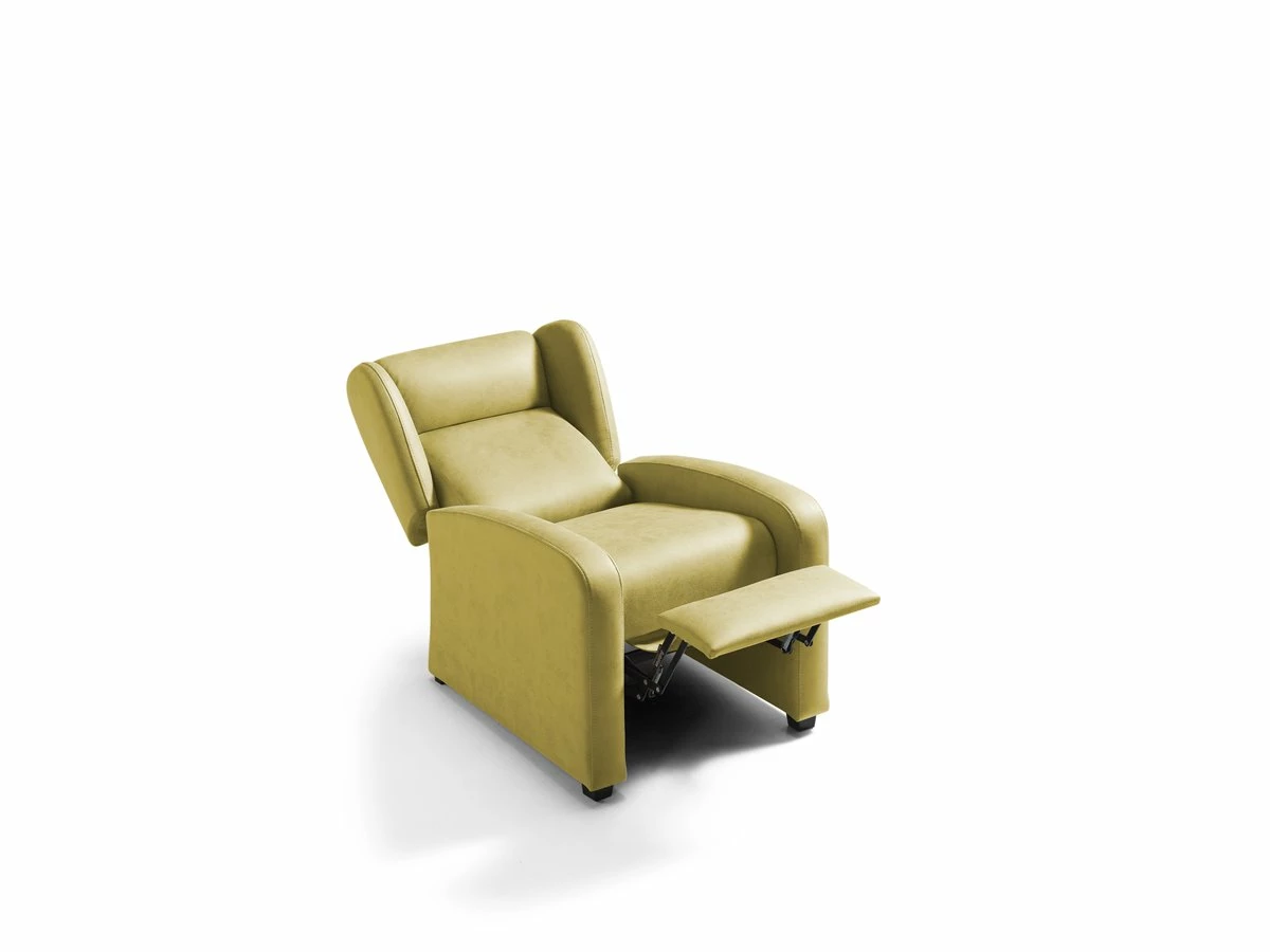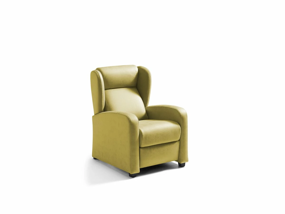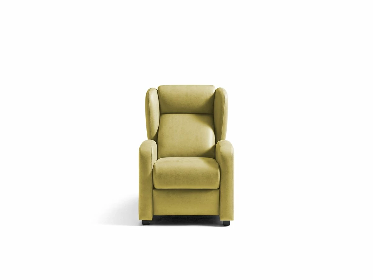 ADA Sillón Relax Manual. Estructura de madera y tablero de partículas. Revestimiento en tela, color mostaza. Patas en PVC, color wengué. Medidas: 72an x 98al x 88 fon cm.