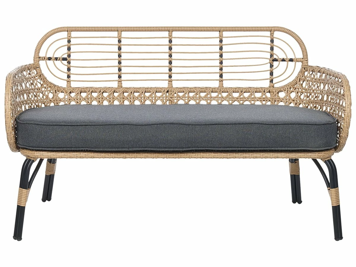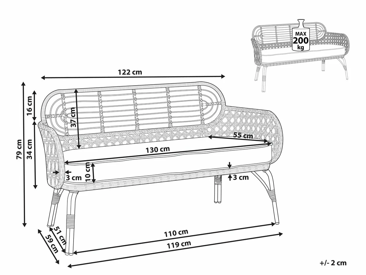 Sofá de exterior. Añade funcionalidad a tu zona exterior con este sofá de 2 plazas. Está fabricado a partir de materiales duraderos y de alta calidad. El respaldo y los reposabrazos de ratán sintético trenzado proporcionan un estilo natural al diseño. El cojín de acolchado grueso garantiza comodidad. La combinación de colores y el diseño inspirado en la naturaleza encajan bien en cualquier estilo de decoración. Detalles: Tipo de Producto: Sofá de jardin Estilo: Boho Color: Natural Tonalidad: Grafito Tipo de material: Ratán sintético Material principal: Ratán sintético Material adicional: Acero Composición del Material: 100% Poliéster Densidad de espuma del asiento: 20 kg/m3 Dimensiones: Altura del apoyabrazos: 65 cm Profundidad: 59 cm Espesor del asiento: 10 cm Altura del asiento: 31 cm Ancho: 122 cm Altura: 79 cm Superficie del asiento: 130x55x10 cm Peso: 13 kg Capacidad de peso: 200 kg La oferta incluye: 1 x Sofá, 1 x Cojín del asiento Ventajas: Ancha superficie del asiento, Crea un ambiente acogedor, Solida estructura, Fabricación sólida y precisa, Cojines extraíbles para un fácil mantenimiento Información de montaje: Requiere montaje parcial. 5-15 min. Texto de resistencia: Gracias a su resistencia al agua, puedes utilizar el producto al aire libre y dejarlo a la intemperie durante lluvias ligeras. Si no es posible guardarlo en un lugar cerrado y protegido, recomendamos utilizar una funda protectora. La exposición prolongada a la humedad puede provocar daños en el mueble. Resistencia: Manchas Consejos de mantenimiento: Ratán sintético: 1.Para alargar la vida útil del mueble, protéjalo de la exposición directa al sol 2.Se recomienda utilizar una funda protectora para la temporada de invierno o, si es posible, para mantener los muebles secos y frescos en el interior 3.Limpiar con detergentes a base de jabón. No utilizar limpiadores químicos corrosivos 4.Los utensilios o accesorios de vidrio pueden sobrecalentar la superficie. Poliéster: 1.No secar en secadora ni planchar 2.Lavar a mano únicamente, usar agua fría y un detergente suave 3.Cuando no esté en uso, manténgalo en un lugar limpio y seco para protegerlo de las condiciones atmosféricas.