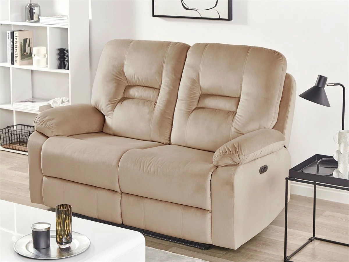 Sofá con reclinación eléctrica. Añade a tu sala de estar este sofá de 2 plazas de diseño moderno y funcional. Está fabricado a partir de tela de terciopelo de alta calidad y suave al tacto. Los reposabrazos amplios y el respaldo alto ofrecen el máximo confort. El reposapiés transforma el sillón en un lugar cómodo para acostarse. La luz LED incorporada proporciona un ambiente agradable durante tus noches de cine. Puedes utilizar el puerto USB para cargar el móvil. Detalles: Tipo de Producto: Sofá reclinable Estilo: Moderno Color: Beige Tonalidad: Arena Tipo de material: Poliéster aterciopelado Material principal: Terciopelo Material adicional: Madera contrachapada Material del relleno: Espuma Composición del Material: 100% Poliéster Forma: Rectangular Partes ajustables: Respaldo Tipo de ajuste: Eléctrico Estilo del apoyabrazo: Con cojín Apoyabrazo: Sí Parte posterior tapizada: Sí Consumo de potencia: 0.21 W Diseño: Sólido Potencia de salida: +29V 2A Construcción del asiento: Muelles de bolsillo Densidad de espuma del asiento: 28 kg/m3 Asientos para: 2 personas Puerto USB: 10 Dimensiones: Altura del apoyabrazos: 61 cm Profundidad: 73 cm Espesor del asiento: 22 cm Altura del asiento: 49 cm Ancho: 146 cm Altura: 101 cm Superficie del asiento: 117×53 cm Peso: 64 kg Capacidad de peso por persona: 135 kg La oferta incluye: 1 x Sofá de 2 plazas Ventajas: Reposapiés y brazos ajustables, Asiento bajo y profundo, Brinda sensaciones de relax, Llamativa iluminación LED que crea un ambiente agradable, Alta calidad, Totalmente reclinable a la posición horizontal, Completamente tapizado Información de montaje: Requiere montaje completo. 20-40 min. Información adicional: Para un uso seguro, debe haber un espacio de ~15 cm entre el respaldo y la pared. Para una mayor estabilidad y seguridad de uso, se recomienda verificar 2 semanas después de la instalación que el montaje del producto ha sido realizado de forma correcta. Revisa, al menos una vez cada 3 meses, que los tornillos estén bien apretados. Consejos de mantenimiento: Terciopelo: 1.Aspire con un accesorio adecuado 2.Limpiar con champú seco y una esponja húmeda o un limpiador suave. Acero: 1.Limpie con un limpiador y un paño suave, seque después 2.Para elementos de cobre o cromados, use agente abrillantador 3.Para evitar arañazos, no use limpiadores abrasivos.