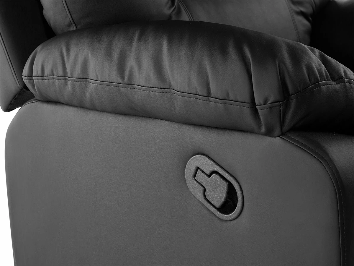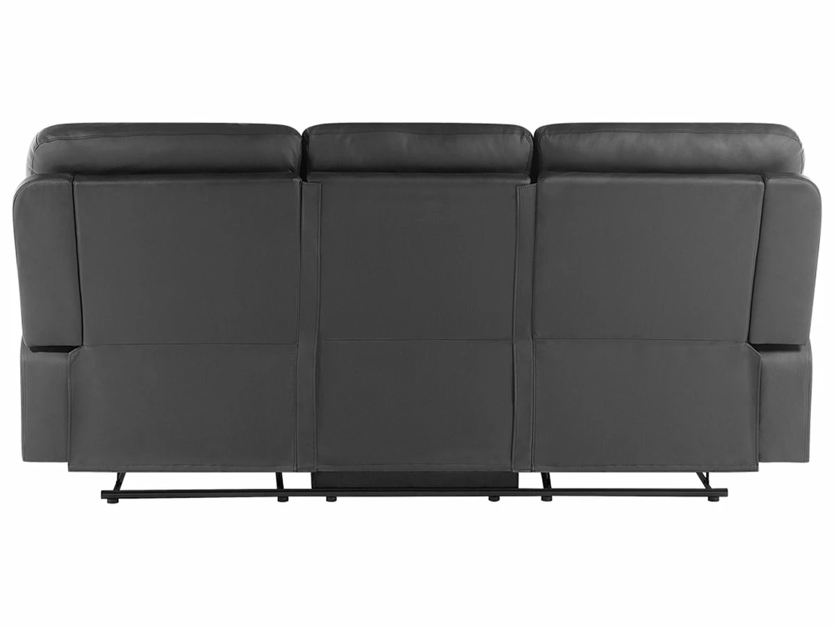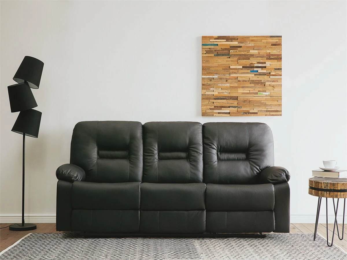 Sofá con reclinación manual. Añade a tu sala de estar este sofá de 3 plazas de diseño moderno y funcional. Está fabricado de metal resistente y estable. Cuenta con un respaldo reclinable y un reposapiés que se regula según el peso corporal. Los asientos acolchados de piel sintética suave al tacto ofrecen soporte y comodidad. Detalles: Tipo de Producto: Sofá reclinable Estilo: Moderno Color: Negro Tipo de material: Piel sintética Material principal: Piel sintética Material adicional: Acero Material del relleno: Espuma Composición del Material: 100% Piel ecológica Estilo del apoyabrazo: Con cojín Apoyabrazo: Sí Parte posterior tapizada: Sí Diseño: Sólido Construcción del asiento: Muelles de bolsillo Densidad de espuma del asiento: 28 kg/m3 Asientos para: 3 personas Dimensiones: Altura del apoyabrazos: 61 cm Profundidad: 73 cm Espesor del asiento: 22 cm Altura del asiento: 49 cm Ancho: 204 cm Altura: 101 cm Superficie del asiento: 169×53 cm Peso: 62 kg Capacidad de peso por persona: 150 kg La oferta incluye: 1 x Sofá de 3 plazas Ventajas: Reposapiés y brazos ajustables, Brinda sensaciones de relax, Asiento bajo y profundo, Diseño clásico, Alta calidad, Totalmente reclinable a la posición horizontal, Completamente tapizado Información de montaje: Requiere montaje parcial. 20-40 min. Información adicional: Para un uso seguro, debe haber un espacio de ~15 cm entre el respaldo y la pared. Consejos de mantenimiento: Piel sintética: 1.Aspire con un accesorio adecuado 2.Una vez a la semana, limpie con un paño húmedo y seque después. No engrasar, 3.Use solo limpiadores suaves y acondicionadores dedicados a la piel sintética, 4.Limpie con agua destilada y use limpiadores a base de jabón en las manchas difíciles.