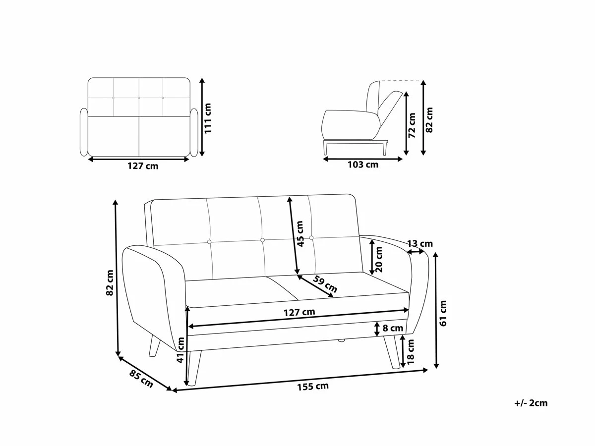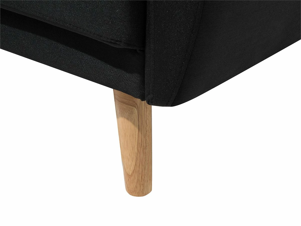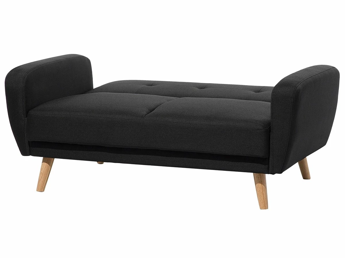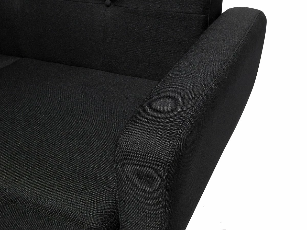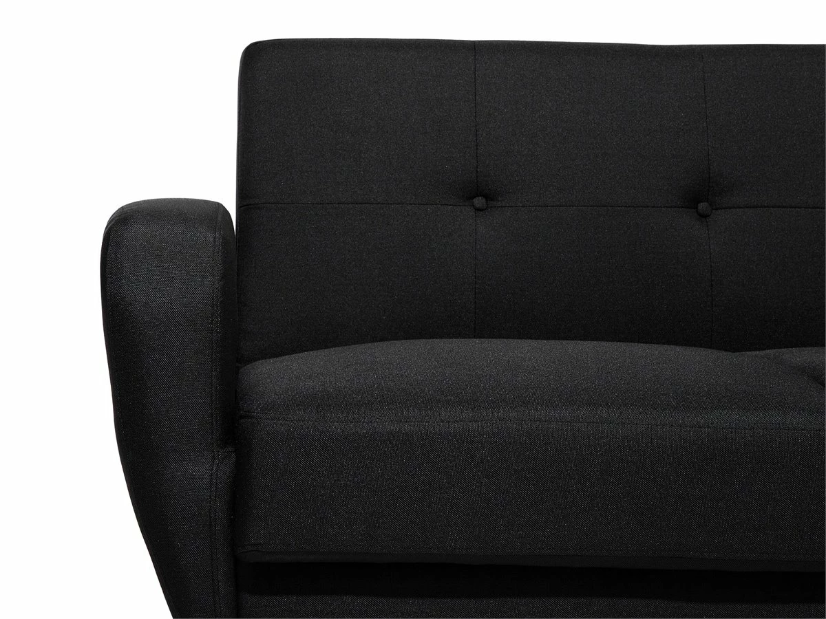 Cómodo sofá cama 2 plazas en color negro. Añade a tu interior este sofá de 2 plazas de diseño retro. Está fabricado a partir de tela de poliéster. El asiento acolchado ofrece la máxima comodidad. El capitoné de botones y las patas de madera de caucho aportan un toque de distinción. Fácilmente convertible en cama gracias al mecanismo clic-clac incorporado. Detalles: Tipo de Producto: Sofá de 2 plazas Estilo: Retro Color: Negro Tipo de material: Tejido Material principal: Poliéster Material adicional: Madera de caucho Material del relleno: Espuma Composición del Material: 100% Poliéster Estilo del apoyabrazo: Estrecho Parte posterior tapizada: Sí Protectores para patas: Sí Reclinable: No Fundas de cojín extraíble: No Construcción del asiento: Muelles ondulados Densidad de espuma del asiento: 22 kg/m3 Asientos para: 2 personas Función para dormir: Sí Mecanismo de abertura del sofa cama: Mecanismo click-clack Almacenamiento: No Dimensiones: Altura del apoyabrazos: 61 cm Profundidad: 85 cm Espesor del asiento: 15 cm Altura del asiento: 41 cm Ancho: 155 cm Altura: 82 cm Superficie del asiento: 127×59 cm Superficie para dormir: 111×127 cm Peso: 38 kg Capacidad de peso por persona: 150 kg La oferta incluye: 1 x Sofá Ventajas: Se convierte en cómoda cama, Acolchado con botones decorativos, Estilo escandinavo minimalista, Acolchado de alta calidad, Patas con tapas antideslizantes de seguridad Información de montaje: Requiere montaje de las patas. 20-40 min. Información adicional: A efectos de transporte, las patas están ocultas en un bolsillo en la parte inferior del asiento. Consejos de mantenimiento: Poliéster: 1.Aspire con un accesorio adecuado 2.Limpiar con champú seco y una esponja húmeda o un limpiador suave. Madera de eucalipto: 1.Seque inmediatamente después de limpiar. para evitar que se acumule agua en los muebles 2.Limpie con un limpiador y un paño suave en la dirección del grano 3.Los muebles con acabado de aceite deben engrasarse una vez al año