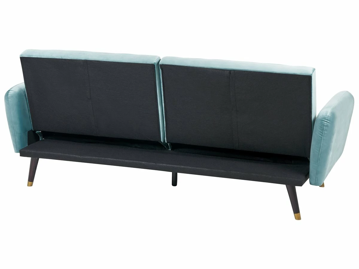 Sofá convertible de diseño glamuroso. Este sofá cama de diseño glamuroso combina bien con cualquier estilo de interior. Está fabricado a partir de terciopelo de alta calidad. La estructura de madera de eucalipto y las patas de madera de caucho garantizan estabilidad. Fácilmente convertible en cama gracias a su respaldo regulable. Detalles: Tipo de Producto: Sofá cama Estilo: Glamour Color: Azul Tonalidad: Azul claro Tipo de material: Poliéster aterciopelado Material principal: Terciopelo Material adicional: Madera de caucho Material del relleno: Espuma Composición del Material: 100% Poliéster Estilo del apoyabrazo: Estrecho Apoyabrazo: Sí Parte posterior tapizada: No Protectores para patas: Sí Reclinable: Sí Fundas de cojín extraíble: No Construcción del asiento: Muelles ondulados Densidad de espuma del asiento: 22 kg/m3 Asientos para: 3 personas Función para dormir: Sí Mecanismo de abertura del sofa cama: Mecanismo click-clack Almacenamiento: No Dimensiones: Altura del apoyabrazos: 65 cm Profundidad: 80 cm Espesor del asiento: 17 cm Altura del asiento: 44 cm Ancho: 212 cm Altura: 90 cm Superficie del asiento: 180×53 cm Superficie para dormir: 110×180 cm Peso: 37 kg Capacidad de peso por persona: 80 kg La oferta incluye: 1 x Sofá Ventajas: Se convierte en cómoda cama, Confort del asiento óptimo, Diseño elegante, Brinda un toque acogedor a cualquier habitación, Acolchado de alta calidad, Respaldo ajustable, Patas con tapas antideslizantes de seguridad Información de montaje: Requiere montaje completo. 20-40 min. Información adicional: A efectos de transporte, las patas están ocultas en un bolsillo en la parte inferior del asiento. Tenga en cuenta que la tela de terciopelo puede verse un poco diferente cuando se expone a una iluminación diferente: tiende a brillar más a la luz del día y parece más atenuada en la iluminación artificial interior. Debido a la estructura suave de alta densidad, el tono de la tela de terciopelo también puede variar cuando se pasa la mano en diferentes direcciones y ángulos. Para igualar el color y eliminar las arrugas, el material debe limpiarse con la palma de mano abierta en una dirección, limpiarse con un paño húmedo o una plancha con vapor. Consejos de mantenimiento: Terciopelo: 1.Aspire con un accesorio adecuado 2.Limpiar con champú seco y una esponja húmeda o un limpiador suave. Madera de caucho: 1.Seque inmediatamente después de limpiar. para evitar que se acumule agua en los muebles 2.Limpie con un limpiador y un paño suave en la dirección del grano 3.Los muebles con acabado de aceite deben engrasarse una vez al año