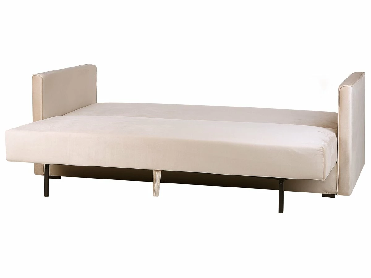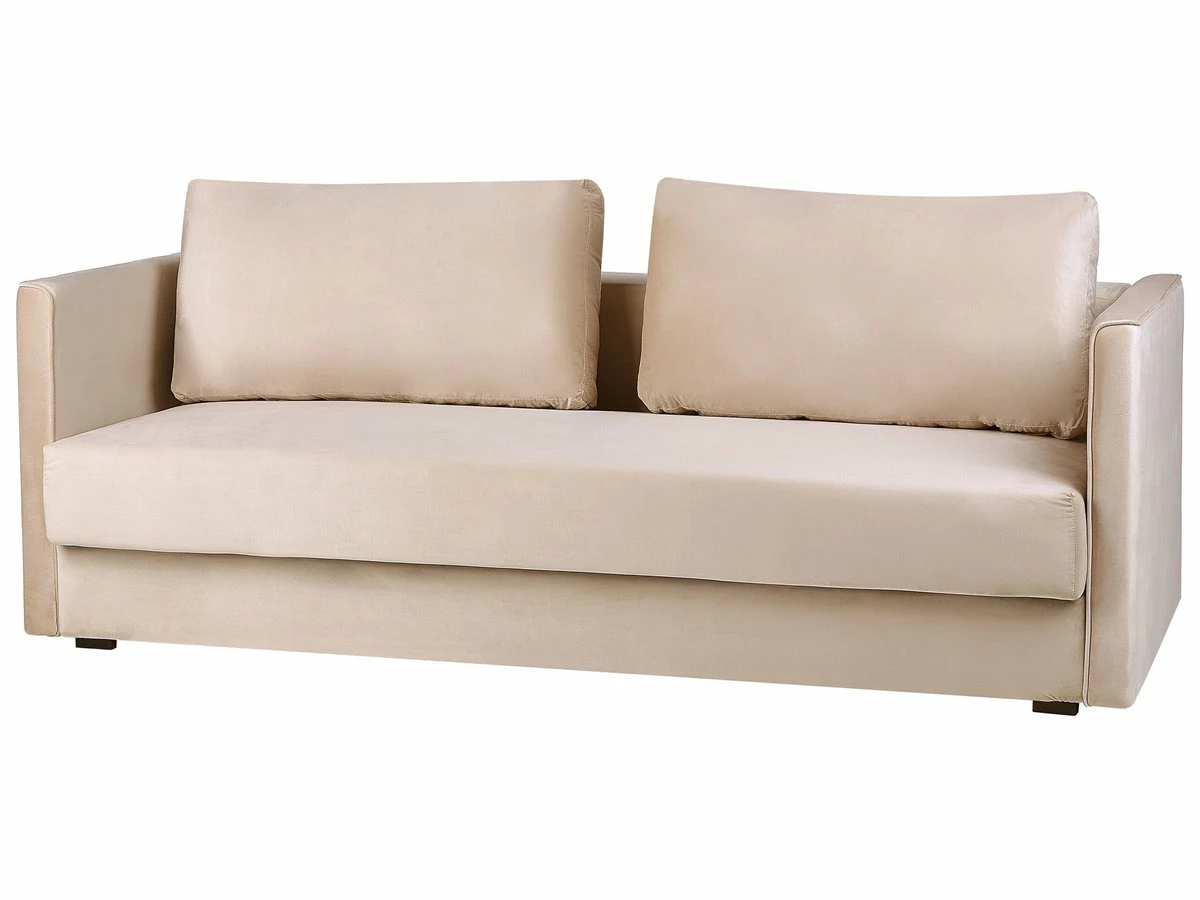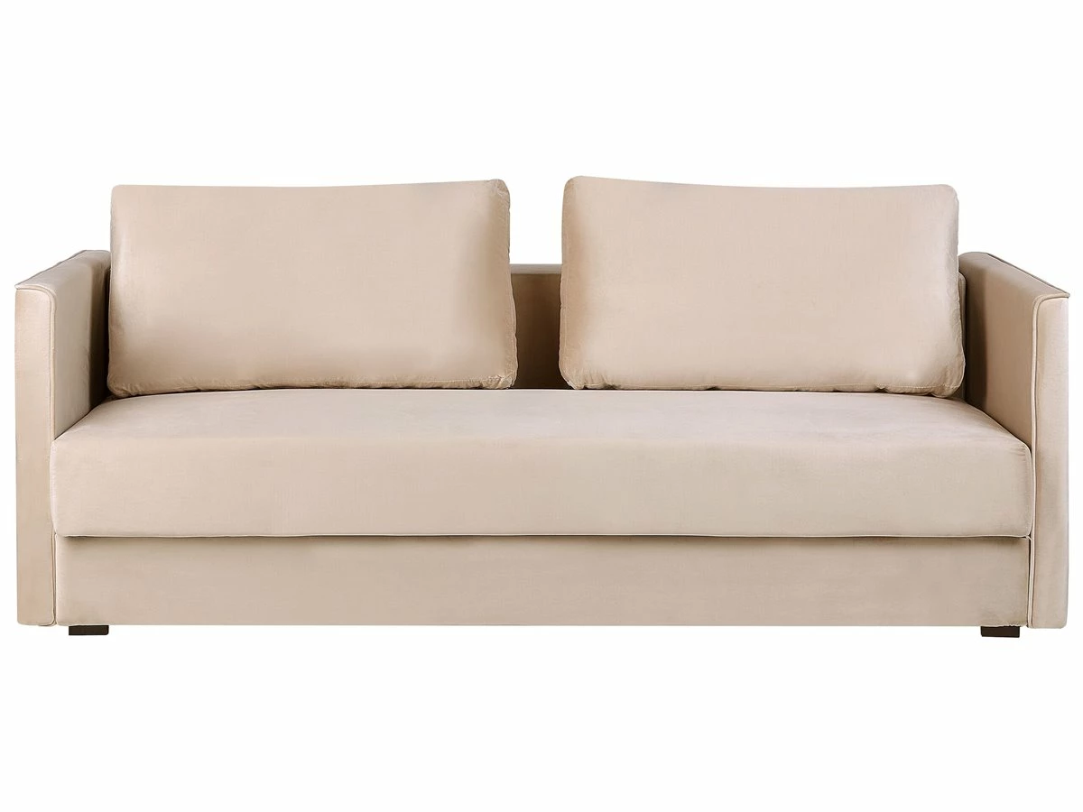 Sofá convertible. Este sofá cama de diseño moderno es ideal para cualquier sala de estar tradicional o minimalista. Está fabricado a partir de tela de terciopelo suave al tacto. Los cojines de asiento acolchados y las patas de madera ofrecen comodidad y estabilidad. Incluye un espacio de almacenaje para guardar ropa u otros accesorios. Fácilmente convertible en cama de invitados. Detalles: Tipo de Producto: Sofá de 3 plazas Estilo: Moderno Color: Beige Tonalidad: Beige claro Tipo de material: Tejido Material principal: Terciopelo Material adicional: Madera de eucalipto Material del relleno: Espuma Composición del Material: 100% Poliéster Estilo del apoyabrazo: Estrecho Apoyabrazo: Sí Parte posterior tapizada: Sí Protectores para patas: Sí Reclinable: No Fundas de cojín extraíble: Sí Construcción del asiento: Muelles ondulados Densidad de espuma del asiento: 50 kg/m3 Asientos para: 3 personas Función para dormir: Sí Mecanismo de abertura del sofa cama: Tracción Almacenamiento: Sí Dimensiones: Altura del apoyabrazos: 74 cm Profundidad: 102 cm Espesor del asiento: 21 cm Altura del asiento: 43 cm Ancho: 220 cm Altura: 87 cm Superficie del asiento: 203×48 cm Superficie para dormir: 146×203 cm Peso: 96 kg Capacidad de peso por persona: 150 kg La oferta incluye: 1 x Sofá Ventajas: Se convierte en cómoda cama, Diseño clásico, El complemento ideal para todo tipo de decoracíon, Patas con tapas anti-deslizantes, Espacio de almacenaje adicional, Cojines de respaldo con fundas extraíbles Información de montaje: Requiere montaje completo. 45-60 min. Consejos de mantenimiento: Poliéster: 1.Aspire con un accesorio adecuado 2.Limpiar con champú seco y una esponja húmeda o un limpiador suave. Madera: 1.Seque inmediatamente después de limpiar. para evitar que se acumule agua en los muebles 2.Limpie con un limpiador y un paño suave en la dirección del grano 3.Los muebles con acabado de aceite deben engrasarse una vez al año