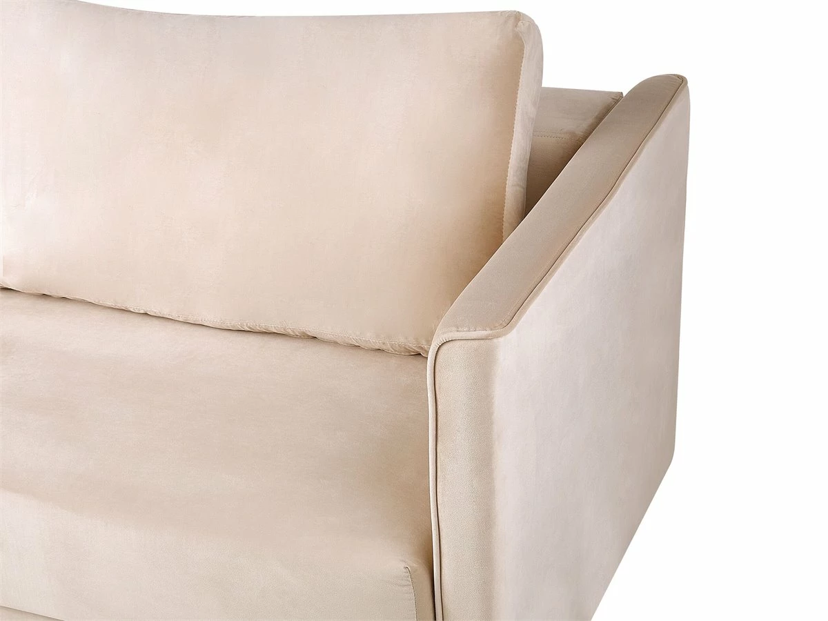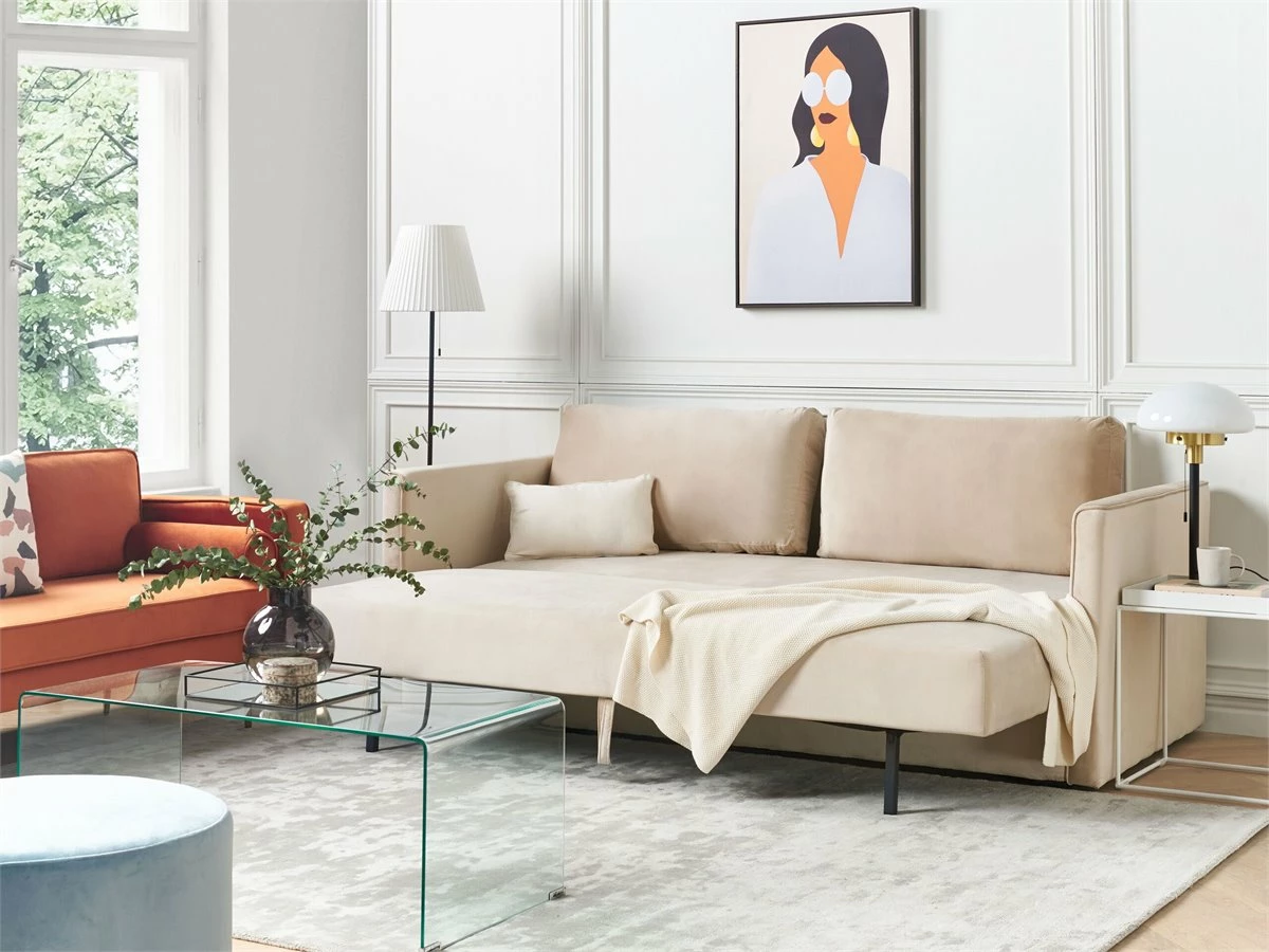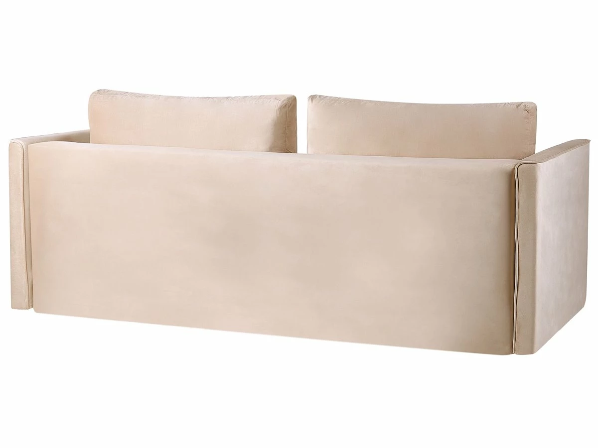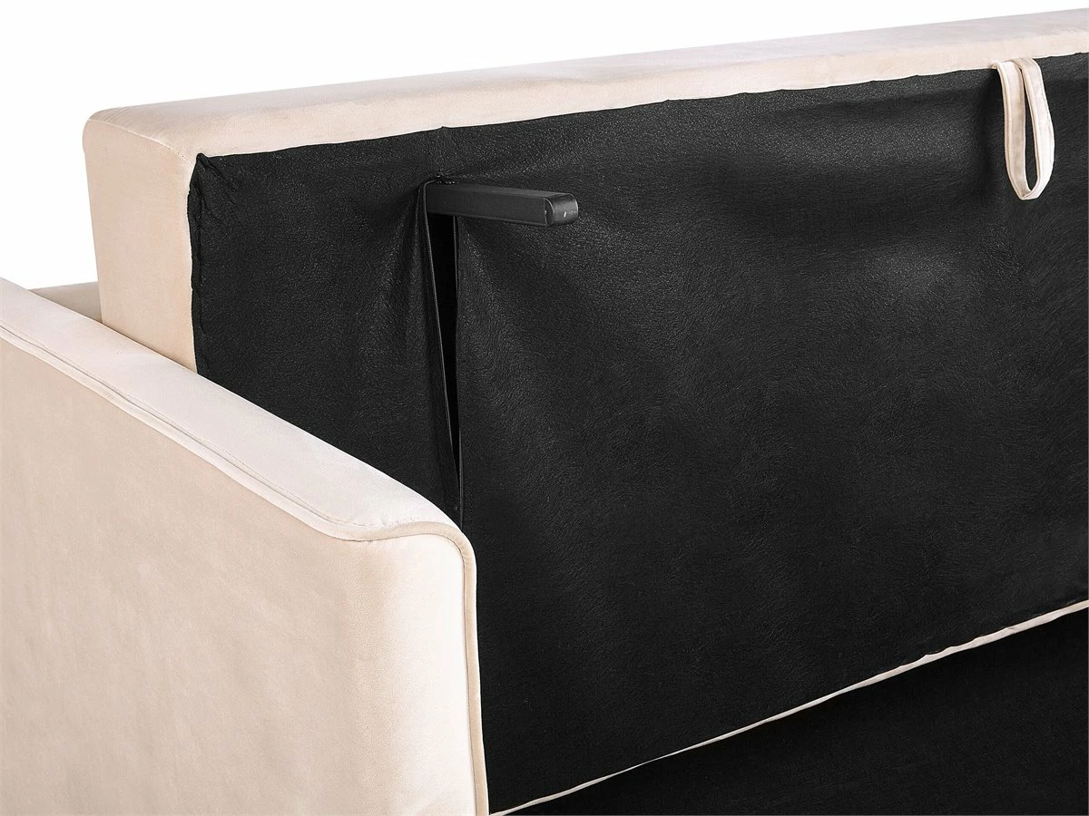 Sofá convertible. Este sofá cama de diseño moderno es ideal para cualquier sala de estar tradicional o minimalista. Está fabricado a partir de tela de terciopelo suave al tacto. Los cojines de asiento acolchados y las patas de madera ofrecen comodidad y estabilidad. Incluye un espacio de almacenaje para guardar ropa u otros accesorios. Fácilmente convertible en cama de invitados. Detalles: Tipo de Producto: Sofá de 3 plazas Estilo: Moderno Color: Beige Tonalidad: Beige claro Tipo de material: Tejido Material principal: Terciopelo Material adicional: Madera de eucalipto Material del relleno: Espuma Composición del Material: 100% Poliéster Estilo del apoyabrazo: Estrecho Apoyabrazo: Sí Parte posterior tapizada: Sí Protectores para patas: Sí Reclinable: No Fundas de cojín extraíble: Sí Construcción del asiento: Muelles ondulados Densidad de espuma del asiento: 50 kg/m3 Asientos para: 3 personas Función para dormir: Sí Mecanismo de abertura del sofa cama: Tracción Almacenamiento: Sí Dimensiones: Altura del apoyabrazos: 74 cm Profundidad: 102 cm Espesor del asiento: 21 cm Altura del asiento: 43 cm Ancho: 220 cm Altura: 87 cm Superficie del asiento: 203×48 cm Superficie para dormir: 146×203 cm Peso: 96 kg Capacidad de peso por persona: 150 kg La oferta incluye: 1 x Sofá Ventajas: Se convierte en cómoda cama, Diseño clásico, El complemento ideal para todo tipo de decoracíon, Patas con tapas anti-deslizantes, Espacio de almacenaje adicional, Cojines de respaldo con fundas extraíbles Información de montaje: Requiere montaje completo. 45-60 min. Consejos de mantenimiento: Poliéster: 1.Aspire con un accesorio adecuado 2.Limpiar con champú seco y una esponja húmeda o un limpiador suave. Madera: 1.Seque inmediatamente después de limpiar. para evitar que se acumule agua en los muebles 2.Limpie con un limpiador y un paño suave en la dirección del grano 3.Los muebles con acabado de aceite deben engrasarse una vez al año