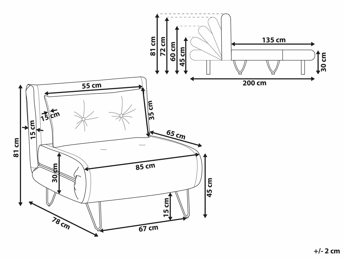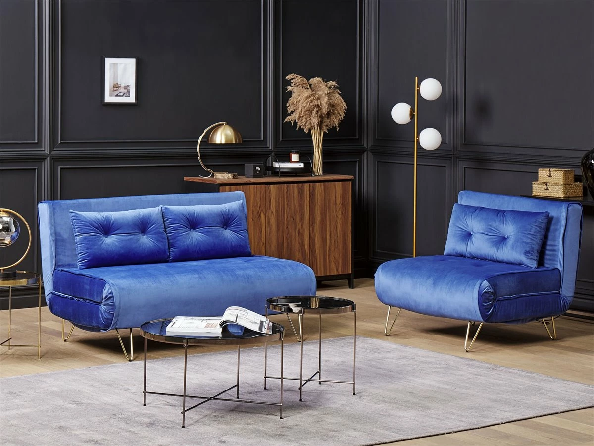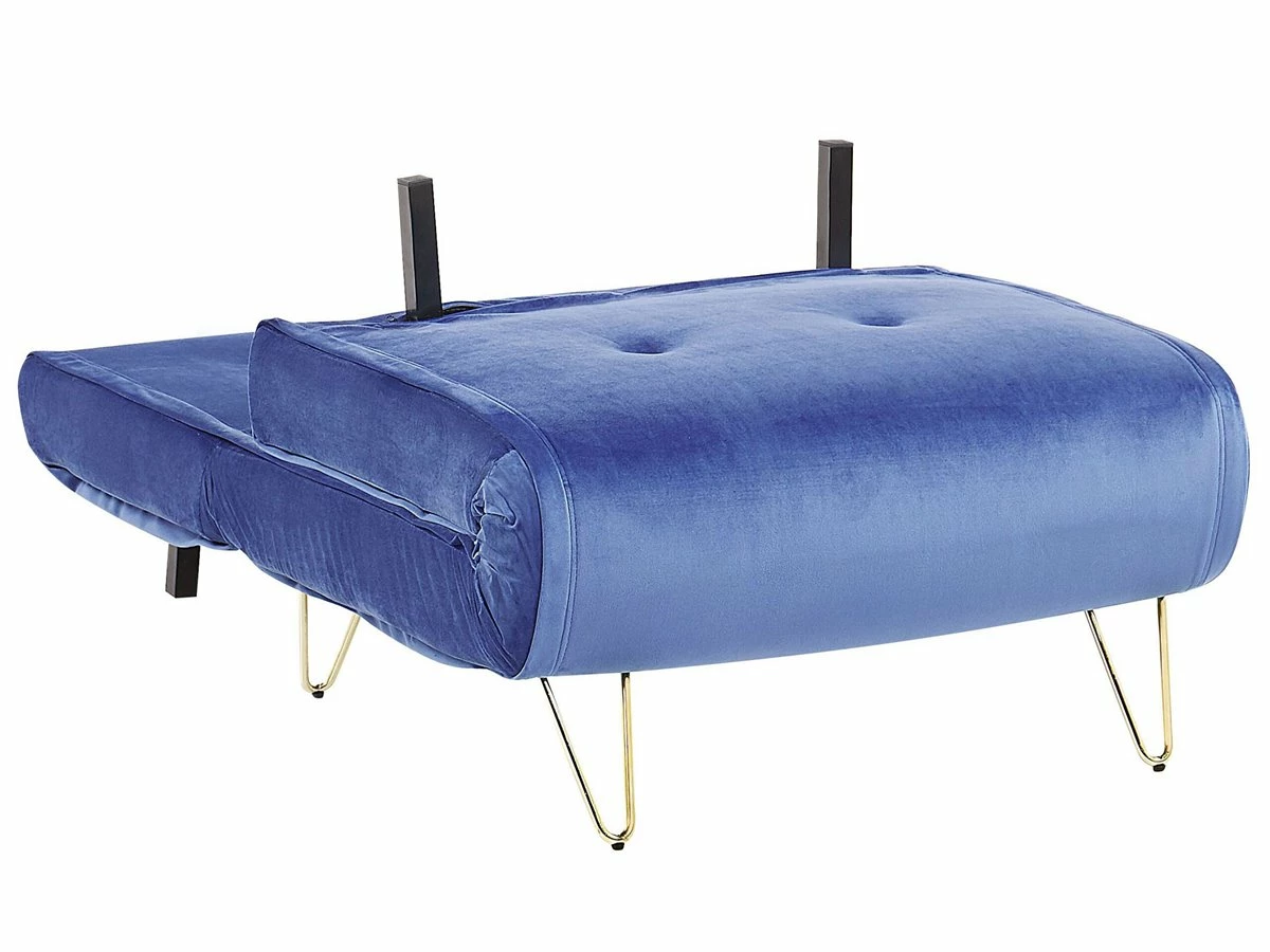 Sofá de 1 plaza. Dale un toque de glamour a tu interior con este sofá cama. Está fabricado a partir de tela de terciopelo suave al tacto. El asiento de acolchado grueso ofrece la máxima comodidad. Los cojines adicionales con capitoné vienen con fundas extraíbles. Las patas de metal garantizan estabilidad. Fácilmente convertible en cama. Detalles: Tipo de Producto: Sofá individual Estilo: Glamour Color: Azul Tonalidad: Azul marino Tipo de material: Poliéster aterciopelado Material principal: Terciopelo Material adicional: Hierro Material del relleno: Espuma Composición del Material: 100% Poliéster Estilo del apoyabrazo: Sin reposabrazos Apoyabrazo: No Parte posterior tapizada: No Protectores para patas: Sí Reclinable: No Fundas de cojín extraíble: Sí Construcción del asiento: Muelles ondulados Densidad de espuma del asiento: 50 kg/m3 Asientos para: 1 persona Función para dormir: Sí Mecanismo de abertura del sofa cama: Mecanismo click-clack Almacenamiento: No Dimensiones: Profundidad: 78 cm Espesor del asiento: 30 cm Altura del asiento: 45 cm Ancho: 85 cm Altura: 45-81 cm Superficie del asiento: 85×65 cm Superficie para dormir: 200×85 cm Peso: 23 kg Capacidad de peso por persona: 150 kg La oferta incluye: 1 x Sofá, 1 x Cojín Ventajas: Se convierte en cómoda cama, Respaldo ajustable en 5 posiciones, Estilo retro, Elegante pieza decorativa, Acolchado con botones decorativos, Tejido aterciopelado suave como la seda, Cojines extraíbles para un fácil mantenimiento, Respaldo ajustable Información de montaje: Requiere montaje de las patas. 20-40 min. Información adicional: Tenga en cuenta que la tela de terciopelo puede verse un poco diferente cuando se expone a una iluminación diferente: tiende a brillar más a la luz del día y parece más atenuada en la iluminación artificial interior. Debido a la estructura suave de alta densidad, el tono de la tela de terciopelo también puede variar cuando se pasa la mano en diferentes direcciones y ángulos. Para igualar el color y eliminar las arrugas, el material debe limpiarse con la palma de mano abierta en una dirección, limpiarse con un paño húmedo o una plancha con vapor. Consejos de mantenimiento: Terciopelo: 1.Aspire con un accesorio adecuado 2.Limpiar con champú seco y una esponja húmeda o un limpiador suave. Hierro: 1.Para evitar arañazos, no use limpiadores abrasivos 2.Limpie con un limpiador y un paño suave, seque después 3.Para elementos de cobre o cromados, use agente abrillantador.