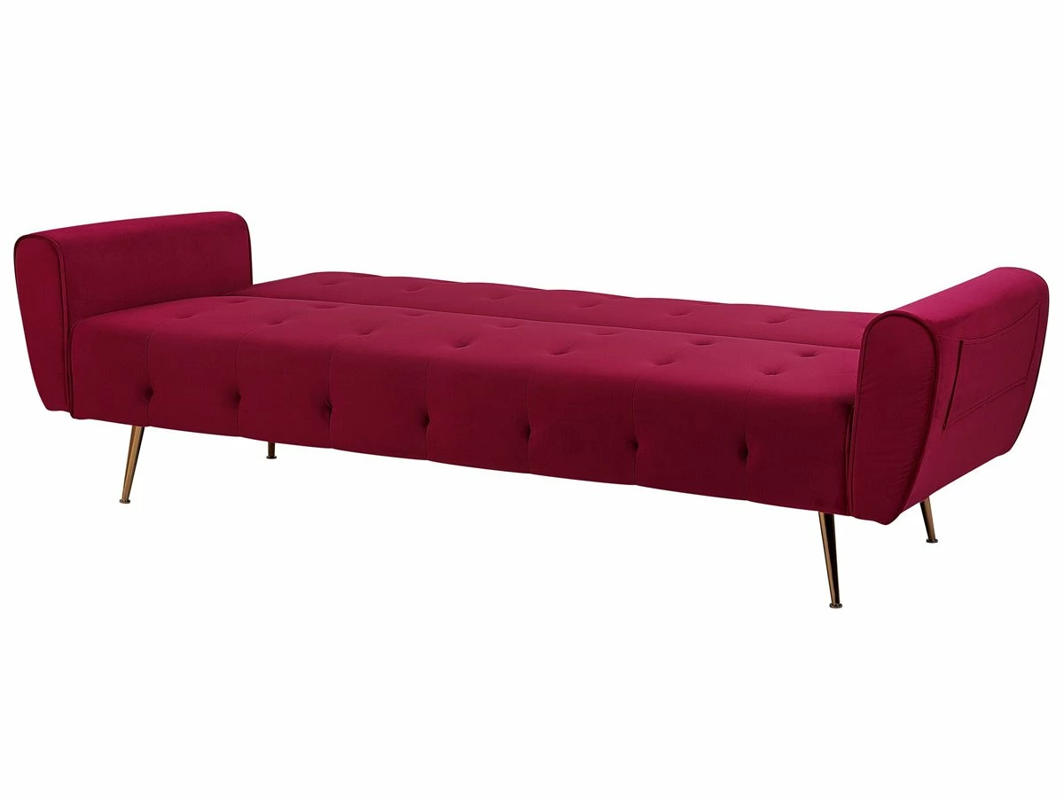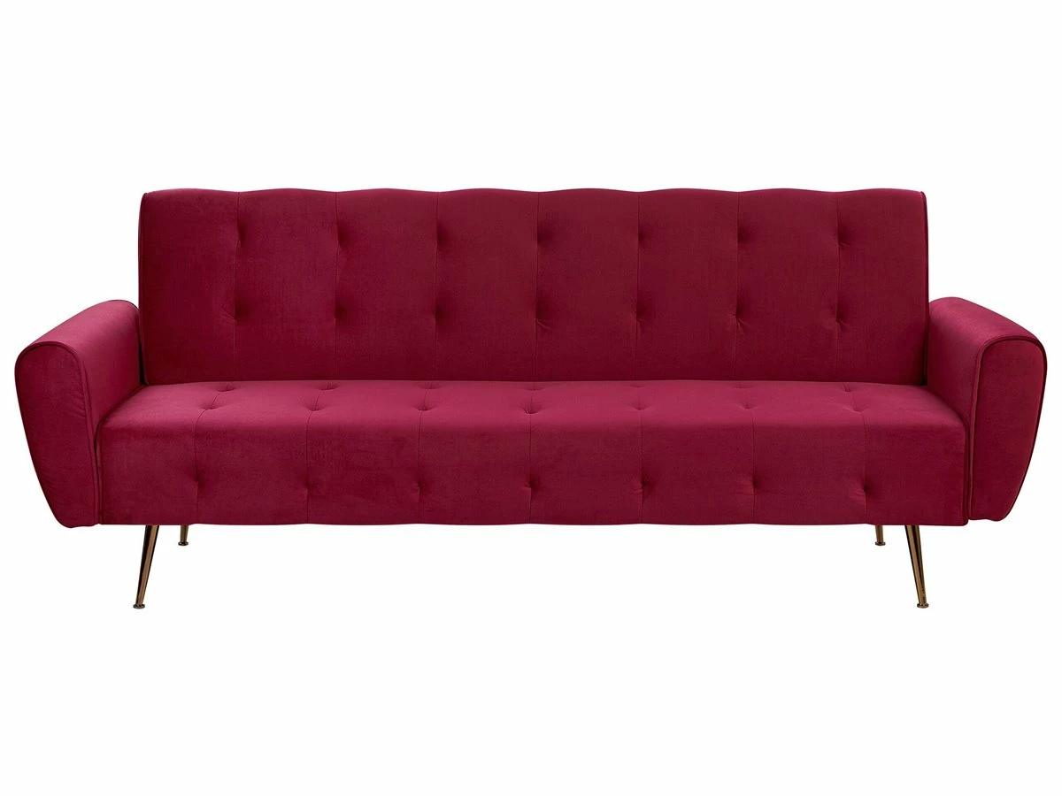 Sofá cama de terciopelo. Añade a tu interior este sofá cama de diseño clásico. Está fabricado a partir de terciopelo suave al tacto. El acolchado de espuma ofrece la máxima comodidad y el adorno decorativo, un toque de glamour. Las patas de metal brillante garantizan estabilidad. Fácilmente convertible en cama. Detalles: Tipo de Producto: Sofá de 3 plazas Estilo: Retro Color: Rojo Tonalidad: Borgoña Tipo de material: Poliéster aterciopelado Material principal: Terciopelo Material adicional: Metal Material del relleno: Espuma Composición del Material: 100% Poliéster Estilo del apoyabrazo: Diagonal Apoyabrazo: Sí Parte posterior tapizada: Sí Protectores para patas: No Reclinable: No Fundas de cojín extraíble: No Construcción del asiento: Muelles de bolsillo Densidad de espuma del asiento: 50 kg/m3 Asientos para: 3 personas Función para dormir: Sí Mecanismo de abertura del sofa cama: Mecanismo click-clack Almacenamiento: No Dimensiones: Altura del apoyabrazos: 59 cm Profundidad: 84 cm Espesor del asiento: 23 cm Altura del asiento: 43 cm Ancho: 212 cm Altura: 85 cm Superficie del asiento: 181×53 cm Superficie para dormir: 102×181 cm Peso: 44 kg Capacidad de peso por persona: 120 kg La oferta incluye: 1 x Sofá Ventajas: Convertible en cómoda cama, Respaldo alto y asiento muy cómodo, Estilo retro, Ideal para todo tipo de decoración, Fabricación sólida y precisa, Tejido aterciopelado suave como la seda Información de montaje: Requiere montaje completo. 5-15 min. Información adicional: Tenga en cuenta que la tela de terciopelo puede verse un poco diferente cuando se expone a una iluminación diferente: tiende a brillar más a la luz del día y parece más atenuada en la iluminación artificial interior. Debido a la estructura suave de alta densidad, el tono de la tela de terciopelo también puede variar cuando se pasa la mano en diferentes direcciones y ángulos. Para igualar el color y eliminar las arrugas, el material debe limpiarse con la palma de mano abierta en una dirección, limpiarse con un paño húmedo o una plancha con vapor. Consejos de mantenimiento: Terciopelo: 1.Aspire con un accesorio adecuado 2.Limpiar con champú seco y una esponja húmeda o un limpiador suave. Metal: 1.Para elementos de cobre o cromados, use agente abrillantador 2.Para evitar arañazos, no use limpiadores abrasivos 3.Limpie con un limpiador y un paño suave, seque después.