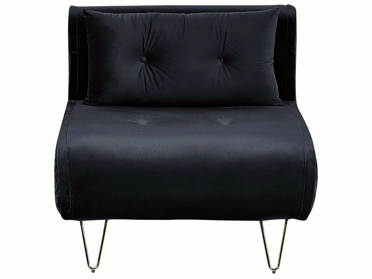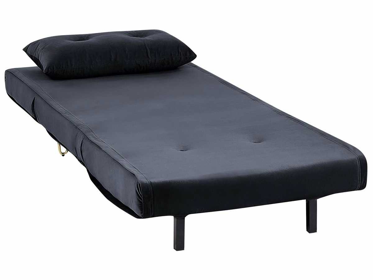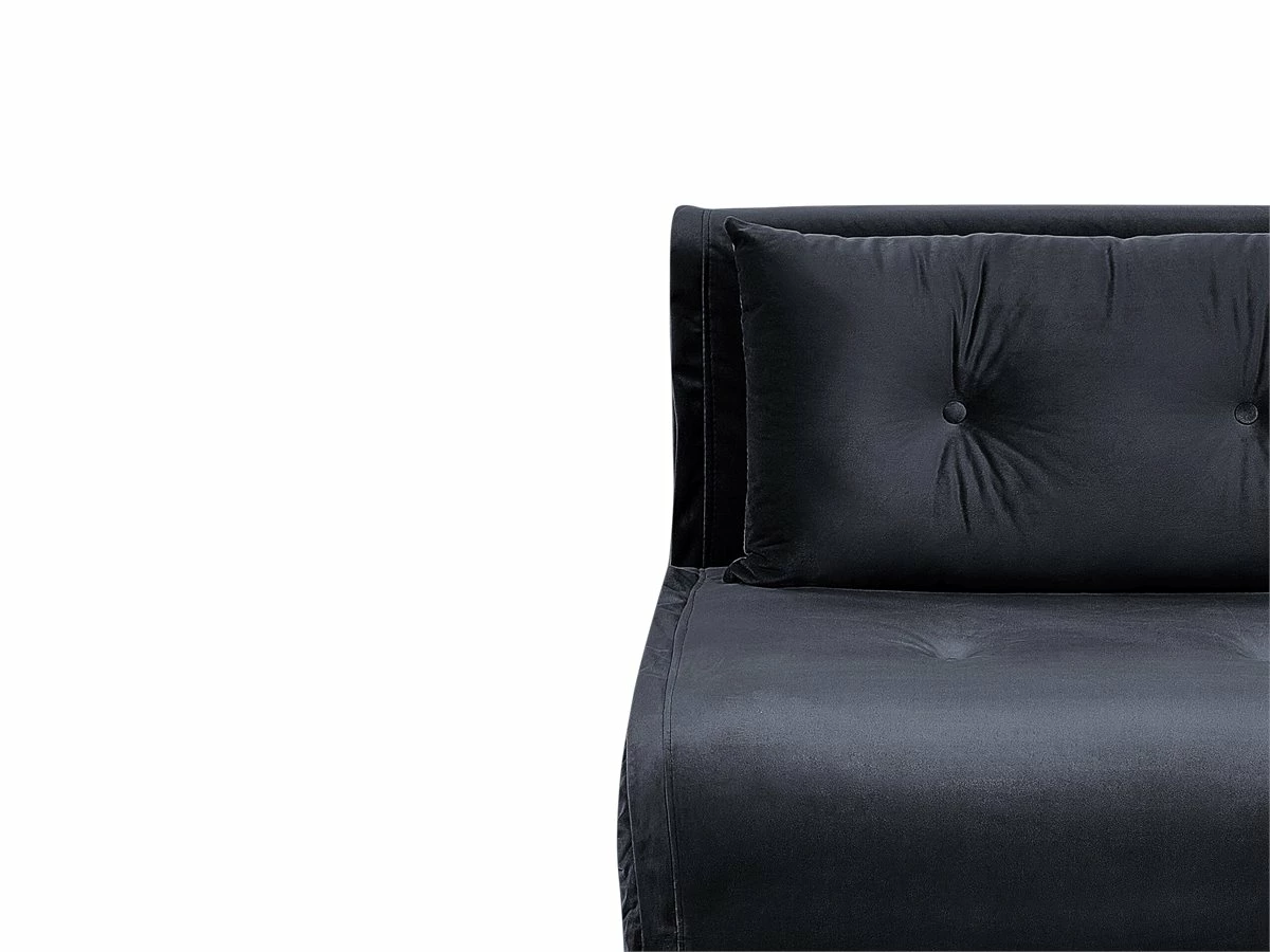 Sofá de diseño glamuroso. Dale un toque de glamour a tu sala de estar o dormitorio con este sofá cama. Está fabricado a partir de tela de terciopelo suave al tacto. El asiento de acolchado grueso ofrece la máxima comodidad. El cojín adicional con capitoné viene con funda extraíble. Las patas de metal garantizan estabilidad. Fácilmente convertible en cama. Detalles: Tipo de Producto: Sofá individual Estilo: Glamour Color: Negro Tipo de material: Poliéster aterciopelado Material principal: Terciopelo Material adicional: Hierro Material del relleno: Espuma Composición del Material: 100% Poliéster Estilo del apoyabrazo: Sin reposabrazos Apoyabrazo: No Parte posterior tapizada: No Protectores para patas: Sí Reclinable: No Fundas de cojín extraíble: Sí Construcción del asiento: Muelles ondulados Densidad de espuma del asiento: 50 kg/m3 Asientos para: 1 persona Función para dormir: Sí Mecanismo de abertura del sofa cama: Mecanismo click-clack Almacenamiento: No Dimensiones: Profundidad: 80 cm Espesor del asiento: 30 cm Altura del asiento: 30 cm Ancho: 85 cm Altura: 81 cm Superficie del asiento: 85×65 cm Superficie para dormir: 200×85 cm Peso: 26 kg Capacidad de peso por persona: 150 kg La oferta incluye: 1 x Sofá, 1 x Cojín Ventajas: Se convierte en cómoda cama, Respaldo ajustable en 5 posiciones, Estilo retro, Elegante pieza decorativa, Acolchado con botones decorativos, Tejido aterciopelado suave como la seda, Cojines extraíbles para un fácil mantenimiento, Respaldo ajustable Información de montaje: Requiere montaje de las patas. 5-15 min. Información adicional: Ten en cuenta que la tela de terciopelo puede presentar un aspecto distinto según la iluminación a la que esté expuesta: tiende a brillar más a la luz del día y a parecer más tenue con luz artificial en interiores. Debido a la estructura suave de alta densidad, la tonalidad puede verse modificada haciendo pasar la mano en distintas direcciones y ángulos. Para igualar el color y eliminar las arrugas, el material debe limpiarse con la palma de mano abierta en una dirección, con un paño húmedo o una plancha con vapor. Consejos de mantenimiento: Terciopelo: 1.Aspire con un accesorio adecuado 2.Limpiar con champú seco y una esponja húmeda o un limpiador suave. Hierro: 1.Para elementos de cobre o cromados, use agente abrillantador 2.Para evitar arañazos, no use limpiadores abrasivos 3.Limpie con un limpiador y un paño suave, seque después.