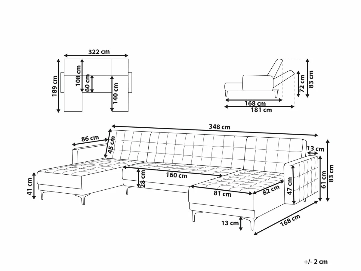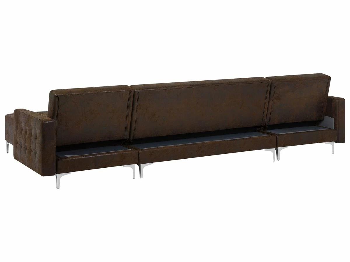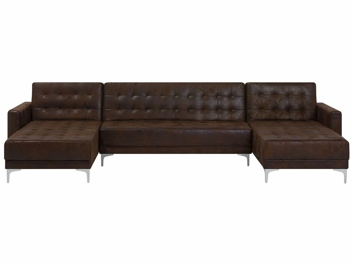 Elegante sofá en color marrón. Añade a tu sala de estar este sofá cama en forma de U de alta calidad. El acabado se adapta a cualquier esquema de color. Las patas de metal ofrecen la máxima estabilidad. Fácilmente convertible en cama gracias a su respaldo regulable. Detalles: Tipo de Producto: Sofá cama Estilo: Moderno Color: Marrón Tonalidad: Marrón oscuro Tipo de material: Piel sintética Material principal: Piel sintética Material adicional: Metal Material del relleno: Espuma Composición del Material: 100% Poliéster Forma: Forma de U Estilo del apoyabrazo: Estrecho Parte posterior tapizada: Sí Protectores para patas: Sí Piezas modulares: Sí Orientación: Universal Reclinable: No Fundas de cojín extraíble: No Construcción del asiento: Muelles ondulados Densidad de espuma del asiento: 50 kg/m3 Asientos para: 4 – 6 personas Función para dormir: Sí Mecanismo de abertura del sofa cama: Mecanismo click-clack Almacenamiento: No Dimensiones: Altura del apoyabrazos: 61 cm Profundidad: 168 cm Espesor del asiento: 20 cm Altura del asiento: 41 cm Ancho: 348 cm Altura: 83 cm Superficie del asiento: 322×60 cm Superficie para dormir: 322×108 cm Peso: 105 kg Capacidad de peso por persona: 150 kg La oferta incluye: 1 x Sofá de 3 plazas, 2 x Chaise longue Ventajas: Se convierte en cómoda cama, Respaldo ajustable en 3 posiciones, Brinda comodidad y relajación, Confort del asiento óptimo, Diseño elegante, Con un clásico mechón decorativo, Tapicería de piel sintética de alta calidad para un aspecto natural Información de montaje: Requiere montaje parcial. 45-60 min. Información adicional: Para un uso seguro, debe haber un espacio de ~15 cm entre el respaldo y la pared. Consejos de mantenimiento: Piel sintética: 1.Limpie con agua destilada y use limpiadores a base de jabón en las manchas difíciles 2.Aspire con un accesorio adecuado 3.Una vez a la semana, limpie con un paño húmedo y seque después. No engrasar, 4.Use solo limpiadores suaves y acondicionadores dedicados a la piel sintética Metal: 1.Limpie con un limpiador y un paño suave, seque después 2.Para elementos de cobre o cromados, use agente abrillantador 3.Para evitar arañazos, no use limpiadores abrasivos.