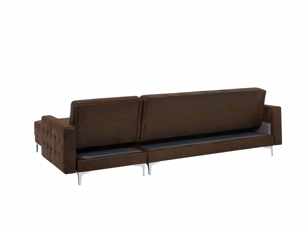 Sofá cama esquinero en color marrón. Añade a tu sala de estar este sofá cama de alta calidad. El acabado se adapta a cualquier esquema de color. Las patas de metal ofrecen la máxima estabilidad. Fácilmente convertible en cama gracias a su respaldo regulable. Detalles: Tipo de Producto: Sofá esquinero Estilo: Moderno Color: Marrón Tonalidad: Marrón oscuro Tipo de material: Piel sintética Material principal: Piel sintética Material adicional: Metal Material del relleno: Espuma Composición del Material: 100% Poliéster Forma: Forma de L Estilo del apoyabrazo: Estrecho Parte posterior tapizada: Sí Protectores para patas: Sí Piezas modulares: No Orientación: Izquierda Reclinable: No Fundas de cojín extraíble: No Construcción del asiento: Muelles ondulados Densidad de espuma del asiento: 50 kg/m3 Asientos para: 4 – 6 personas Función para dormir: Sí Mecanismo de abertura del sofa cama: Mecanismo click-clack Almacenamiento: No Dimensiones: Altura del apoyabrazos: 61 cm Profundidad: 168 cm Espesor del asiento: 20 cm Altura del asiento: 41 cm Ancho: 267 cm Altura: 83 cm Superficie del asiento: 241×60 cm Superficie para dormir: 241×108 cm Peso: 77 kg Capacidad de peso por persona: 150 kg La oferta incluye: 1 x Sofá esquinero Ventajas: Se convierte en cómoda cama, Respaldo ajustable en 3 posiciones, Brinda comodidad y relajación, Confort del asiento óptimo, Diseño elegante, Con un clásico mechón decorativo, Tapicería de piel sintética de alta calidad para un aspecto natural Información de montaje: Requiere montaje parcial. 45-60 min. Información adicional: Para un uso seguro, debe haber un espacio de ~15 cm entre el respaldo y la pared. Consejos de mantenimiento: Piel sintética: 1.Limpie con agua destilada y use limpiadores a base de jabón en las manchas difíciles 2.Aspire con un accesorio adecuado 3.Una vez a la semana, limpie con un paño húmedo y seque después. No engrasar, 4.Use solo limpiadores suaves y acondicionadores dedicados a la piel sintética Metal: 1.Para evitar arañazos, no use limpiadores abrasivos 2.Limpie con un limpiador y un paño suave, seque después 3.Para elementos de cobre o cromados, use agente abrillantador.