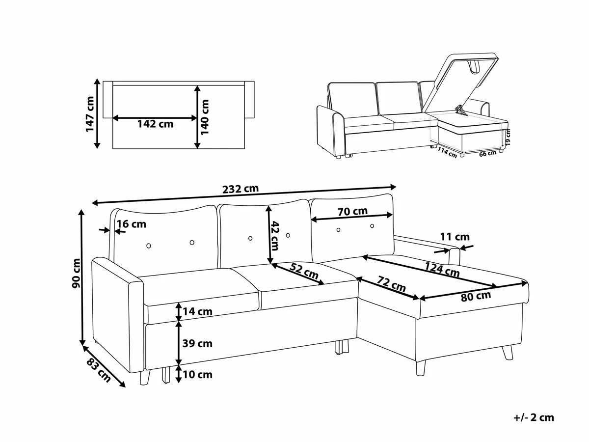 Sofá cama esquinero con almacenaje. Añade a tu sala de estar este sofá esquinero de diseño moderno. Ideal para descansar después de un largo día de trabajo, dar la bienvenida a tus invitados o ver la TV en compañía de tus seres queridos. Está fabricado a partir de poliéster resistente y suave al tacto. Las patas de inspiración escandinava ofrecen estabilidad. Incluye un espacio de almacenaje para guardar las sábanas y los edredones. Fácilmente convertible en cama. Detalles: Tipo de Producto: Sofá esquinero Estilo: Moderno Color: Azul Tonalidad: Azul marino Tipo de material: Tejido Material principal: Poliéster Material adicional: Madera de caucho Material del relleno: Espuma Composición del Material: 100% Poliéster Forma: Forma de L Estilo del apoyabrazo: Estrecho Parte posterior tapizada: Sí Protectores para patas: Sí Piezas modulares: No Orientación: Izquierda Reclinable: No Fundas de cojín extraíble: Sí Construcción del asiento: Muelles ondulados Densidad de espuma del asiento: 45 kg/m3 Asientos para: 4 – 6 personas Función para dormir: Sí Mecanismo de abertura del sofa cama: Tracción Almacenamiento: Sí Dimensiones: Altura del apoyabrazos: 75 cm Profundidad: 147 cm Espesor del asiento: 14 cm Altura del asiento: 53 cm Ancho: 232 cm Altura: 90 cm Superficie del asiento: 210×52 cm Superficie para dormir: 124×209 cm Peso: 95 kg Capacidad de peso por persona: 150 kg La oferta incluye: 1 x Sofá esquinero Ventajas: Se convierte en cómoda cama, Extremadamente cómodo, Espaciosa superficie para dormir, Diseño moderno, Acolchado de alta calidad, Espacio de almacenaje adicional Información de montaje: Requiere montaje completo. 45-60 min. Consejos de mantenimiento: Poliéster: 1.Limpiar con champú seco y una esponja húmeda o un limpiador suave 2.Aspire con un accesorio adecuado. Madera de caucho: 1.Limpie con un limpiador y un paño suave en la dirección del grano 2.Los muebles con acabado de aceite deben engrasarse una vez al año, 3.Seque inmediatamente después de limpiar. para evitar que se acumule agua en los muebles.