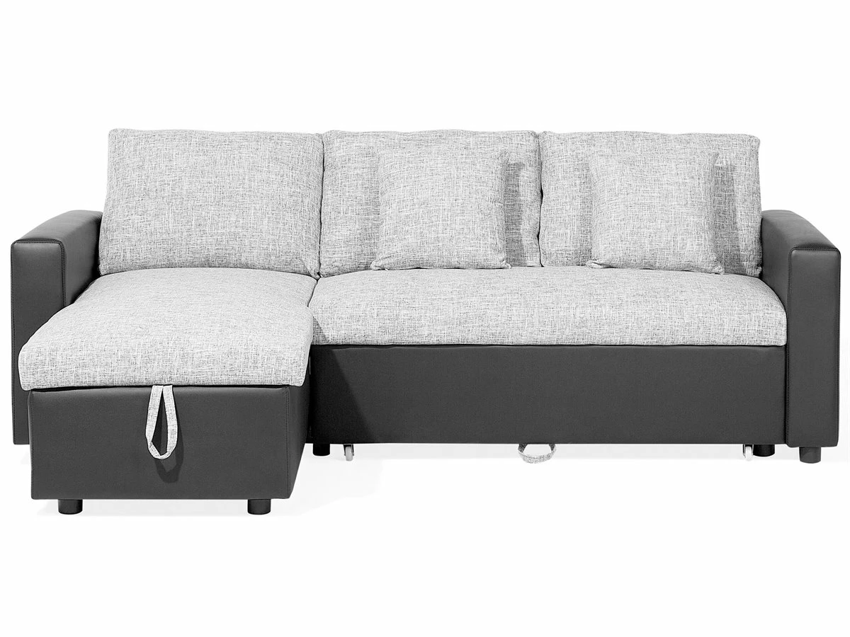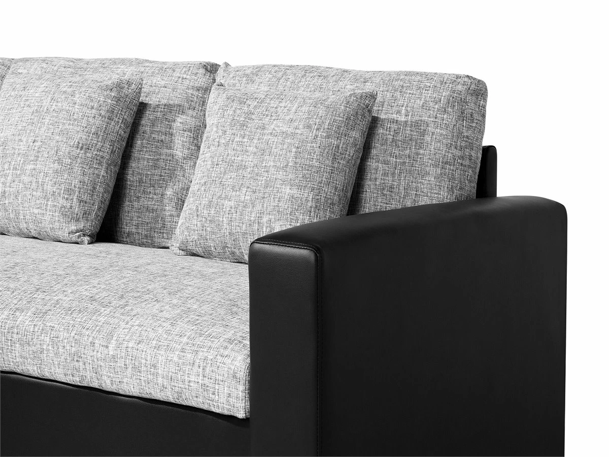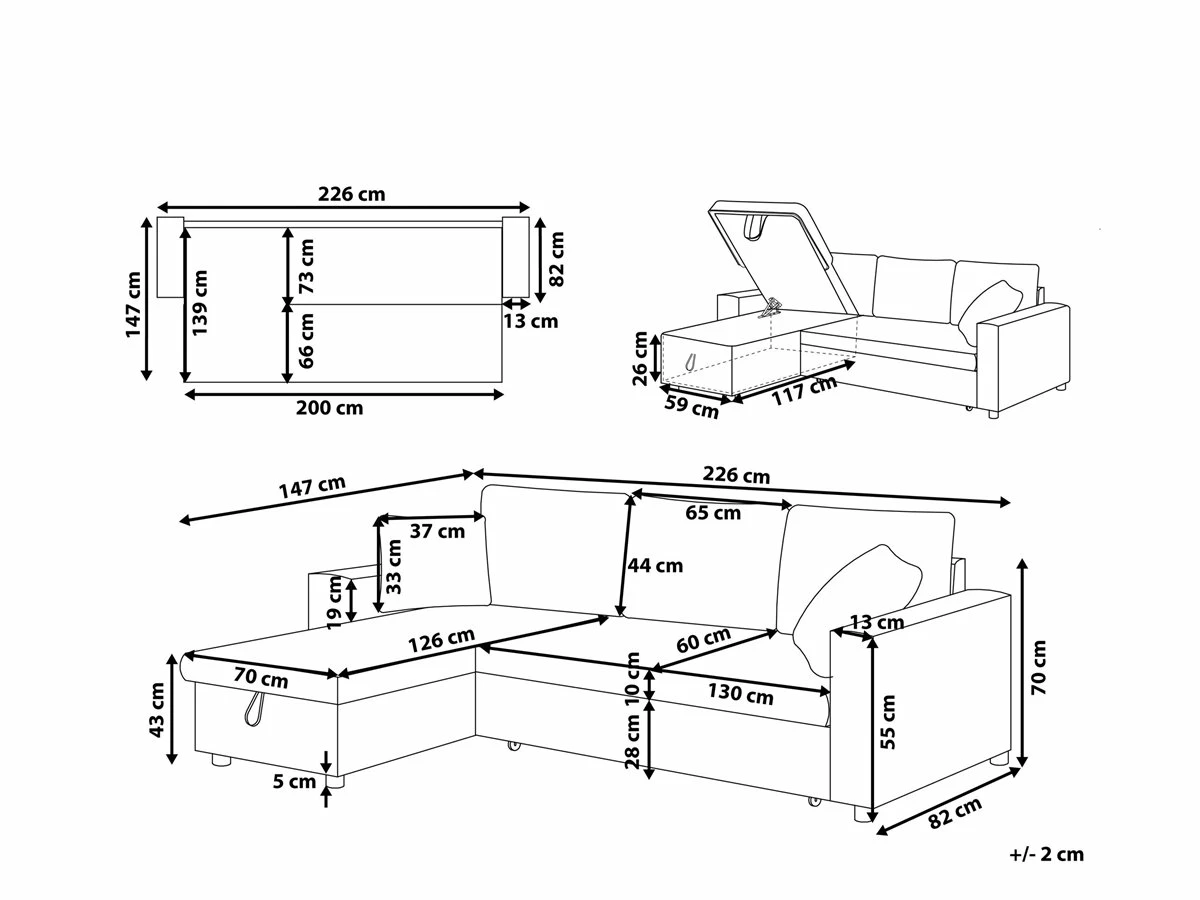 Sofá cama multifuncional. Este sofá esquinero es ideal para cualquier interior de dimensiones reducidas. Está fabricado a partir de poliéster de alta calidad. Los cojines adicionales vienen con fundas extraíbles. Las patas de madera maciza garantizan estabilidad. Incluye un espacio de almacenaje para guardar las sábanas y los edredones. Fácilmente convertible en cama. Detalles: Tipo de Producto: Sofá esquinero Estilo: Moderno Color: Gris Tonalidad: Gris oscuro Tipo de material: Tejido Material principal: Poliéster Material adicional: Piel sintética Material del relleno: Espuma Forma: Forma de L Estilo del apoyabrazo: Estrecho Parte posterior tapizada: Sí Protectores para patas: No Piezas modulares: No Orientación: Derecha Reclinable: No Fundas de cojín extraíble: Sí Construcción del asiento: Muelles ondulados Densidad de espuma del asiento: 50 kg/m3 Asientos para: 3 personas Función para dormir: Sí Mecanismo de abertura del sofa cama: Tracción Almacenamiento: Sí Dimensiones: Altura del apoyabrazos: 55 cm Profundidad: 147 cm Espesor del asiento: 10 cm Altura del asiento: 43 cm Ancho: 226 cm Altura: 70 cm Superficie del asiento: 200×126 cm Superficie para dormir: 200×139 cm Peso: 93 kg Capacidad de peso por persona: 150 kg La oferta incluye: 1 x Sofá esquinero, 2 x Almohada Ventajas: Se convierte en cómoda cama, Confort del asiento óptimo, Ideal para todo tipo de decoración, No requiere mantenimiento regular, Espacio de almacenaje adicional, Fundas extraíbles, Completamente tapizado Información de montaje: Requiere montaje completo. 20-40 min. Consejos de mantenimiento: Poliéster: 1.Aspire con un accesorio adecuado 2.Limpiar con champú seco y una esponja húmeda o un limpiador suave. Material sintético: 1.Limpie con un limpiador y un paño suave, seque después.
