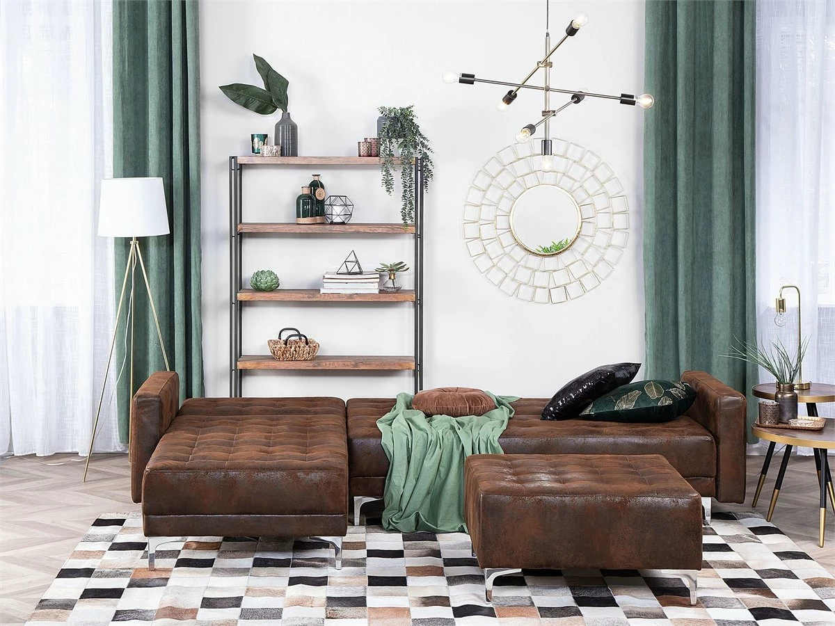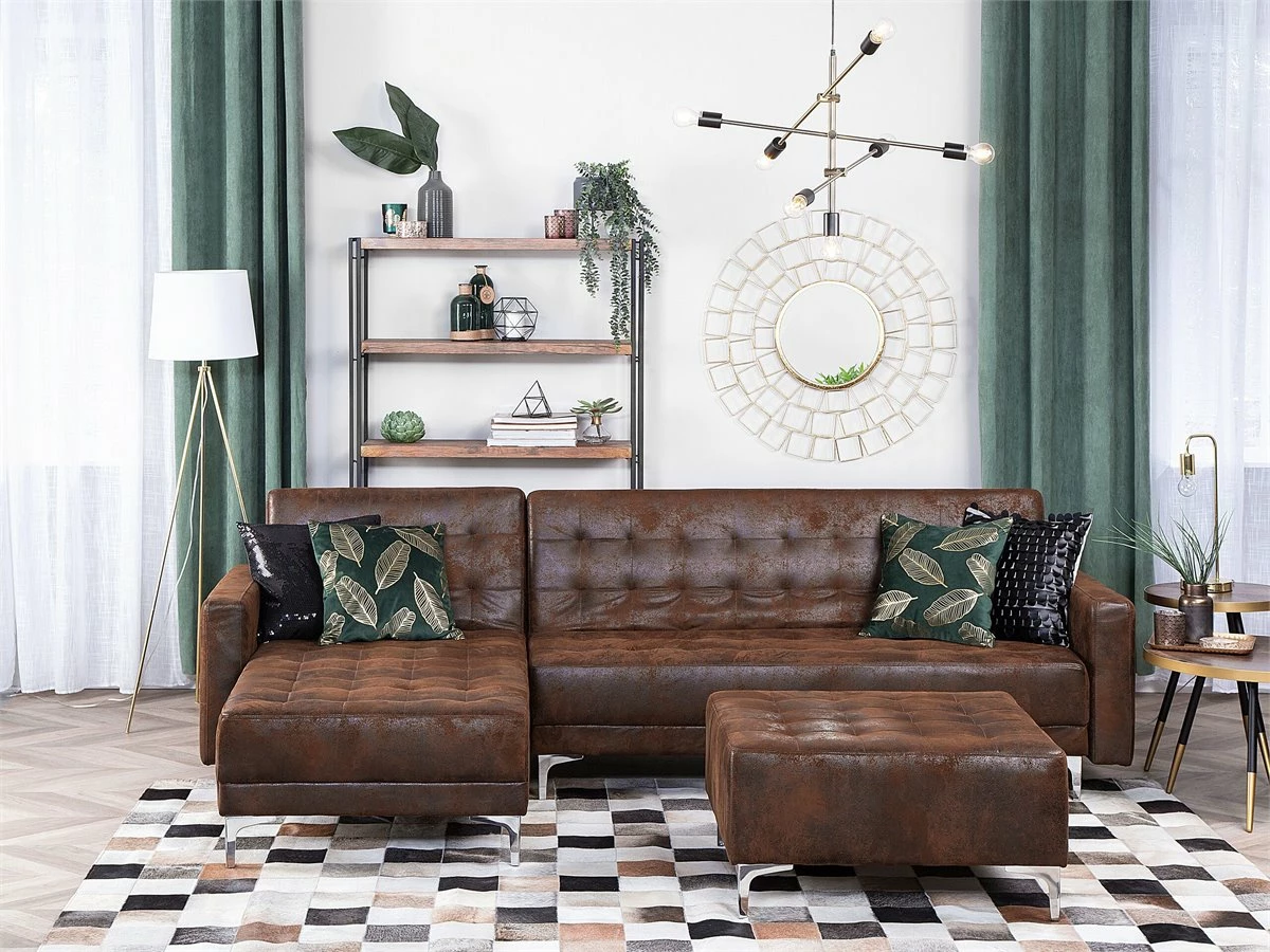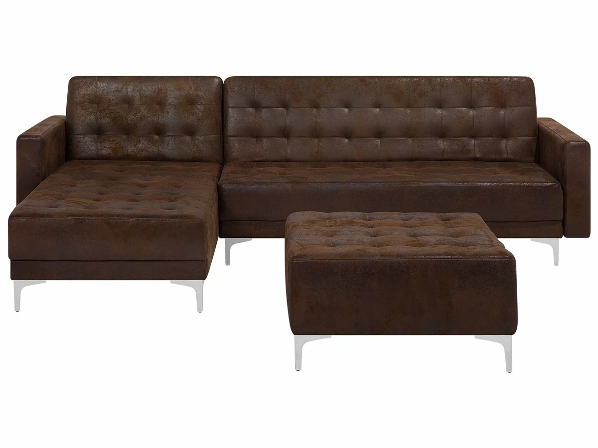 Elegante sofá esquinero con reposapiés. Añade a tu sala de estar este sofá cama esquinero de alta calidad. El acabado se adapta a cualquier esquema de color. Las patas de metal ofrecen la máxima estabilidad. Fácilmente convertible en cama gracias a su respaldo regulable. La otomana garantiza versatilidad y funcionalidad. Detalles: Tipo de Producto: Sofá cama Estilo: Moderno Color: Marrón Tonalidad: Marrón oscuro Tipo de material: Piel sintética Material principal: Piel sintética Material adicional: Metal Material del relleno: Espuma Composición del Material: 100% Poliéster Forma: Forma de L Estilo del apoyabrazo: Estrecho Parte posterior tapizada: Sí Protectores para patas: Sí Piezas modulares: Sí Orientación: Derecha Reclinable: No Fundas de cojín extraíble: No Construcción del asiento: Muelles ondulados Densidad de espuma del asiento: 50 kg/m3 Asientos para: 4 – 6 personas Función para dormir: Sí Mecanismo de abertura del sofa cama: Mecanismo click-clack Almacenamiento: No Dimensiones: Altura del apoyabrazos: 61 cm Profundidad: 168 cm Dimensiones del reposapies: 80x80x41 cm Espesor del asiento: 20 cm Altura del asiento: 41 cm Ancho: 267 cm Altura: 83 cm Superficie del asiento: 241×60 cm Superficie para dormir: 241×108 cm Peso: 90 kg Capacidad de peso por persona: 150 kg La oferta incluye: 1 x Rinconera grande, 1 x Puf Ventajas: Se convierte en cómoda cama, Respaldo ajustable en 3 posiciones, Brinda comodidad y relajación, Confort del asiento óptimo, Diseño elegante, Con un clásico mechón decorativo, Tapicería de piel sintética de alta calidad para un aspecto natural Información de montaje: Requiere montaje parcial. 45-60 min. Información adicional: Para un uso seguro, debe haber un espacio de ~15 cm entre el respaldo y la pared. Consejos de mantenimiento: Piel sintética: 1.Limpie con agua destilada y use limpiadores a base de jabón en las manchas difíciles 2.Aspire con un accesorio adecuado 3.Una vez a la semana, limpie con un paño húmedo y seque después. No engrasar, 4.Use solo limpiadores suaves y acondicionadores dedicados a la piel sintética Metal: 1.Para evitar arañazos, no use limpiadores abrasivos 2.Limpie con un limpiador y un paño suave, seque después 3.Para elementos de cobre o cromados, use agente abrillantador.