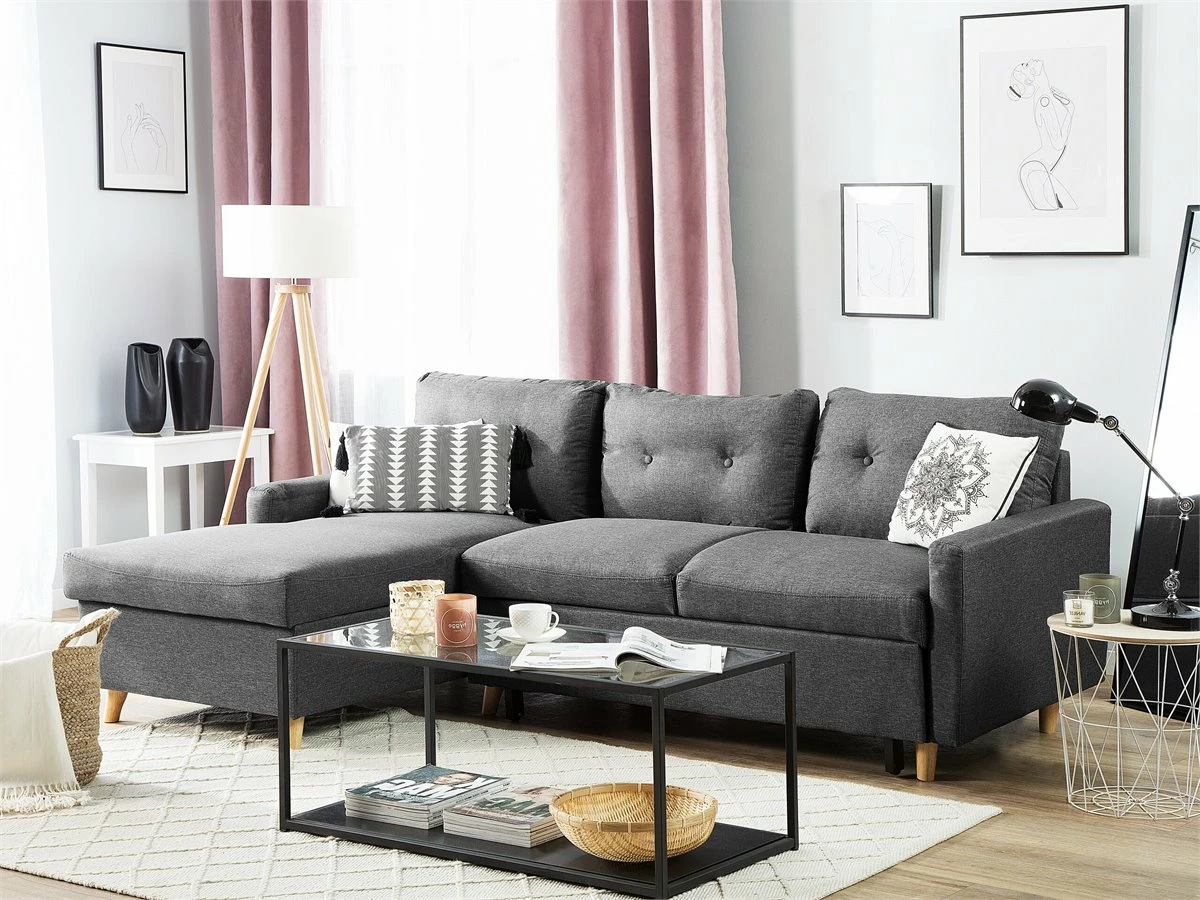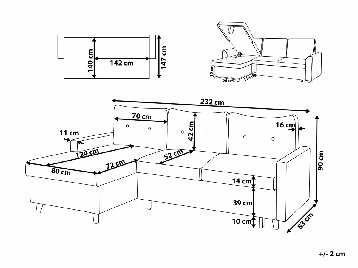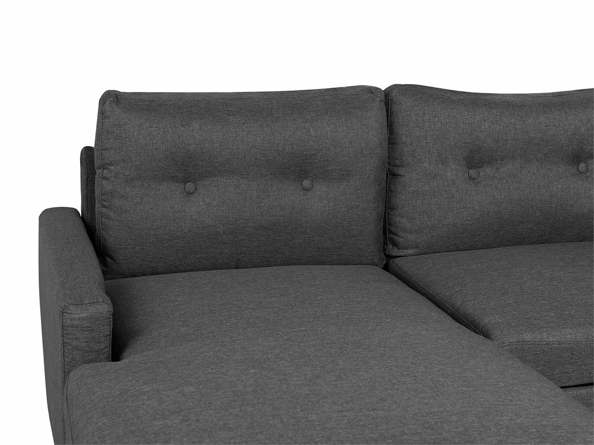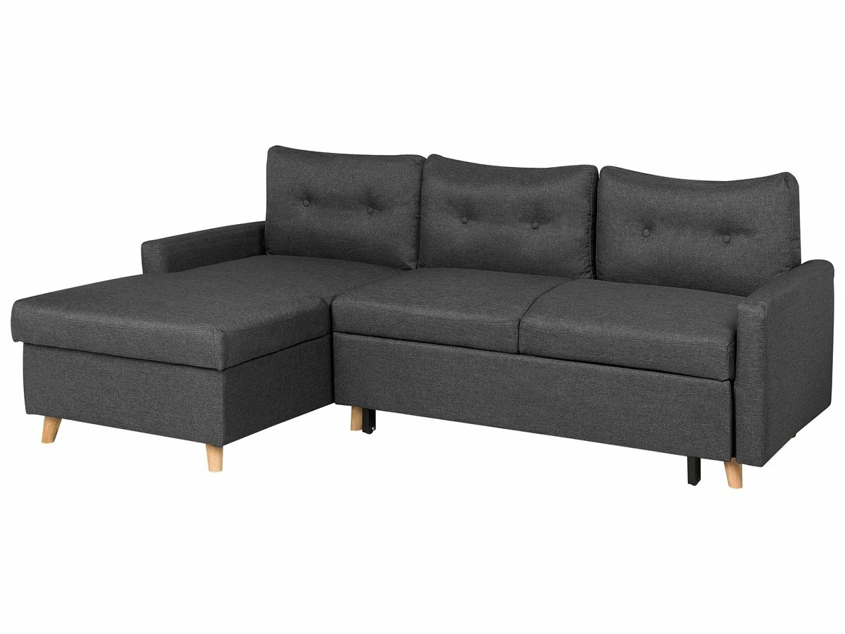 Sofá cama esquinero con almacenaje. Añade a tu sala de estar este sofá esquinero de diseño moderno. Ideal para descansar después de un largo día de trabajo, dar la bienvenida a tus invitados o ver la TV en compañía de tus seres queridos. Está fabricado a partir de poliéster resistente y suave al tacto. Las patas de inspiración escandinava ofrecen estabilidad. Incluye un espacio de almacenaje para guardar las sábanas y los edredones. Fácilmente convertible en cama. Detalles: Tipo de Producto: Sofá esquinero Estilo: Moderno Color: Gris Tonalidad: Gris oscuro Tipo de material: Tejido Material principal: Poliéster Material adicional: Madera de caucho Material del relleno: Espuma Composición del Material: 100% Poliéster Forma: Forma de L Estilo del apoyabrazo: Estrecho Parte posterior tapizada: Sí Protectores para patas: Sí Piezas modulares: No Orientación: Derecha Reclinable: No Fundas de cojín extraíble: Sí Construcción del asiento: Muelles ondulados Densidad de espuma del asiento: 45 kg/m3 Asientos para: 4 – 6 personas Función para dormir: Sí Mecanismo de abertura del sofa cama: Tracción Almacenamiento: Sí Dimensiones: Altura del apoyabrazos: 75 cm Profundidad: 147 cm Espesor del asiento: 14 cm Altura del asiento: 53 cm Ancho: 232 cm Altura: 90 cm Superficie del asiento: 210×52 cm Superficie para dormir: 124×209 cm Peso: 95 kg Capacidad de peso por persona: 150 kg La oferta incluye: 1 x Sofá esquinero Ventajas: Se convierte en cómoda cama, Extremadamente cómodo, Espaciosa superficie para dormir, Diseño moderno, Acolchado de alta calidad, Espacio de almacenaje adicional Información de montaje: Requiere montaje completo. 45-60 min. Consejos de mantenimiento: Poliéster: 1.Aspire con un accesorio adecuado 2.Limpiar con champú seco y una esponja húmeda o un limpiador suave. Madera de caucho: 1.Limpie con un limpiador y un paño suave en la dirección del grano 2.Los muebles con acabado de aceite deben engrasarse una vez al año, 3.Seque inmediatamente después de limpiar. para evitar que se acumule agua en los muebles.