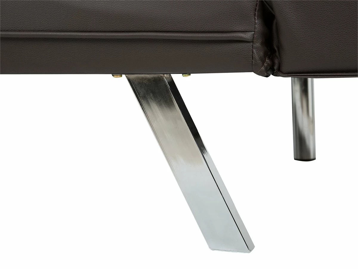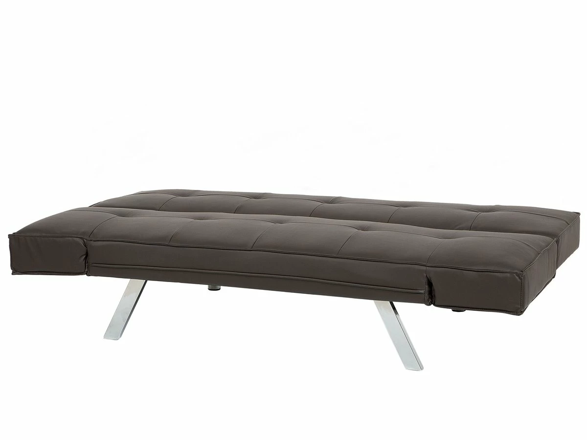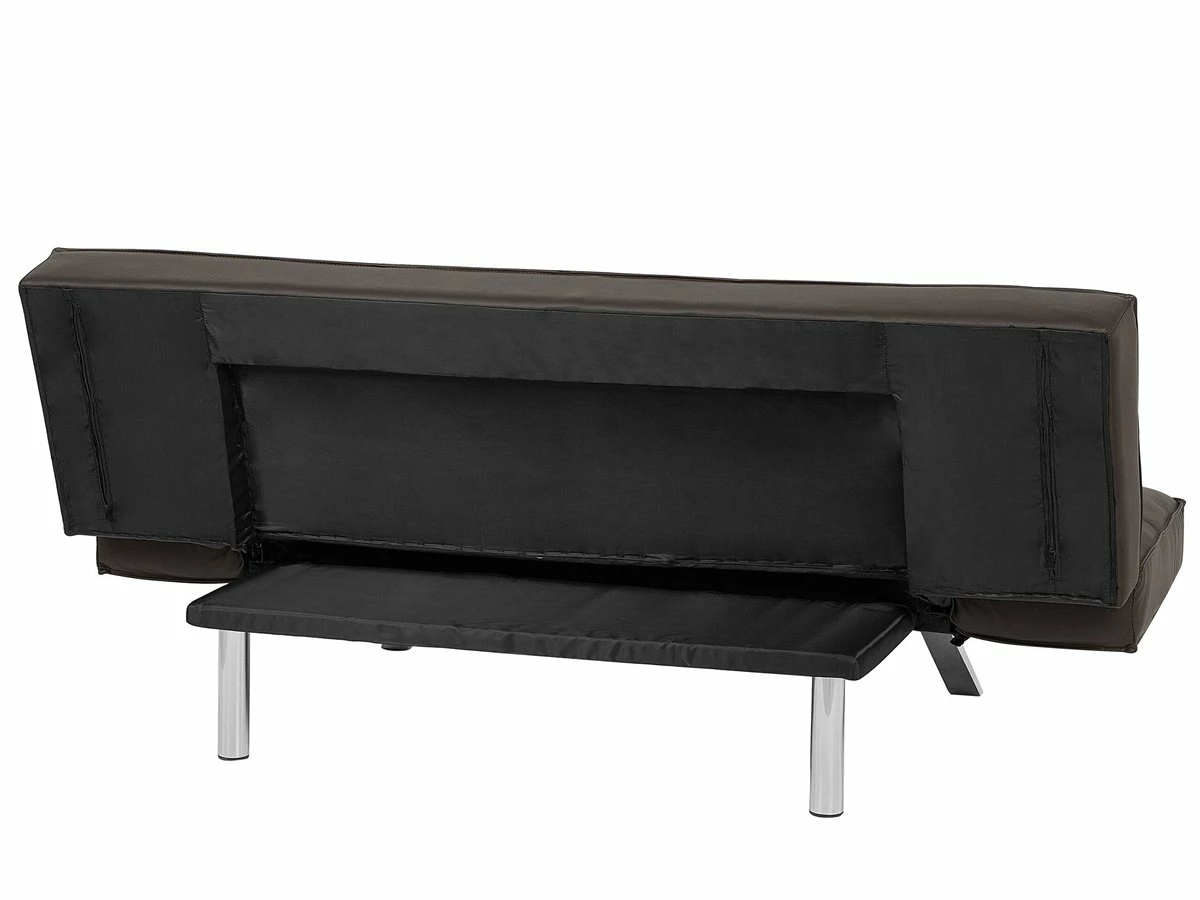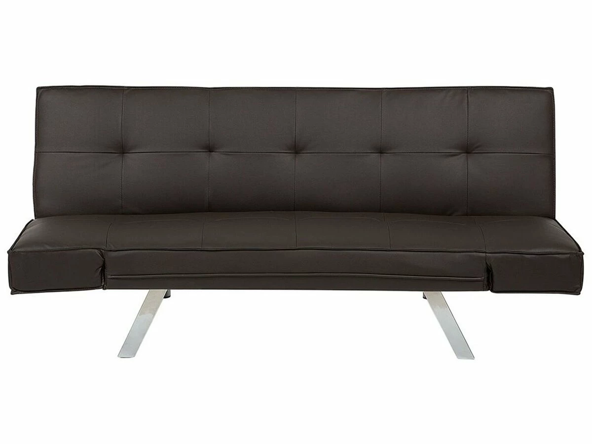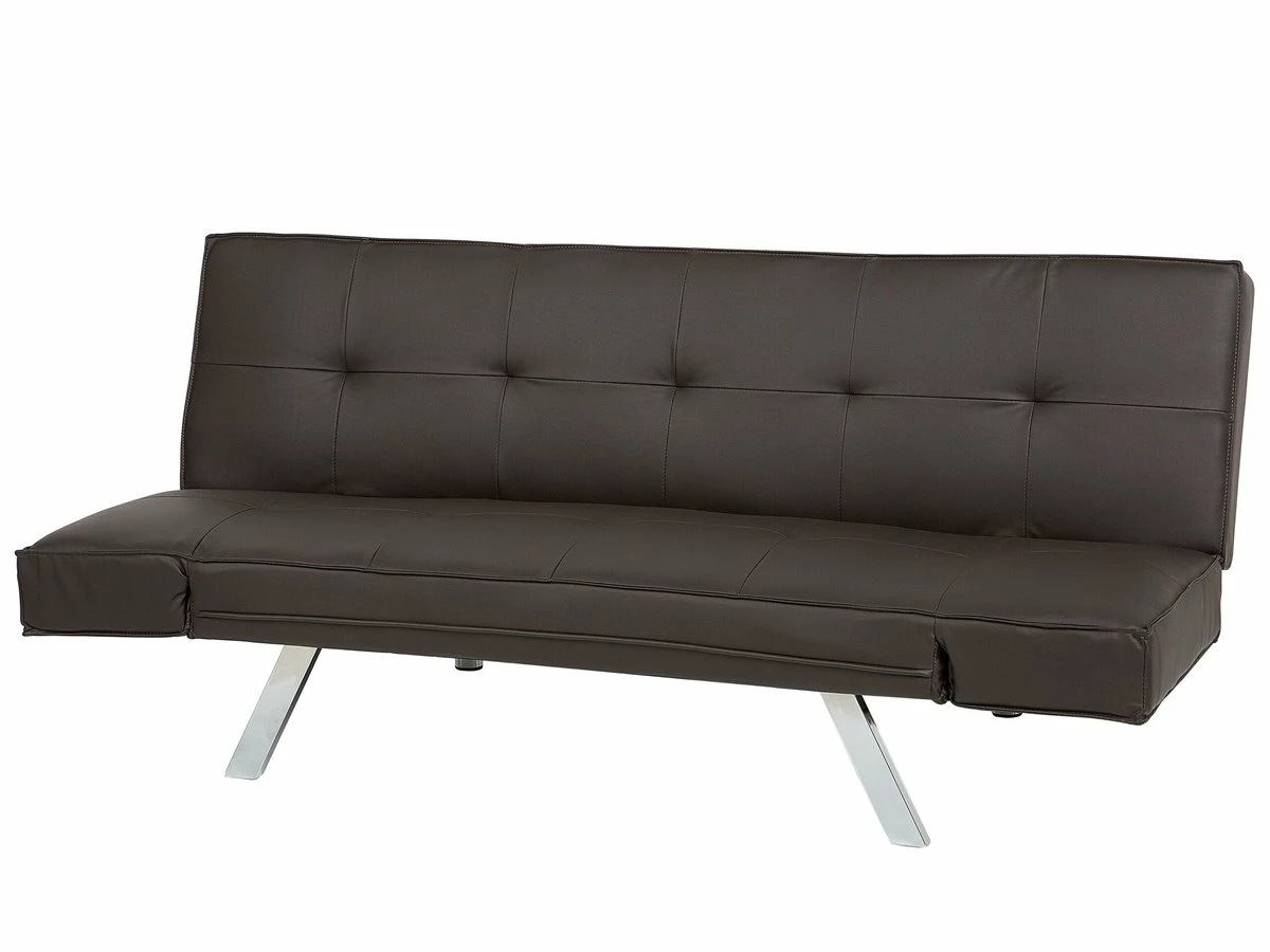 Cómodo sofá de piel sintética con función para dormir. Este sofá cama funcional combina bien con un interior moderno o minimalista. Está fabricado a partir de piel sintética de primera calidad. Su diseño compacto es ideal para cualquier sala de estar de dimensiones reducidas. Las patas de metal aportan un toque retro al sofá. Fácilmente convertible en cama. Detalles: Tipo de Producto: Sofá de 3 plazas Estilo: Moderno Color: Marrón Tonalidad: Marrón oscuro Tipo de material: Piel sintética Material principal: Piel sintética Material adicional: Metal Material del relleno: Espuma Composición del Material: 100% Poliéster Estilo del apoyabrazo: Ajustable Parte posterior tapizada: Sí Protectores para patas: No Reclinable: No Fundas de cojín extraíble: No Construcción del asiento: Muelles ondulados Densidad de espuma del asiento: 50 kg/m3 Asientos para: 3 personas Función para dormir: Sí Mecanismo de abertura del sofa cama: Mecanismo click-clack Almacenamiento: No Dimensiones: Altura del apoyabrazos: 63 cm Profundidad: 74 cm Espesor del asiento: 15 cm Altura del asiento: 39 cm Ancho: 180 cm Altura: 84 cm Superficie del asiento: 106×55 cm Superficie para dormir: 110×180 cm Peso: 38 kg Capacidad de peso por persona: 84 kg La oferta incluye: 1 x Sofá Ventajas: Se convierte en cómoda cama, Ancha superficie del asiento, Diseño atemporal, Brinda un toque acogedor a cualquier habitación, Acolchado de alta calidad, Mantenimiento sencillo, Apoyabrazos ajustables Información de montaje: Requiere montaje de las patas. 5-15 min. Información adicional: Los reposabrazos ajustables también se pueden usar como reposacabezas para dormir. No se recomienda utilizar el reposabrazos para sentarse. Consejos de mantenimiento: Piel sintética: 1.Limpie con agua destilada y use limpiadores a base de jabón en las manchas difíciles 2.Aspire con un accesorio adecuado 3.Una vez a la semana, limpie con un paño húmedo y seque después. No engrasar, 4.Use solo limpiadores suaves y acondicionadores dedicados a la piel sintética Metal: 1.Para elementos de cobre o cromados, use agente abrillantador 2.Para evitar arañazos, no use limpiadores abrasivos 3.Limpie con un limpiador y un paño suave, seque después.