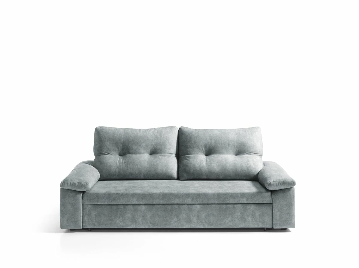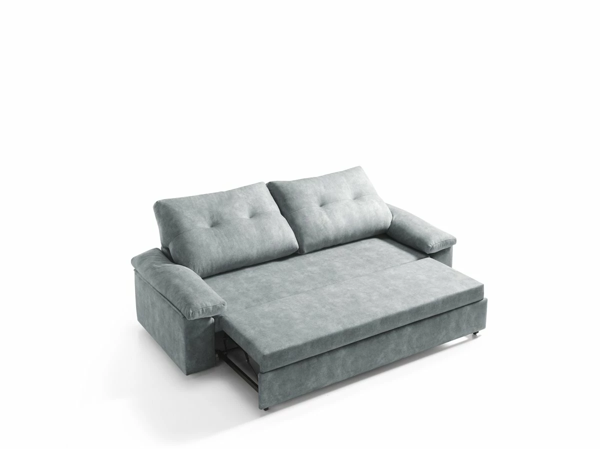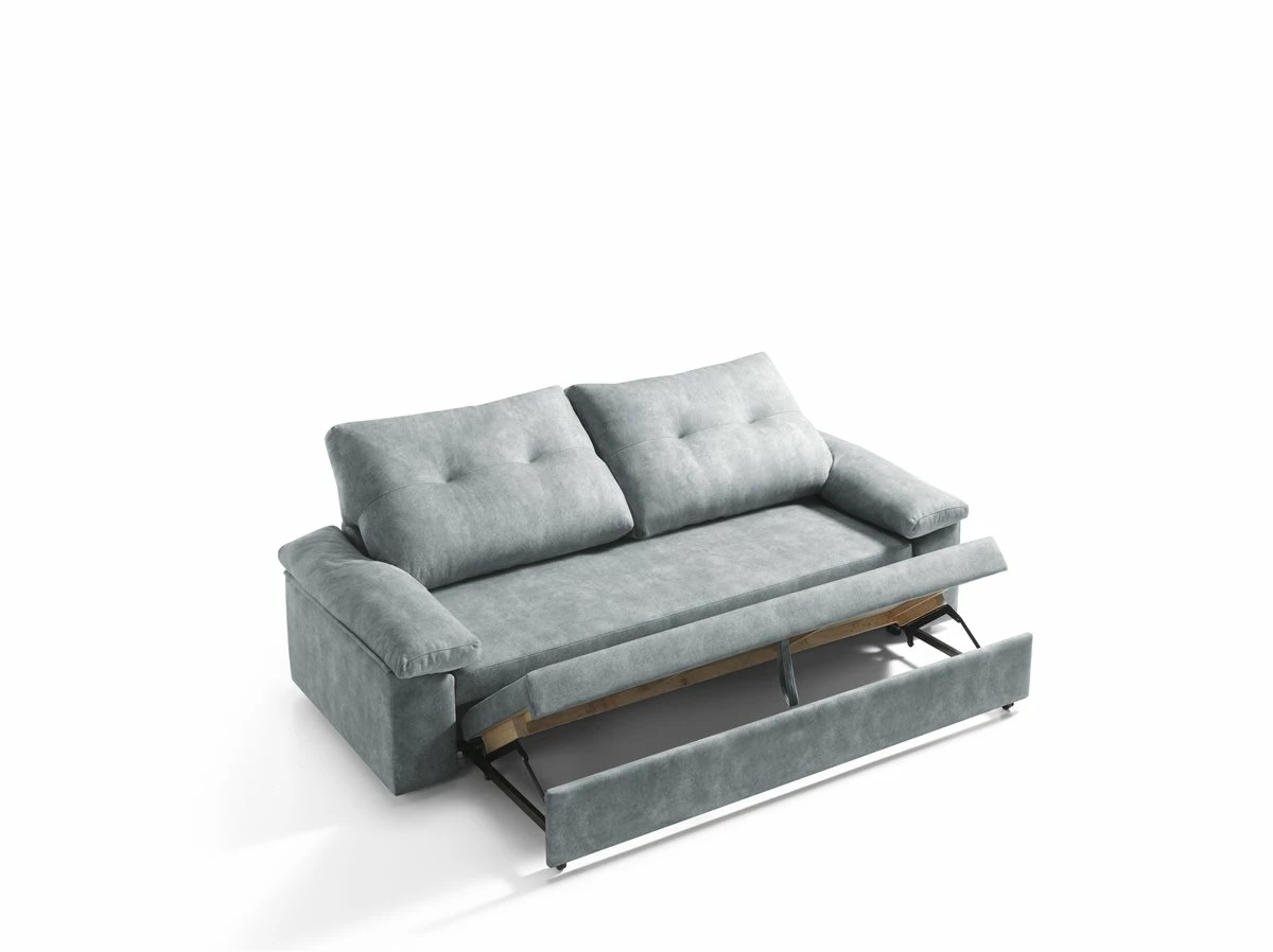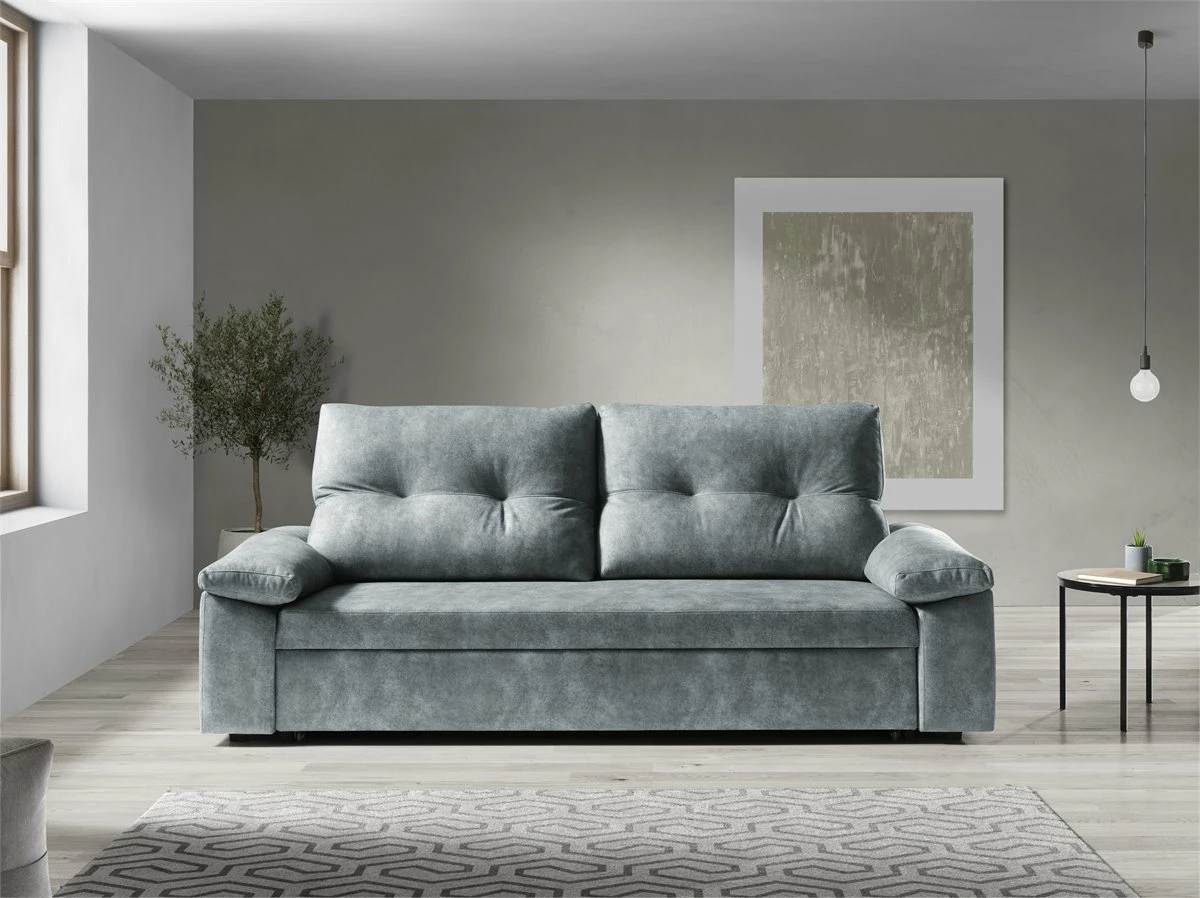 Sofa cama MIXX color gris . Estructura en madera maciza y tablero de partículas. Bastidor de madera y muelle de acero. Relleno de asientos goma de 28 kg. Relleno de respaldo con fibra hueca 100% . Patas PVC negras. Almohadas de respaldos y brazos desenfundables. Cama sistema fácil apertura de 190 x 110 cms.