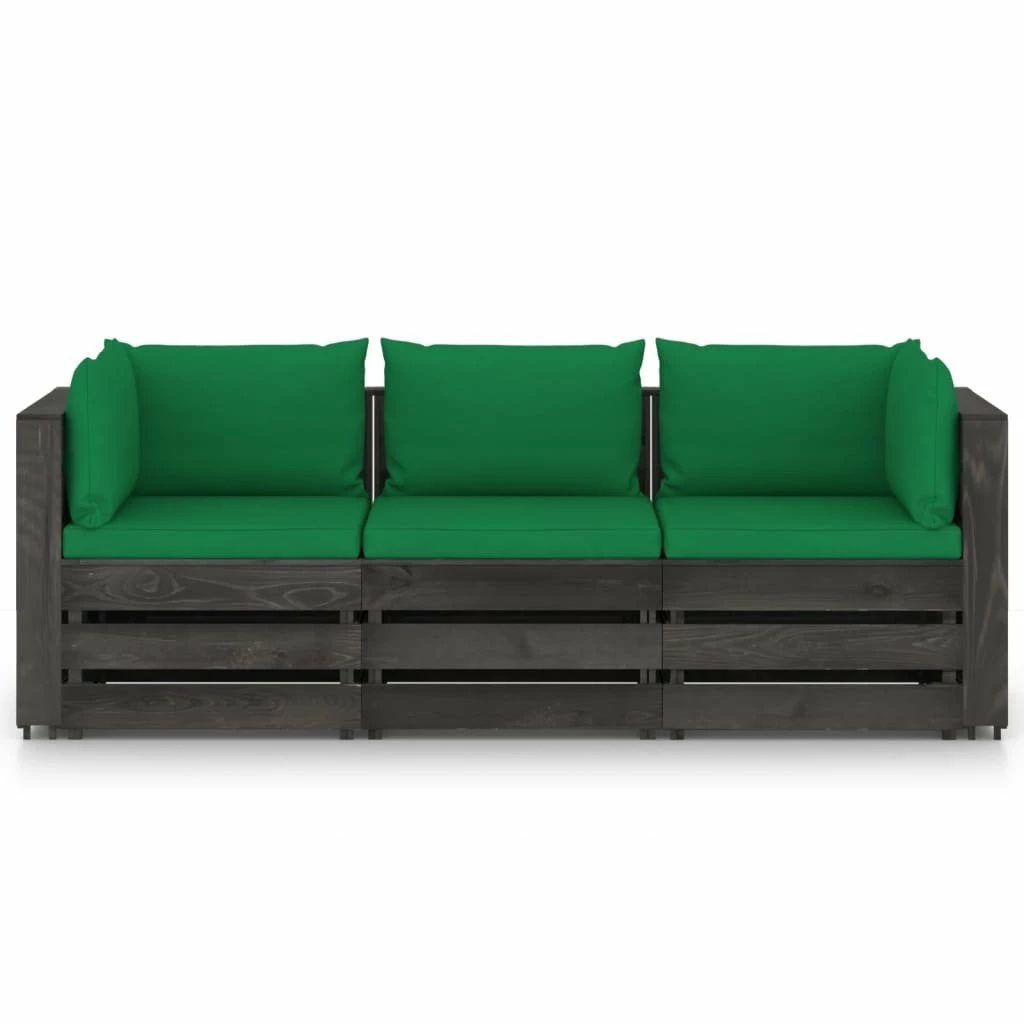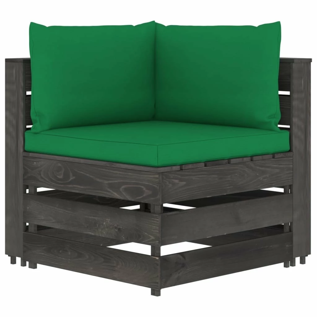 Este sofá de jardín de 3 plazas es una opción ideal para relajarte y disfrutar del buen tiempo, echar una siesta o charlar con tu familia o amigos. Con un diseño de palés atemporal, el sofá de madera agregará un toque de encanto rústico a tu patio, jardín o sala de estar. Hecho de madera de pino impregnada, el sofá de palés es duradero, resistente a la intemperie y respetuoso con el medio ambiente. Este sofá de exterior tiene una estructura maciza y requiere poco mantenimiento. Con cojines blandos y bien acolchados (no incluidos, el asiento de jardín te brinda la máxima comodidad. Nota: Para prolongar la vida útil de los muebles de exterior, te recomendamos que los limpies con regularidad y no los dejes al aire libre sin protección innecesariamente.Limpieza: Usa una solución de jabón suave.Almacenamiento: Si es posible, guarda el producto en un lugar fresco y seco en el interior. Si el producto se almacena al aire libre, protégelo con una funda impermeable. Limpia y seca el exceso de agua o nieve de las superficies planas después de una lluvia o nevada. Permite la ventilación para evitar daños relacionados con la humedad. Color de los cojines: VerdeMaterial: Madera de pino impregnada de grisMaterial del cojín: Tela (100% poliésterDimensiones de sofá esquinero: 69 x 70 x 66 cm (ancho x profundo x altoDimensiones del sofá central: 60 x 70 x 66 cm (ancho x profundo x altoGrosor del cojín del asiento: 6 cmGrosor del cojín del respaldo/lateral: 13 cmRequiere montaje: SíLa entrega incluye:1 x Sofá central2 x Sofás de esquina3 x Cojines de asiento5 x Cojines de respaldo/laterales