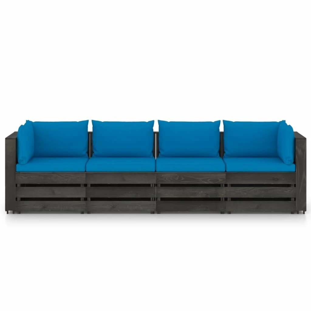 Este sofá de jardín de 4 plazas es una opción ideal para relajarte y disfrutar del buen tiempo, echar una siesta o charlar con tu familia o amigos. Con un diseño de palés atemporal, el sofá de madera agregará un toque de encanto rústico a tu patio, jardín o sala de estar. Hecho de madera de pino impregnada, el sofá de palés es duradero, resistente a la intemperie y respetuoso con el medio ambiente. Este sofá de exterior tiene una estructura maciza y requiere poco mantenimiento. Con cojines blandos y bien acolchados (no incluidos, el asiento de jardín te brinda la máxima comodidad. Nota: Para prolongar la vida útil de los muebles de exterior, te recomendamos que los limpies con regularidad y no los dejes al aire libre sin protección innecesariamente.Limpieza: Usa una solución de jabón suave.Almacenamiento: Si es posible, guarda el producto en un lugar fresco y seco en el interior. Si el producto se almacena al aire libre, protégelo con una funda impermeable. Limpia y seca el exceso de agua o nieve de las superficies planas después de una lluvia o nevada. Permite la ventilación para evitar daños relacionados con la humedad. Color del cojín: Beige claroMaterial: Madera de pino impregnada de grisMaterial del cojín: Tela (100% poliésterDimensiones de sofá esquinero: 69 x 70 x 66 cm (ancho x profundo x altoDimensiones del sofá central: 60 x 70 x 66 cm (ancho x profundo x altoGrosor del cojín del asiento: 6 cmGrosor del cojín del respaldo/lateral: 13 cmRequiere montaje: SíLa entrega incluye:2 x Sofás centrales2 x Sofás de esquina4 x Cojines de asiento6 x Cojines de respaldo/laterales
