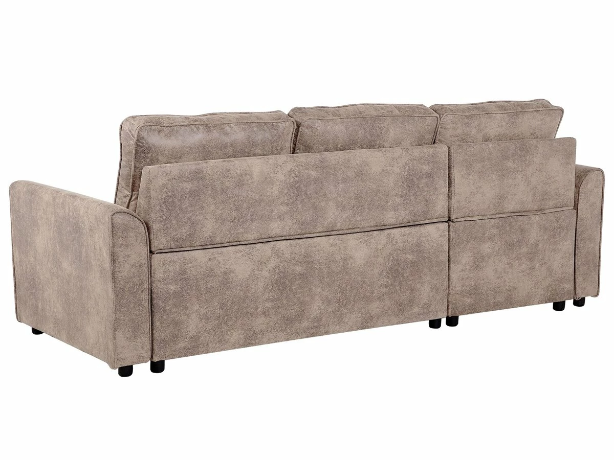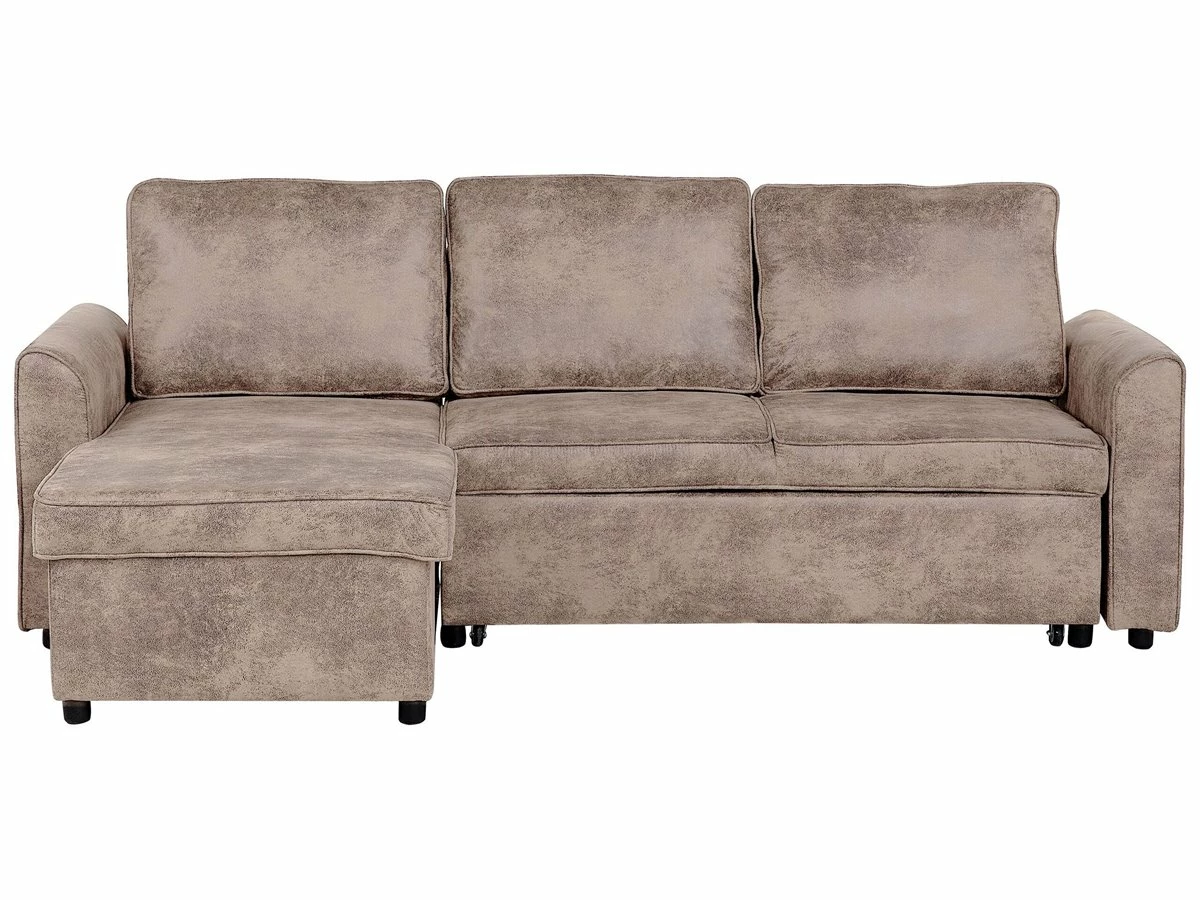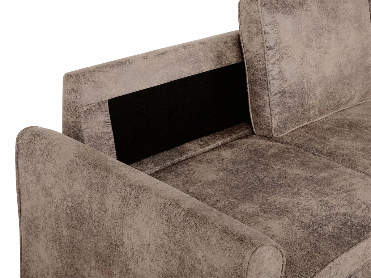 Cómodo sofá esquinero con almacenaje. Añade a tu sala de estar este sofá esquinero de diseño moderno. Está fabricado a partir de piel sintética de alta calidad. Los asientos acolchados y los cojines de respaldo con funda extraíble ofrecen la máxima comodidad. Las patas de metal garantizan estabilidad. Incluye un espacio de almacenaje para guardar las sábanas y los edredones. Fácilmente convertible en cama. Detalles: Tipo de Producto: Sofá esquinero Estilo: Moderno Color: Marrón Tonalidad: Marrón claro Tipo de material: Piel sintética Material principal: Piel sintética Material adicional: Material sintético Material del relleno: Espuma Composición del Material: 100% Poliéster Forma: Forma de L Estilo del apoyabrazo: Estrecho Apoyabrazo: Sí Parte posterior tapizada: Sí Protectores para patas: No Piezas modulares: No Orientación: Derecha Reclinable: No Fundas de cojín extraíble: Sí Construcción del asiento: Muelles ondulados Densidad de espuma del asiento: 50 kg/m3 Asientos para: 3 personas Función para dormir: Sí Mecanismo de abertura del sofa cama: Tracción Almacenamiento: Sí Dimensiones: Altura del apoyabrazos: 54 cm Profundidad: 145 cm Espesor del asiento: 12 cm Altura del asiento: 42 cm Ancho: 228 cm Altura: 84 cm Superficie del asiento: 200×51 cm Superficie para dormir: 200×111 cm Peso: 87 kg Capacidad de peso por persona: 150 kg La oferta incluye: 1 x Sofá esquinero Ventajas: Se convierte en cómoda cama, El grueso acolchado del asiento brinda comodidad, Diseño atemporal, Acolchado de alta calidad, Fabricación sólida y precisa, Práctico espacio de almacenaje para todos tus accesorios, Fundas extraíbles, Completamente tapizado Información de montaje: Requiere montaje parcial. 20-40 min. Consejos de mantenimiento: Poliéster: 1.Limpiar con champú seco y una esponja húmeda o un limpiador suave 2.Aspire con un accesorio adecuado.