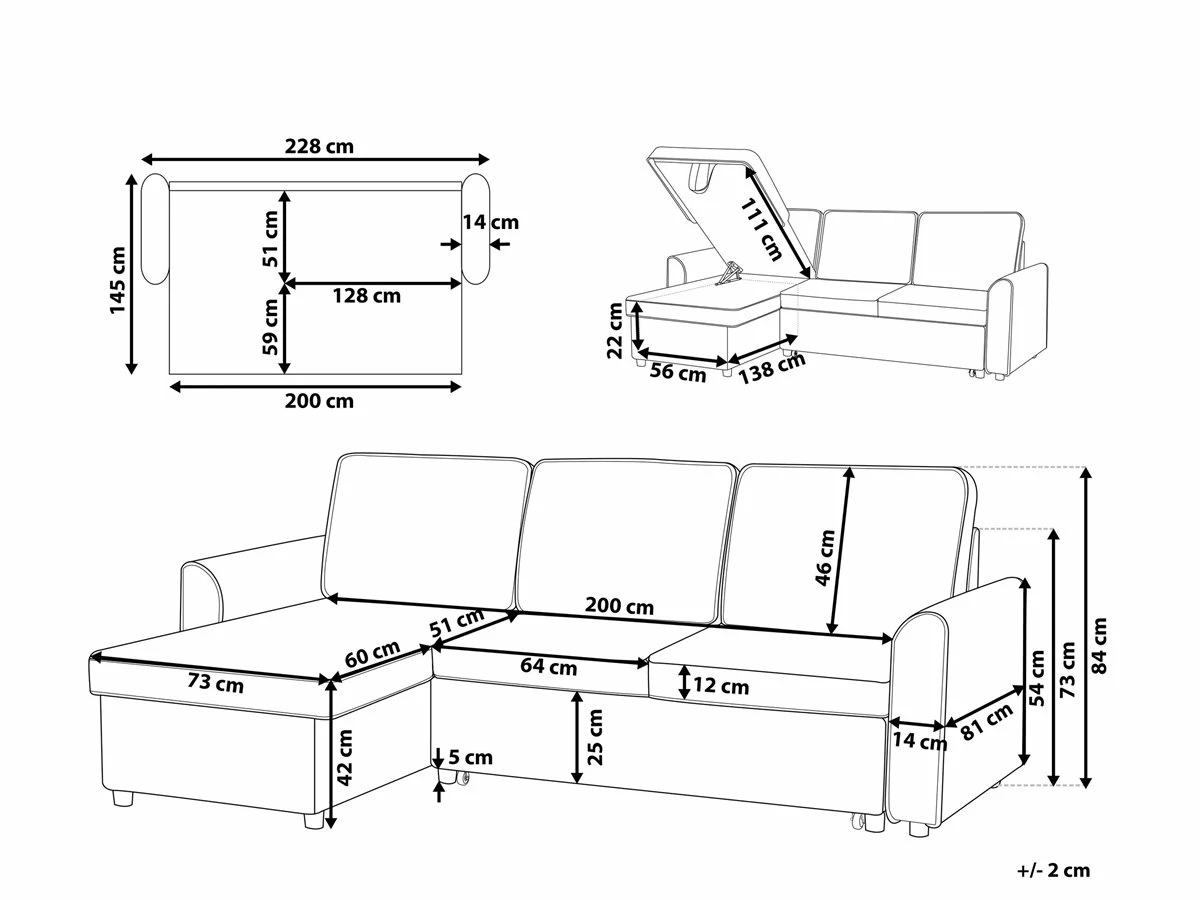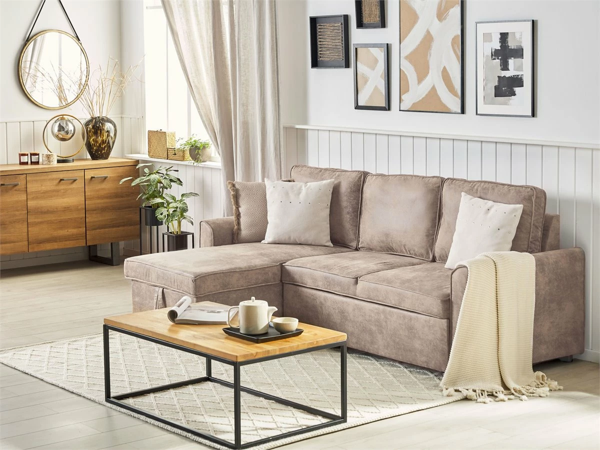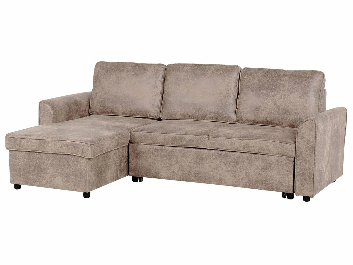 Cómodo sofá esquinero con almacenaje. Añade a tu sala de estar este sofá esquinero de diseño moderno. Está fabricado a partir de piel sintética de alta calidad. Los asientos acolchados y los cojines de respaldo con funda extraíble ofrecen la máxima comodidad. Las patas de metal garantizan estabilidad. Incluye un espacio de almacenaje para guardar las sábanas y los edredones. Fácilmente convertible en cama. Detalles: Tipo de Producto: Sofá esquinero Estilo: Moderno Color: Marrón Tonalidad: Marrón claro Tipo de material: Piel sintética Material principal: Piel sintética Material adicional: Material sintético Material del relleno: Espuma Composición del Material: 100% Poliéster Forma: Forma de L Estilo del apoyabrazo: Estrecho Apoyabrazo: Sí Parte posterior tapizada: Sí Protectores para patas: No Piezas modulares: No Orientación: Derecha Reclinable: No Fundas de cojín extraíble: Sí Construcción del asiento: Muelles ondulados Densidad de espuma del asiento: 50 kg/m3 Asientos para: 3 personas Función para dormir: Sí Mecanismo de abertura del sofa cama: Tracción Almacenamiento: Sí Dimensiones: Altura del apoyabrazos: 54 cm Profundidad: 145 cm Espesor del asiento: 12 cm Altura del asiento: 42 cm Ancho: 228 cm Altura: 84 cm Superficie del asiento: 200×51 cm Superficie para dormir: 200×111 cm Peso: 87 kg Capacidad de peso por persona: 150 kg La oferta incluye: 1 x Sofá esquinero Ventajas: Se convierte en cómoda cama, El grueso acolchado del asiento brinda comodidad, Diseño atemporal, Acolchado de alta calidad, Fabricación sólida y precisa, Práctico espacio de almacenaje para todos tus accesorios, Fundas extraíbles, Completamente tapizado Información de montaje: Requiere montaje parcial. 20-40 min. Consejos de mantenimiento: Poliéster: 1.Limpiar con champú seco y una esponja húmeda o un limpiador suave 2.Aspire con un accesorio adecuado.
