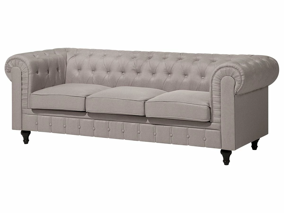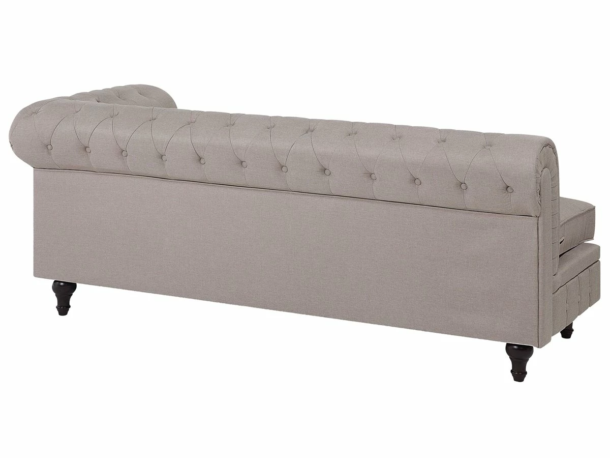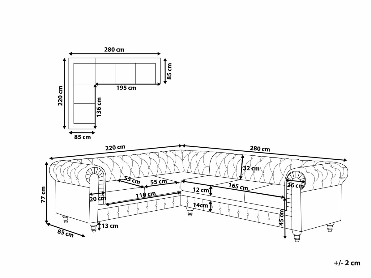 Elegante sofá esquinero estilo Chesterfield en color beige. Este sofá esquinero de estilo Chesterfield se adapta a cualquier interior moderno o tradicional. El respaldo bajo y los cojines de asiento acolchados proporcionan la máxima comodidad. El asiento presenta un acolchado con botones. Sofá de diseño inglés de fácil mantenimiento que encaja bien con cualquier estilo de decoración. Detalles: Tipo de Producto: Sofá Chesterfield Estilo: Tradicional Color: Beige Tipo de material: Tejido Material principal: Poliéster Material adicional: Madera de eucalipto Material del relleno: Espuma Composición del Material: 100% Poliéster Forma: Forma de L Estilo del apoyabrazo: Redondeado Apoyabrazo: Sí Parte posterior tapizada: Sí Orientación: Derecha Diseño: Sólido Construcción del asiento: Muelles ondulados Densidad de espuma del asiento: 28 kg/m3 Asientos para: 4 – 6 personas Dimensiones: Altura del apoyabrazos: 77 cm Profundidad: 85 cm Espesor del asiento: 12 cm Altura del asiento: 45 cm Ancho: 280 cm Altura: 77 cm Superficie del asiento: 228×55 cm Peso: 91 kg Capacidad de peso por persona: 150 kg La oferta incluye: 1 x Sofá esquinero Ventajas: Ancha superficie del asiento, Cómodos apoyabrazos, El grueso acolchado del asiento brinda comodidad, Aspecto elegante estilo Chesterfield, Construcción muy estable, Fundas extraíbles, Completamente tapizado, Patas con tapas antideslizantes de seguridad Información de montaje: Requiere montaje de las patas. 5-15 min. Consejos de mantenimiento: Poliéster: 1.Limpiar con champú seco y una esponja húmeda o un limpiador suave 2.Aspire con un accesorio adecuado. Madera de eucalipto: 1.Limpie con un limpiador y un paño suave en la dirección del grano 2.Los muebles con acabado de aceite deben engrasarse una vez al año, 3.Seque inmediatamente después de limpiar. para evitar que se acumule agua en los muebles.