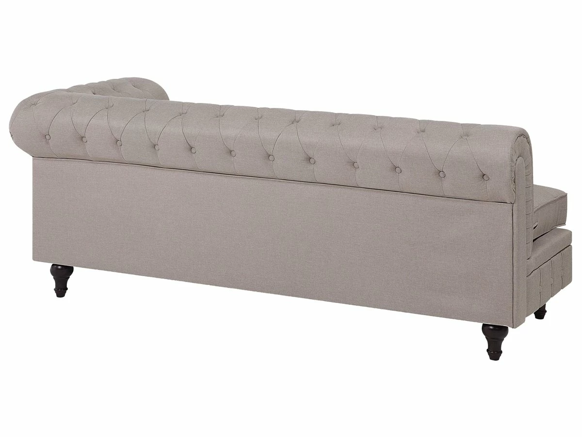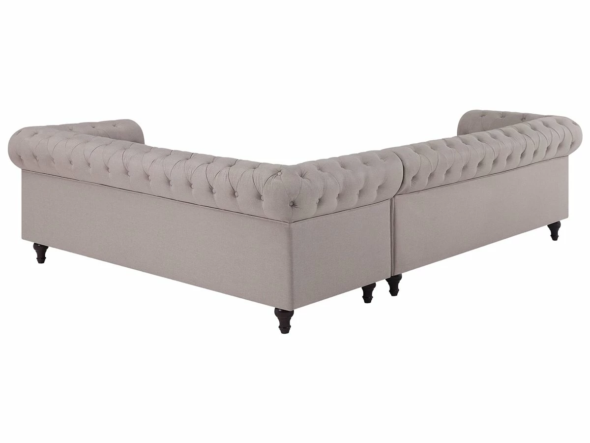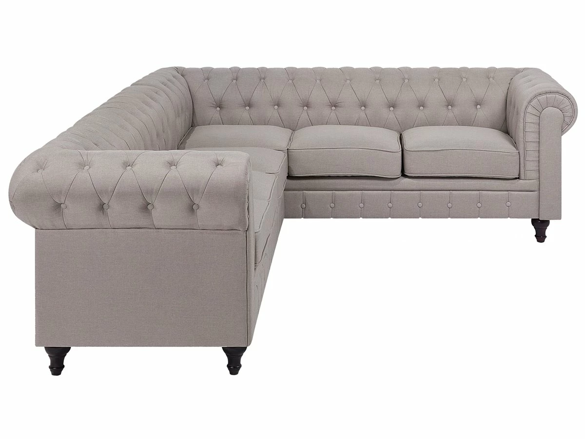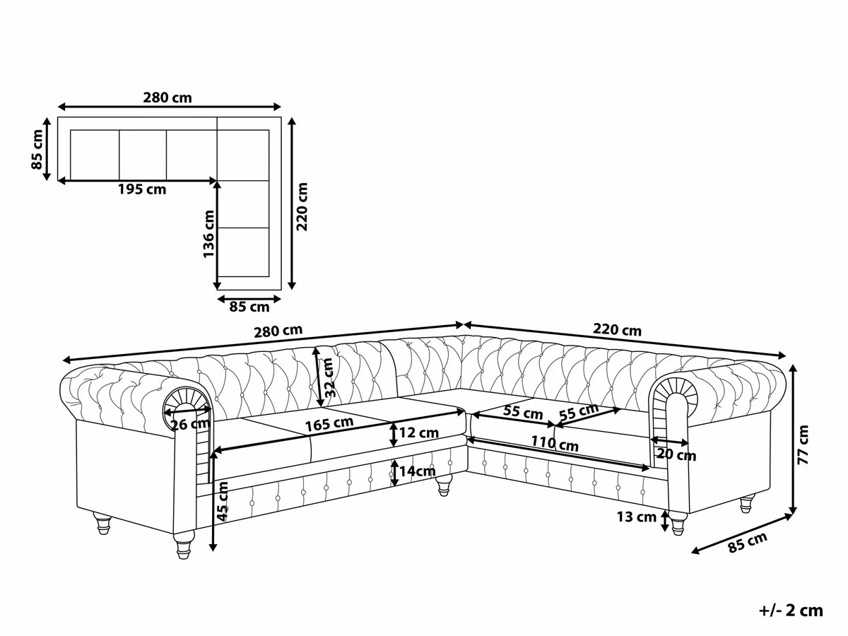 Elegante sofá esquinero estilo Chesterfield en color beige. Este sofá esquinero de estilo Chesterfield se adapta a cualquier interior moderno o tradicional. El respaldo bajo y los cojines de asiento acolchados proporcionan la máxima comodidad. El asiento presenta un acolchado con botones. Sofá de diseño inglés de fácil mantenimiento que encaja bien con cualquier estilo de decoración. Detalles: Tipo de Producto: Sofá Chesterfield Estilo: Tradicional Color: Beige Tipo de material: Tejido Material principal: Poliéster Material adicional: Madera de eucalipto Material del relleno: Espuma Composición del Material: 100% Poliéster Forma: Forma de L Estilo del apoyabrazo: Redondeado Apoyabrazo: Sí Parte posterior tapizada: Sí Orientación: Izquierda Diseño: Sólido Construcción del asiento: Muelles ondulados Densidad de espuma del asiento: 28 kg/m3 Asientos para: 4 – 6 personas Dimensiones: Altura del apoyabrazos: 77 cm Profundidad: 85 cm Espesor del asiento: 12 cm Altura del asiento: 45 cm Ancho: 280 cm Altura: 77 cm Superficie del asiento: 228×55 cm Peso: 91 kg Capacidad de peso por persona: 150 kg La oferta incluye: 1 x Sofá esquinero Ventajas: Ancha superficie del asiento, Cómodos apoyabrazos, El grueso acolchado del asiento brinda comodidad, Aspecto elegante estilo Chesterfield, Construcción muy estable, Fundas extraíbles, Completamente tapizado, Patas con tapas antideslizantes de seguridad Información de montaje: Requiere montaje de las patas. 5-15 min. Consejos de mantenimiento: Poliéster: 1.Aspire con un accesorio adecuado 2.Limpiar con champú seco y una esponja húmeda o un limpiador suave. Madera de eucalipto: 1.Seque inmediatamente después de limpiar. para evitar que se acumule agua en los muebles 2.Limpie con un limpiador y un paño suave en la dirección del grano 3.Los muebles con acabado de aceite deben engrasarse una vez al año