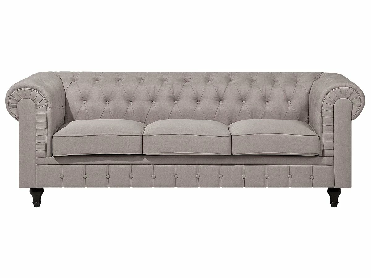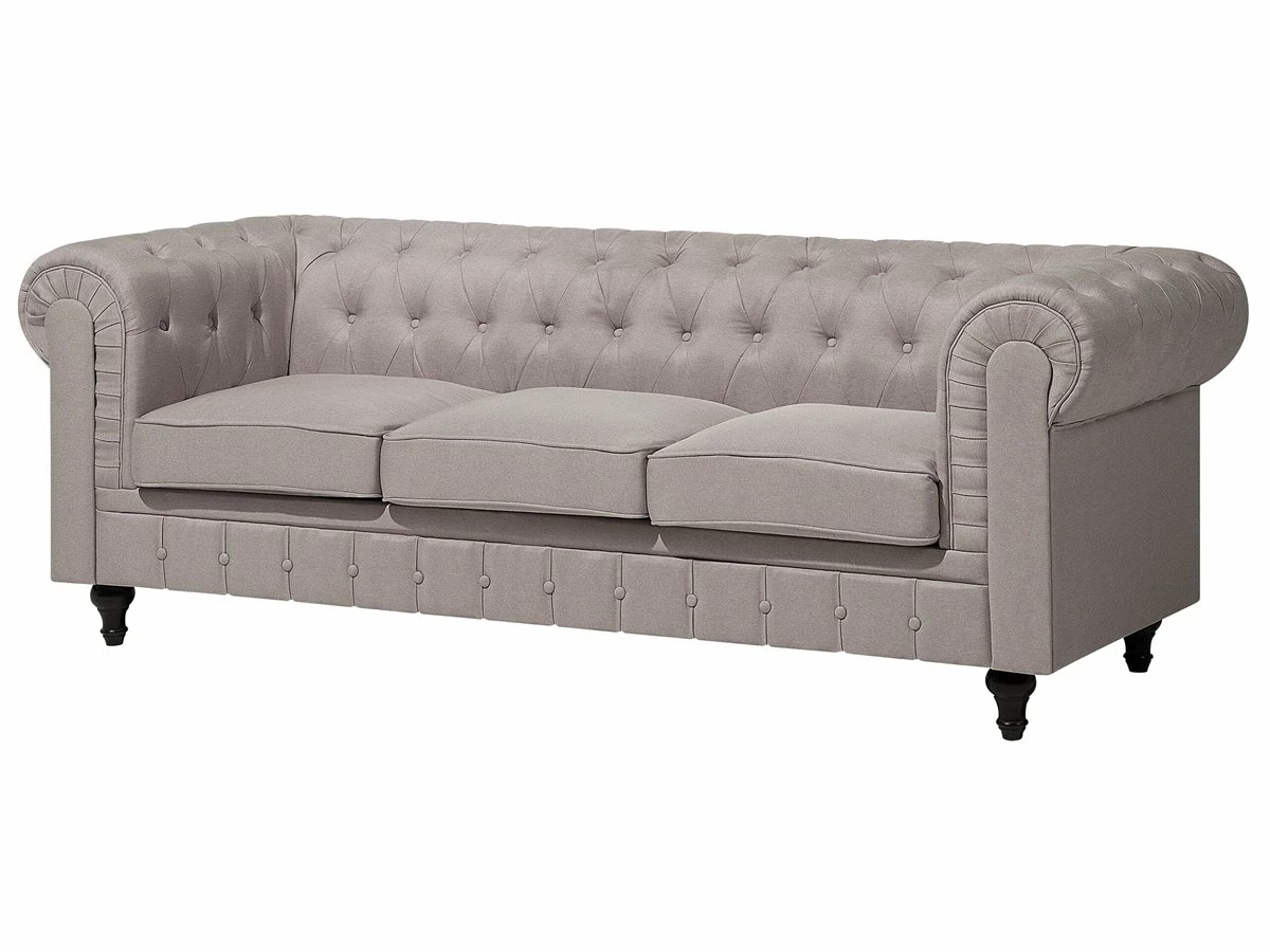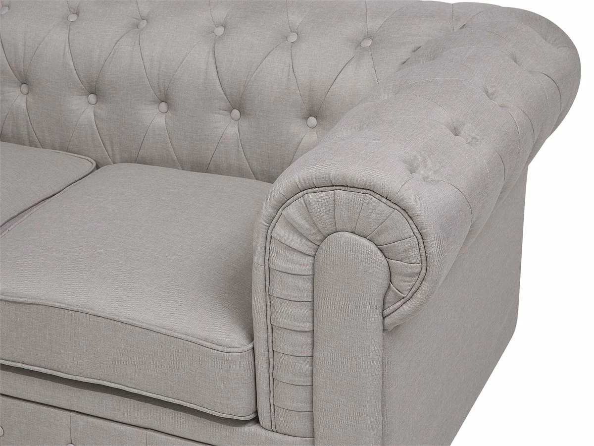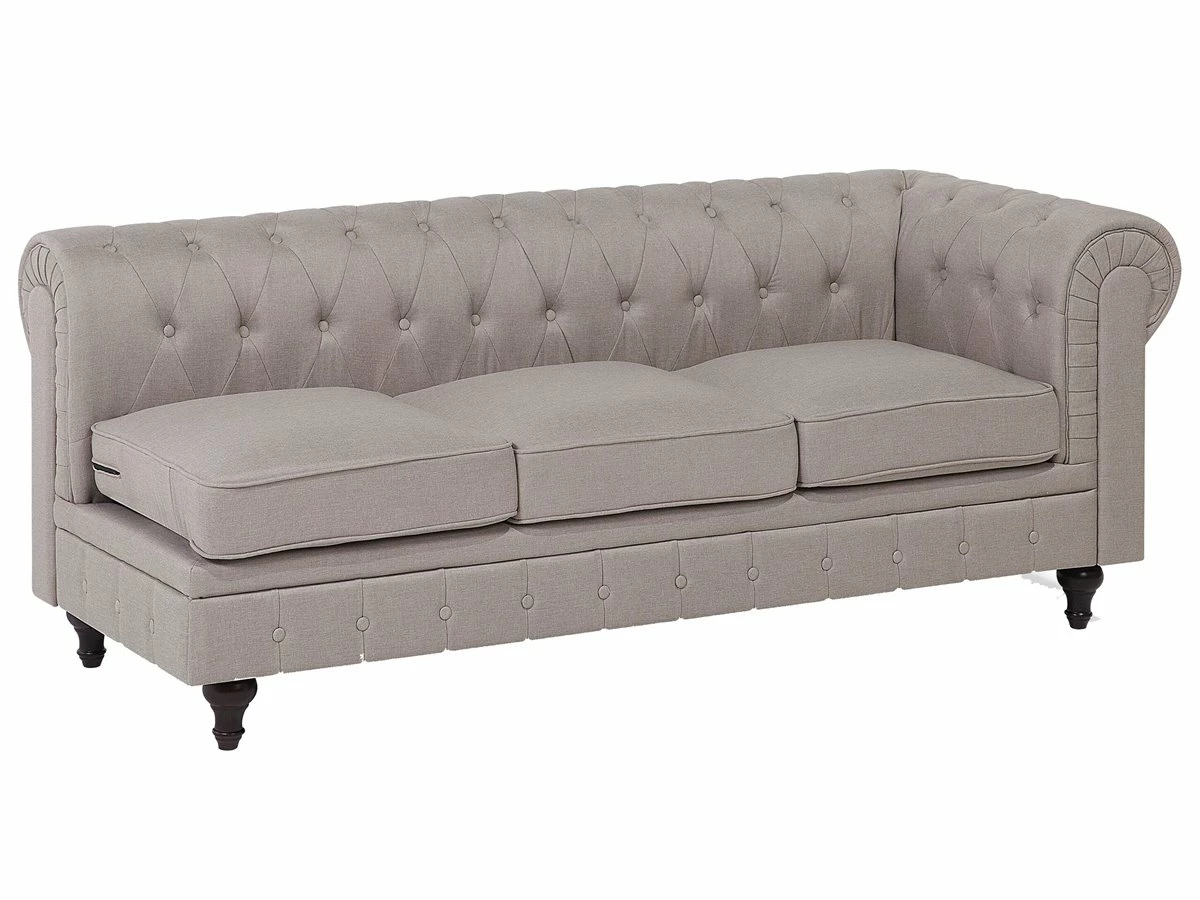 Elegante sofá esquinero estilo Chesterfield en color beige. Este sofá esquinero de estilo Chesterfield se adapta a cualquier interior moderno o tradicional. El respaldo bajo y los cojines de asiento acolchados proporcionan la máxima comodidad. El asiento presenta un acolchado con botones. Sofá de diseño inglés de fácil mantenimiento que encaja bien con cualquier estilo de decoración. Detalles: Tipo de Producto: Sofá Chesterfield Estilo: Tradicional Color: Beige Tipo de material: Tejido Material principal: Poliéster Material adicional: Madera de eucalipto Material del relleno: Espuma Composición del Material: 100% Poliéster Forma: Forma de L Estilo del apoyabrazo: Redondeado Apoyabrazo: Sí Parte posterior tapizada: Sí Orientación: Izquierda Diseño: Sólido Construcción del asiento: Muelles ondulados Densidad de espuma del asiento: 28 kg/m3 Asientos para: 4 – 6 personas Dimensiones: Altura del apoyabrazos: 77 cm Profundidad: 85 cm Espesor del asiento: 12 cm Altura del asiento: 45 cm Ancho: 280 cm Altura: 77 cm Superficie del asiento: 228×55 cm Peso: 91 kg Capacidad de peso por persona: 150 kg La oferta incluye: 1 x Sofá esquinero Ventajas: Ancha superficie del asiento, Cómodos apoyabrazos, El grueso acolchado del asiento brinda comodidad, Aspecto elegante estilo Chesterfield, Construcción muy estable, Fundas extraíbles, Completamente tapizado, Patas con tapas antideslizantes de seguridad Información de montaje: Requiere montaje de las patas. 5-15 min. Consejos de mantenimiento: Poliéster: 1.Aspire con un accesorio adecuado 2.Limpiar con champú seco y una esponja húmeda o un limpiador suave. Madera de eucalipto: 1.Seque inmediatamente después de limpiar. para evitar que se acumule agua en los muebles 2.Limpie con un limpiador y un paño suave en la dirección del grano 3.Los muebles con acabado de aceite deben engrasarse una vez al año