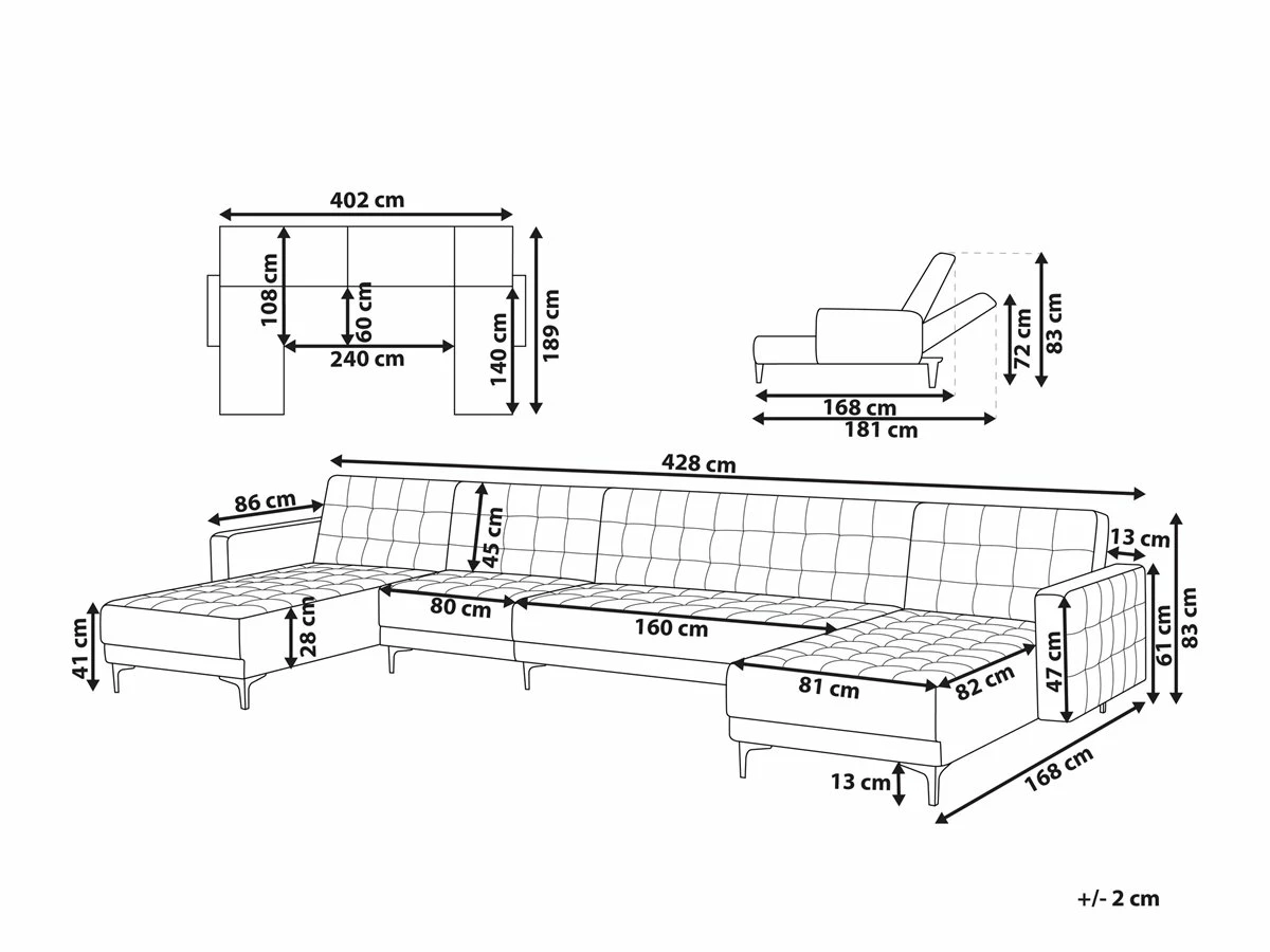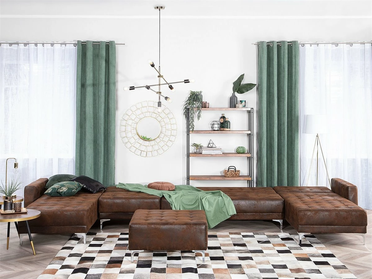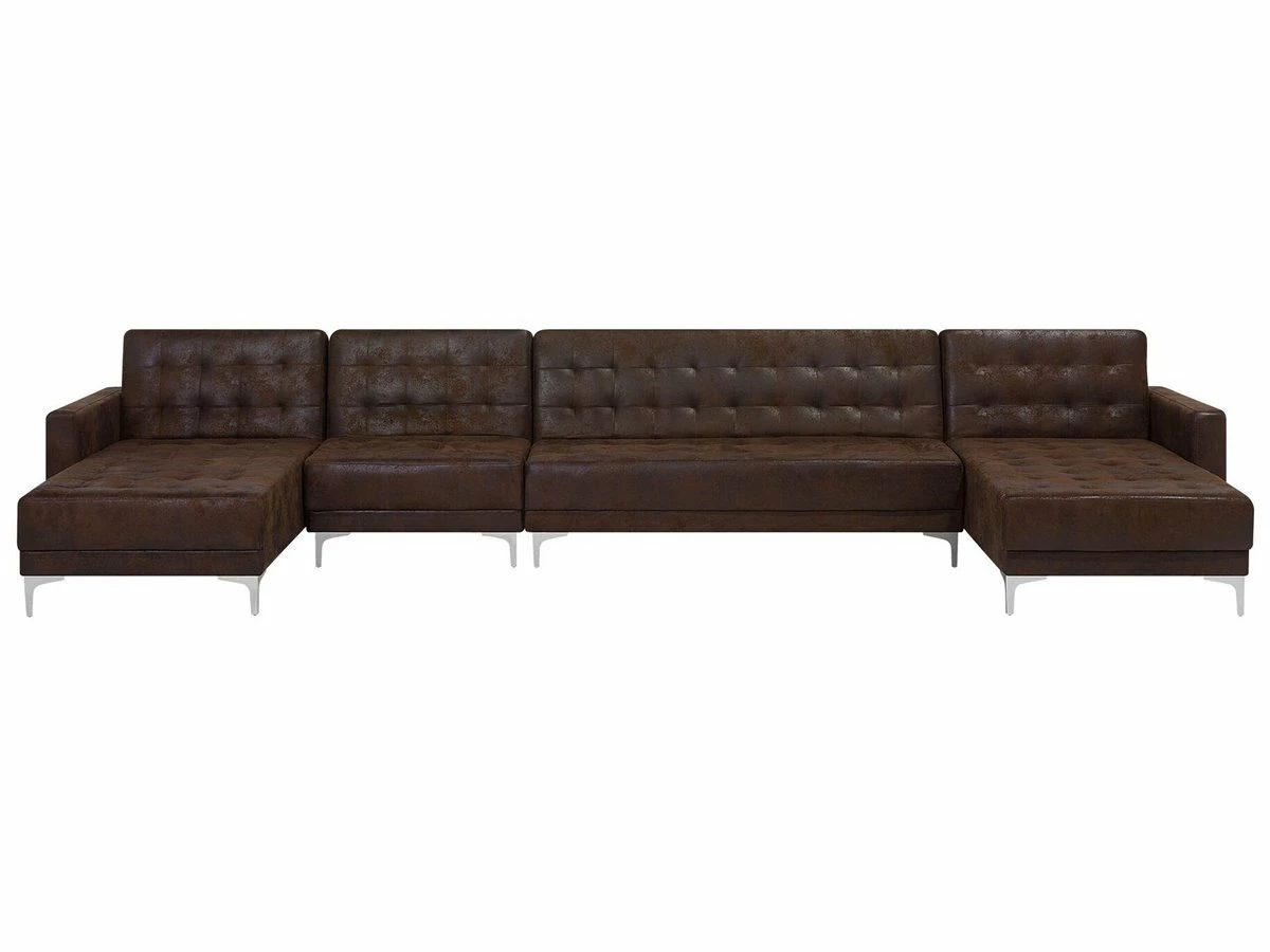 Elegante sofá XXL en color marrón. Añade a tu sala de estar este sofá de gran tamaño. El acabado se adapta a cualquier esquema de color. Las patas de metal ofrecen la máxima estabilidad. Fácilmente convertible en cama gracias a su respaldo regulable. Detalles: Tipo de Producto: Sofá cama Estilo: Moderno Color: Marrón Tonalidad: Marrón oscuro Tipo de material: Piel sintética Material principal: Piel sintética Material adicional: Metal Material del relleno: Espuma Composición del Material: 100% Poliéster Forma: Forma de U Estilo del apoyabrazo: Estrecho Parte posterior tapizada: Sí Protectores para patas: Sí Piezas modulares: Sí Orientación: Universal Reclinable: No Fundas de cojín extraíble: No Construcción del asiento: Muelles ondulados Densidad de espuma del asiento: 50 kg/m3 Asientos para: 4 – 6 personas Función para dormir: Sí Mecanismo de abertura del sofa cama: Mecanismo click-clack Dimensiones: Altura del apoyabrazos: 61 cm Profundidad: 168 cm Espesor del asiento: 20 cm Altura del asiento: 41 cm Ancho: 428 cm Altura: 83 cm Superficie del asiento: 402×60 cm Superficie para dormir: 402×108 cm Peso: 129 kg Capacidad de peso por persona: 150 kg La oferta incluye: 1 x Sofá de 3 plazas, 2 x Chaise longue, 1 x Módulo central Ventajas: Se convierte en cómoda cama, Se puede combinar con otros elementos modulares de la colección, Respaldo ajustable en 3 posiciones, Brinda comodidad y relajación, Confort del asiento óptimo, Diseño elegante, Con un clásico mechón decorativo, Tapicería de piel sintética de alta calidad para un aspecto natural Información de montaje: Requiere montaje parcial. Más de 60 min. Información adicional: Para un uso seguro, debe haber un espacio de ~15 cm entre el respaldo y la pared. Consejos de mantenimiento: Piel sintética: 1.Use solo limpiadores suaves y acondicionadores dedicados a la piel sintética, 2.Limpie con agua destilada y use limpiadores a base de jabón en las manchas difíciles 3.Aspire con un accesorio adecuado 4.Una vez a la semana, limpie con un paño húmedo y seque después. No engrasar Metal: 1.Para evitar arañazos, no use limpiadores abrasivos 2.Limpie con un limpiador y un paño suave, seque después 3.Para elementos de cobre o cromados, use agente abrillantador.